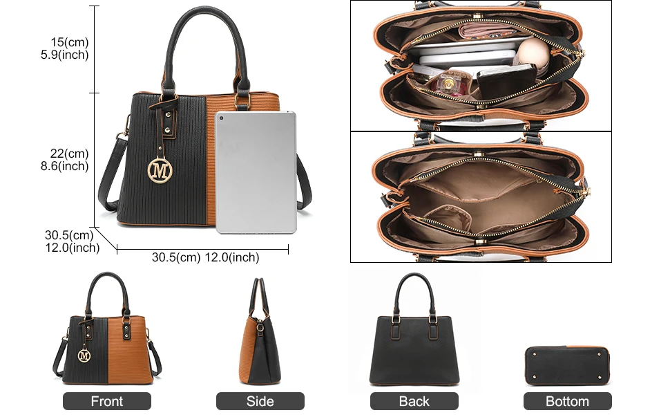 La borsa offre 3 maestri, una borsa interna con cerniera e 2 ventole aperte per un accesso rapido ai biglietti o dei passaggi.All’interno c’è 3 tasche aggiuntive (2 tasche laterali e 1 borsa con cerniera).Questa borsa fornisce un spazio ecologico per un iPad da 9,7 pollici, ombrellone, borsetta, bottiglia d’acqua, iPhone e cosmetici.