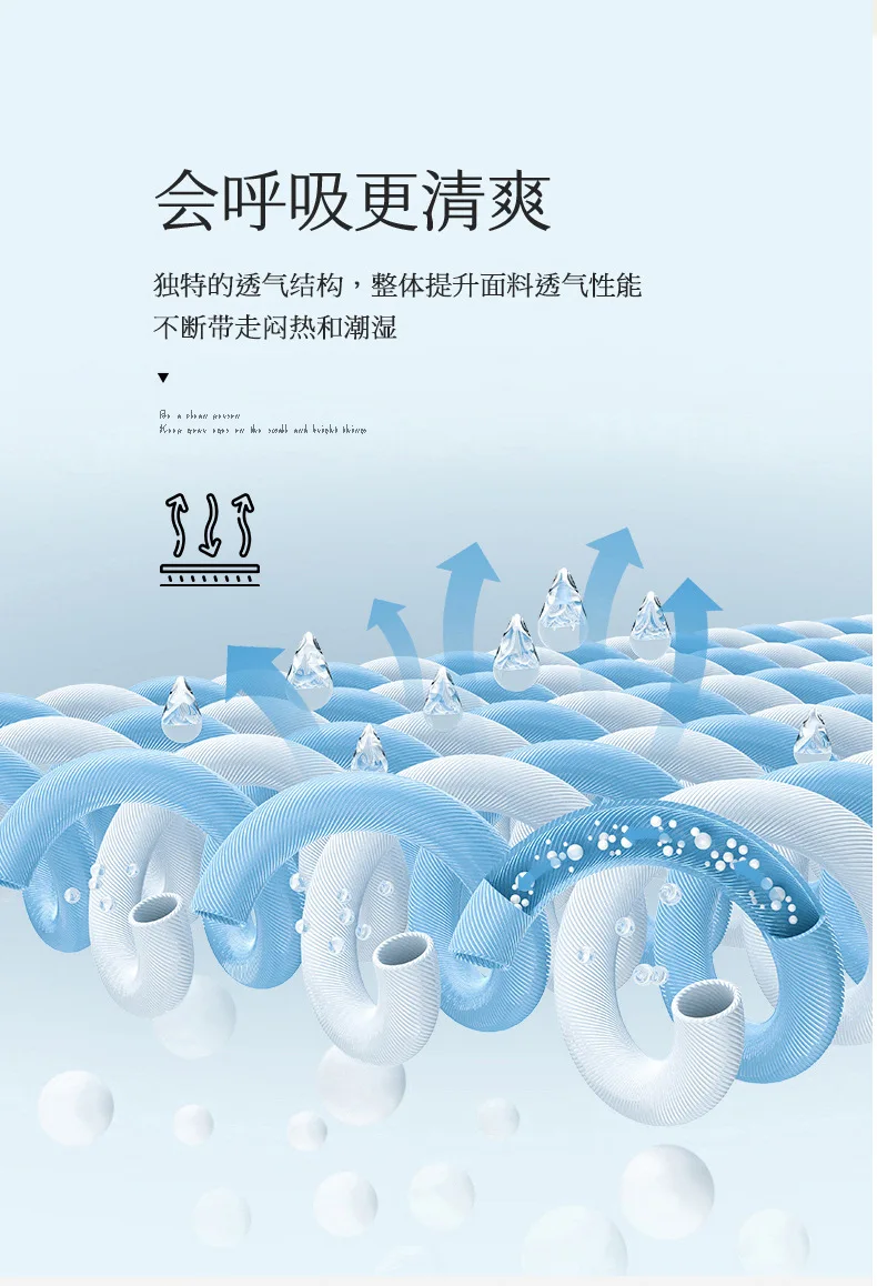 The fabric is moisture absorbing and breathable, with a double stranded weaving method and a deep knit pattern that absorbs sweat and does not stick to the body. It can be used all year round