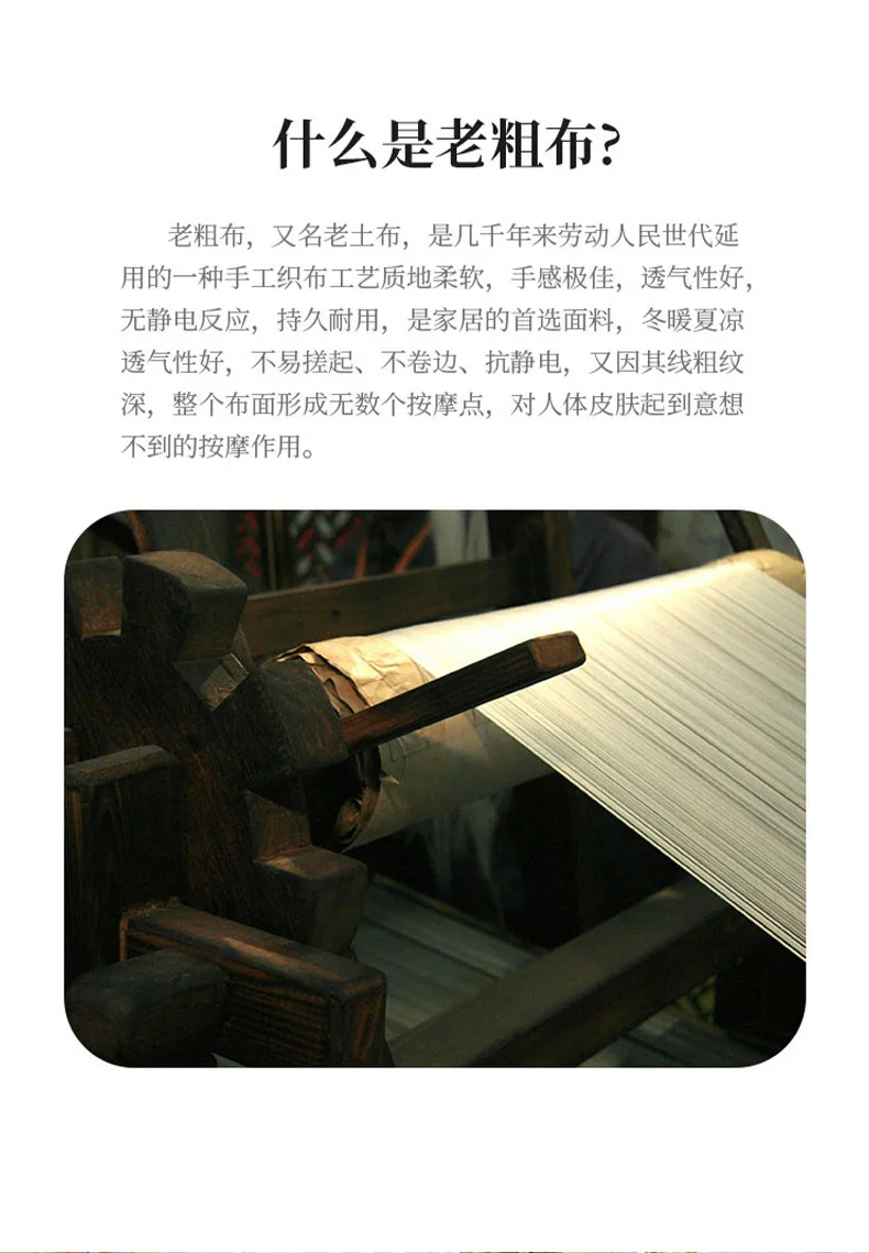 Vecchio panno grossolano, anche noto come tessuto della terra antica, è una tecnica di tessitura fatta a mano che è stata utilizzata da persone lavorate per le migliaia di anni.Ha una consistenza morbida, un’eccellente sensazione alle mani, una buona traspirabilità, nessuna reazione di elettricità statica e è durevole.È il tessuto preferito per uso domestico.È caldo in inverno e fresco in estate, ha una buona traspirabilità, non è facile da strofinare, non arricciare i bordi e è antistatico.Divieto alle sue linee spesse e profonde, l’intera superficie del tessuto forme senza punti di massaggio, che hanno un effetto massaggio non spettato sulla pelle umana.