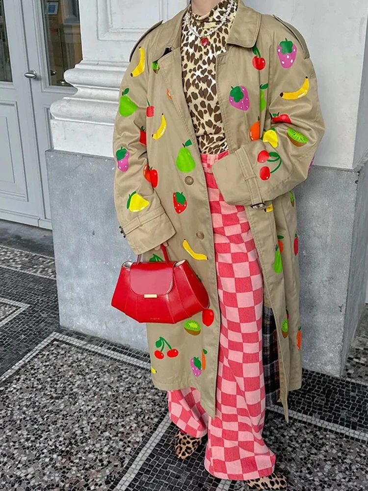 Giacca lunga autunno inverno Trench a maniche lunghe con stampa di frutta Design di nicchia Cappotto caldo con bottoni 2025 Capispalla da donna High Street