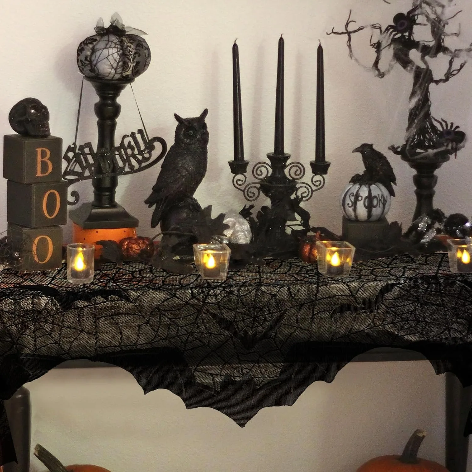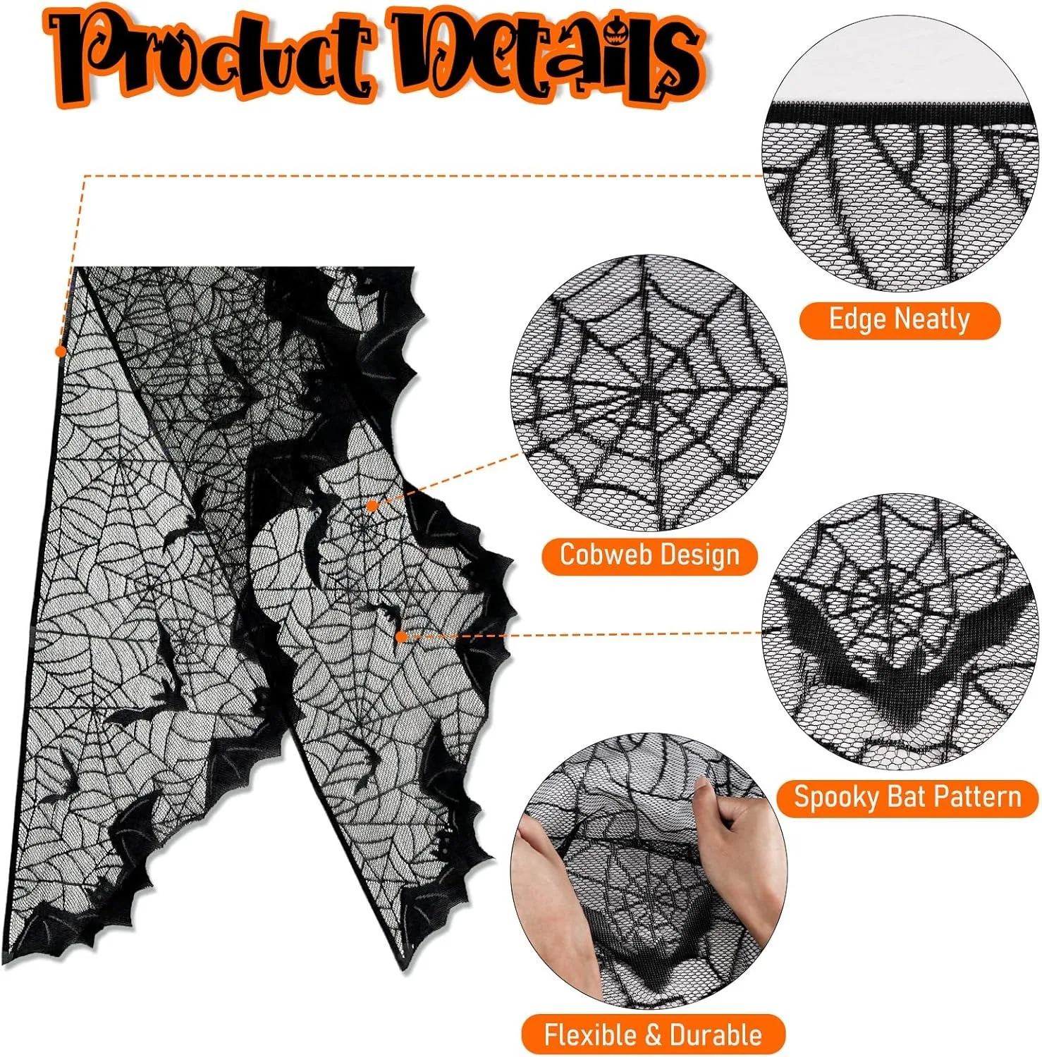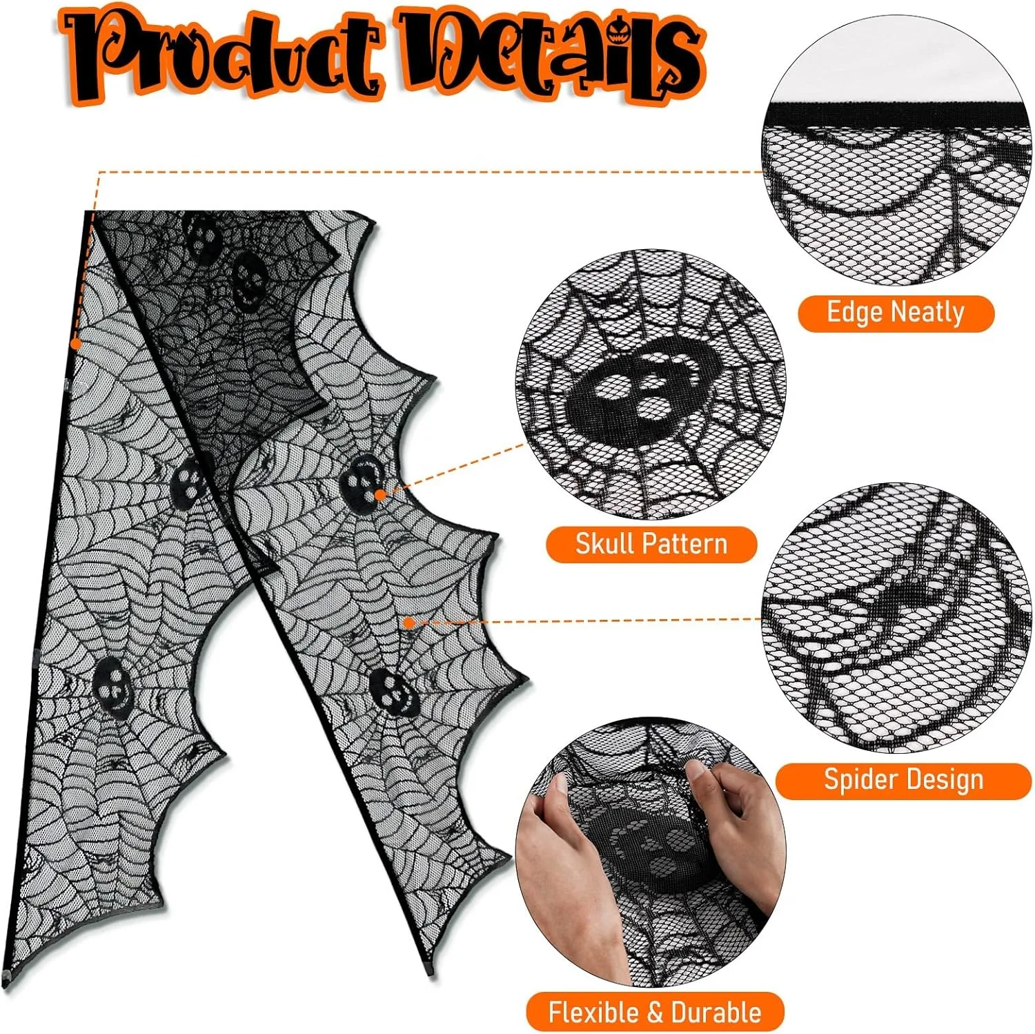 2.Costo efficace: sciarpa con mantello da camino in pizzo nero da 18 x 96 pollici e qualità di prima classe, decorazioni perfette per il tuo Halloween.