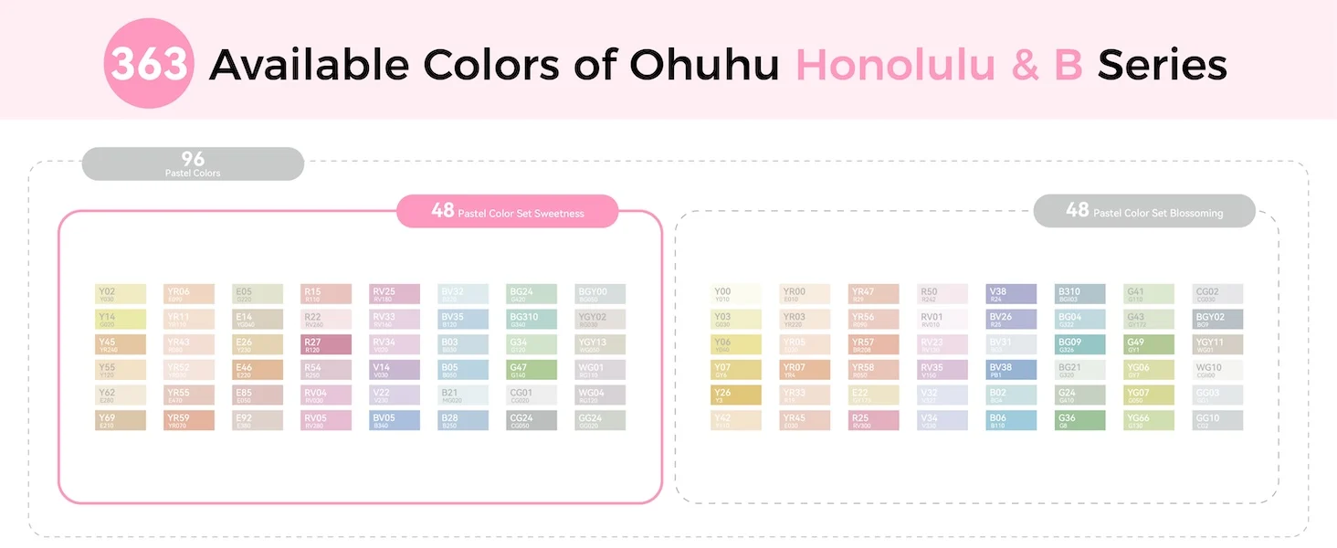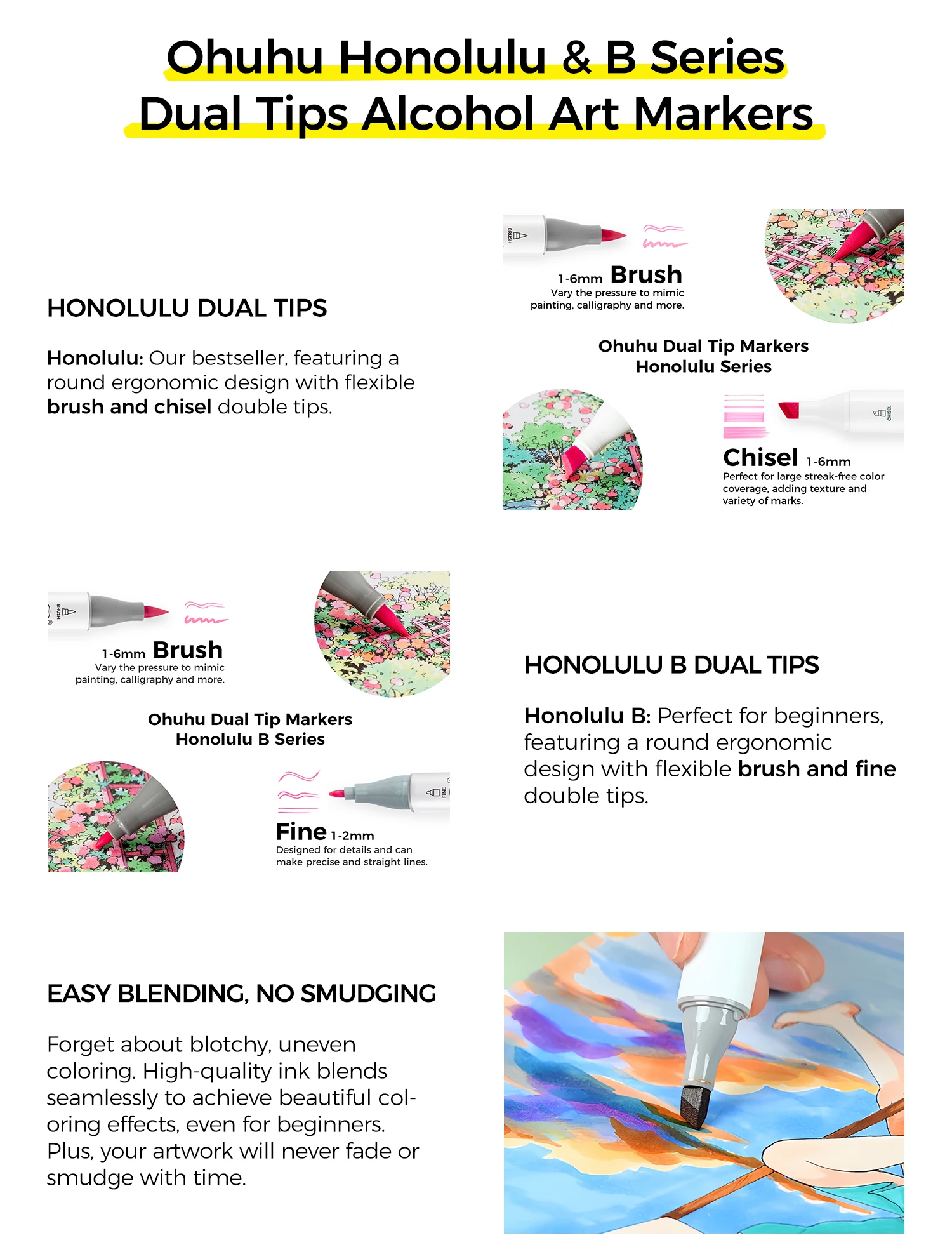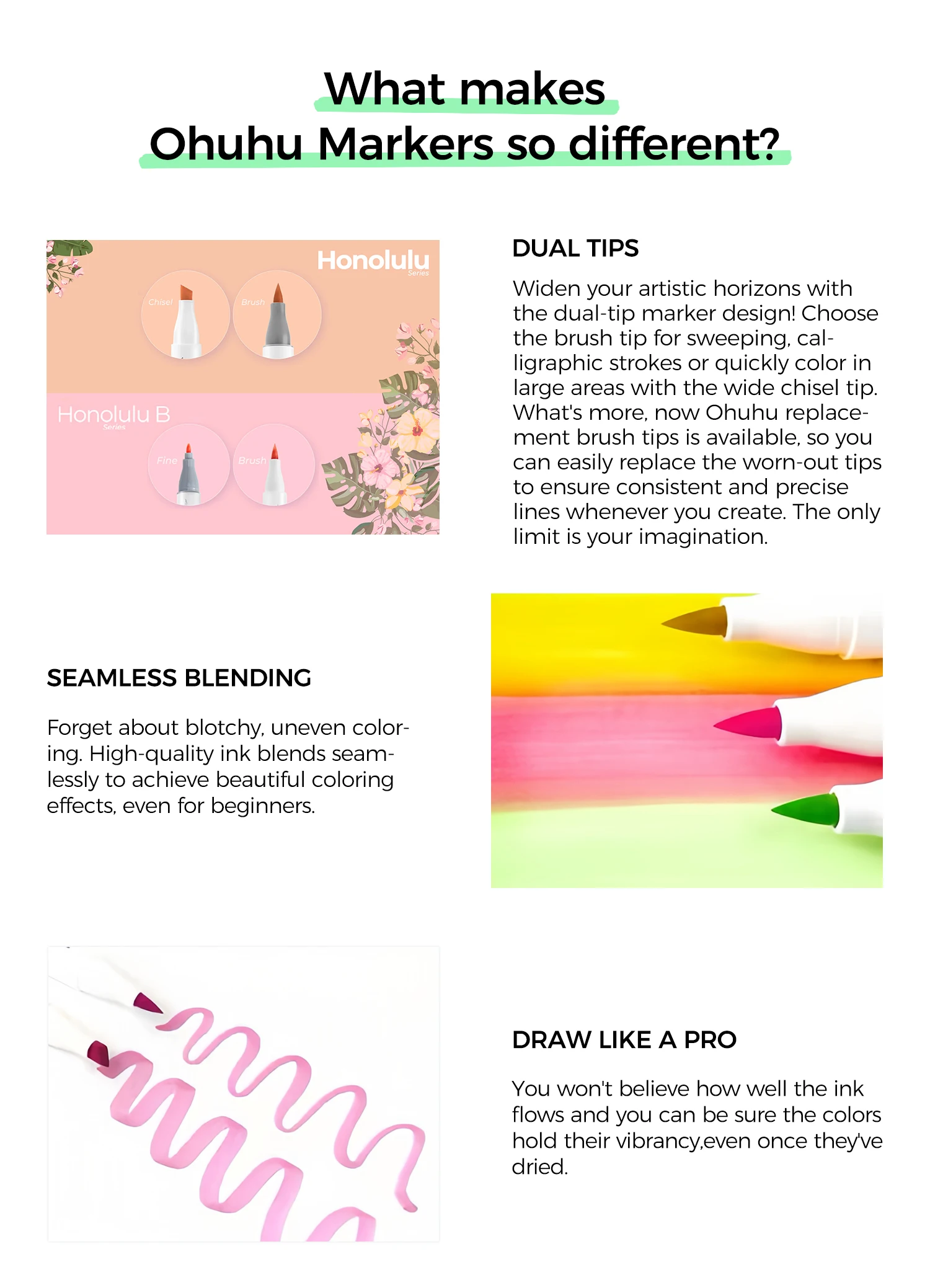 Con 51 colori popolari Ohuhu disponibili per le ricariche ora e altro ancora in viaggio, la tua creatività non conosce limiti.Goditi un’ampia gamma di tonalità e mantieni i tuoi pennarelli per gli anni a venire.Che tu stia esplorando i colori intensi di Honolulu, Oahu, Kaala o le tonalità audaci della serie Molokai, sono ora ricaricabili.Passa da un set all’altro senza problemi e sblocca infinite possibilità artistiche