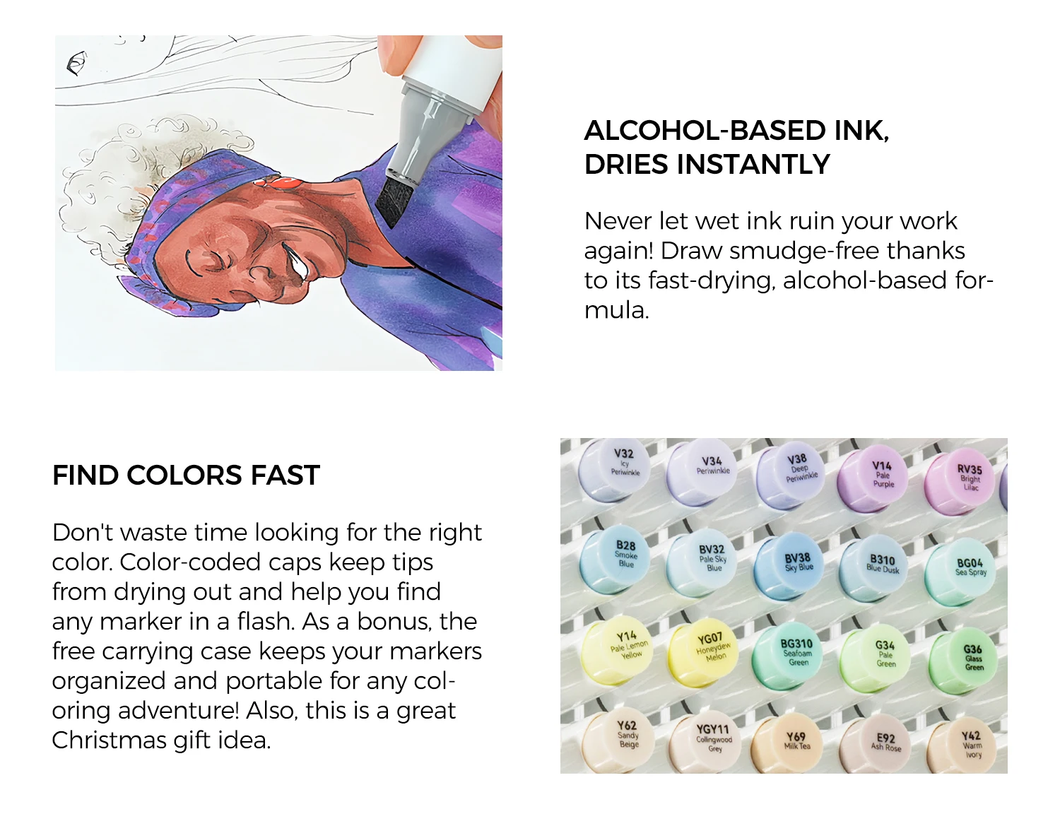Non perdere tempo a cercare il colore perfetto.I nostri pennarelli sono dotati di cappucci codificati a colori per mantenerti organizzato ed efficiente.Inoltre, la custodia da trasporto gratuita rende questi pennarelli perfetti per qualsiasi avventura colorante o come regalo premuroso per ogni artista