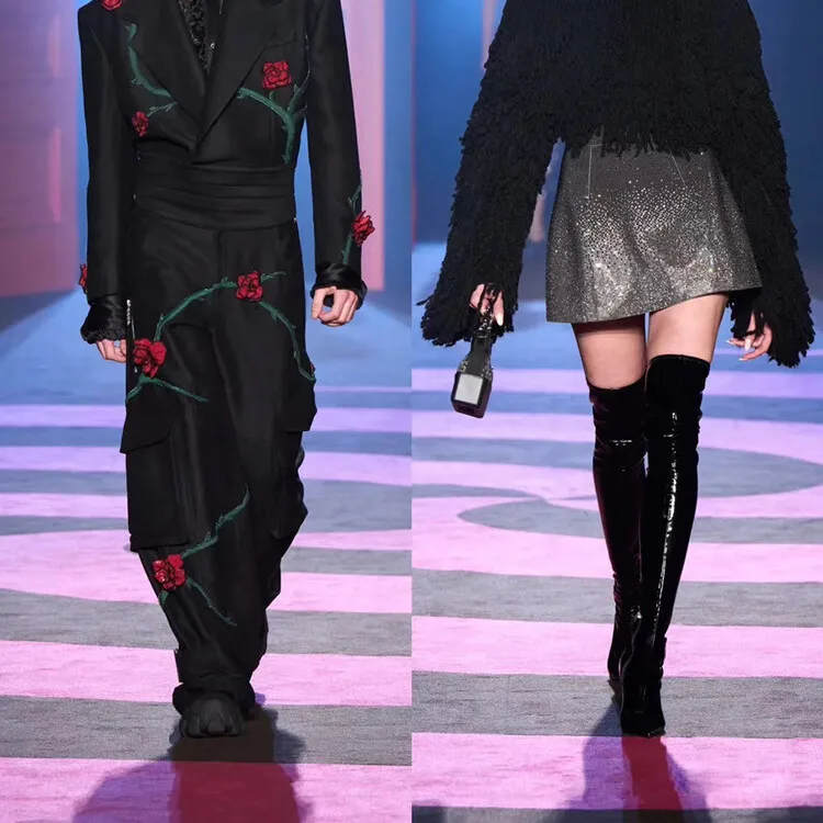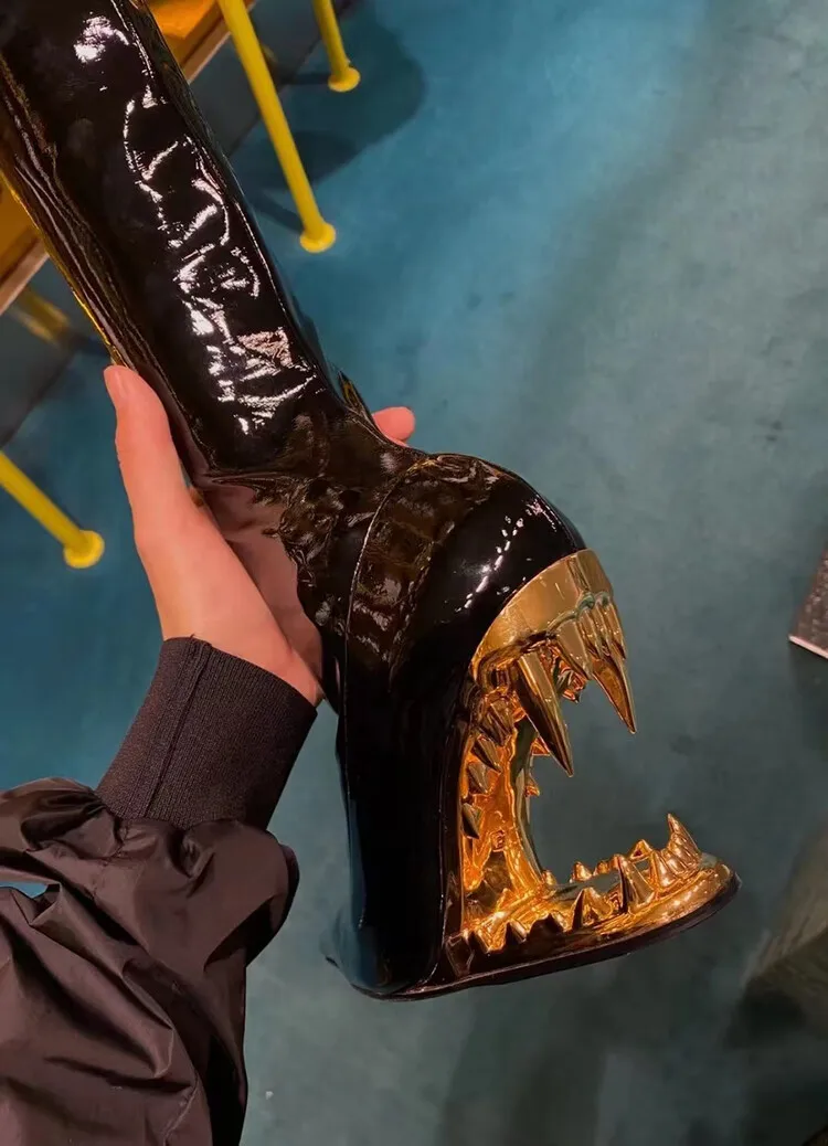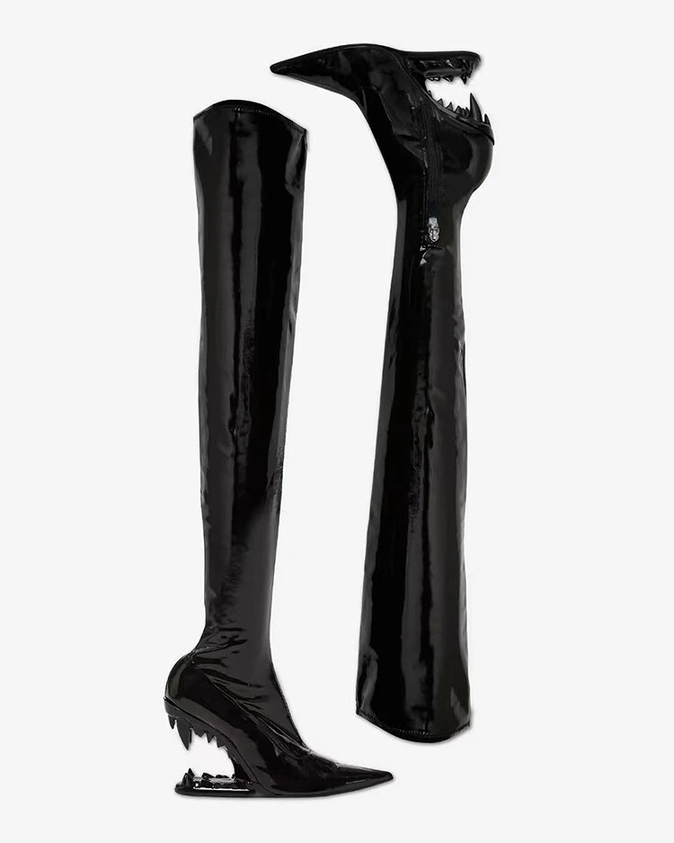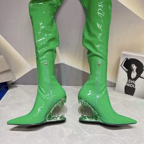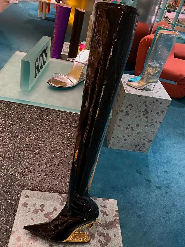Stivali elastici al ginocchio con tacco a denti di tigre a punta per donna, scarpe da spettacolo per banchetti europee e americane, moda autunno e inverno, 2023 1Stivali elastici al ginocchio con tacco a denti di tigre a punta per donna, scarpe da spettacolo per banchetti europee e americane, moda autunno e inverno, 2023