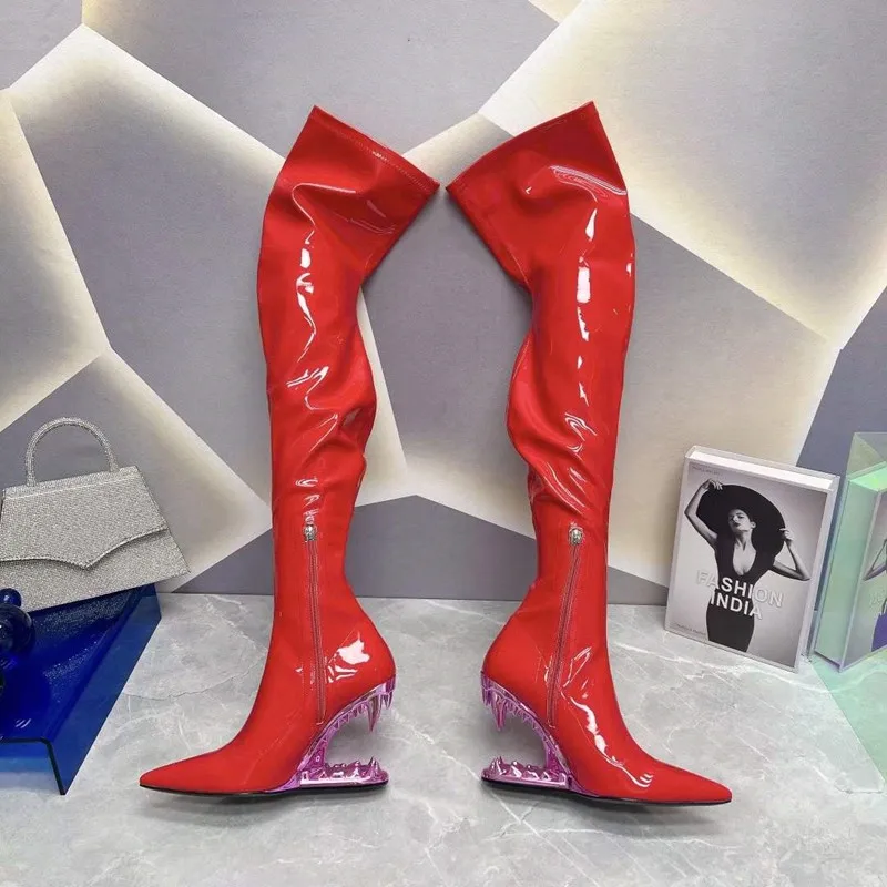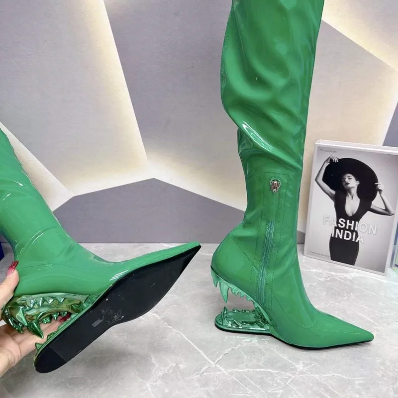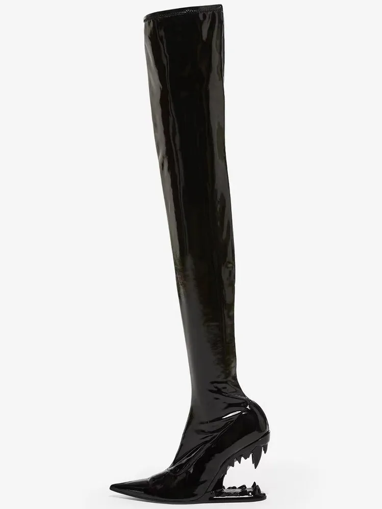 Stivali elastici al ginocchio con tacco a denti di tigre a punta per donna, scarpe da spettacolo per banchetti europee e americane, moda autunno e inverno, 2023