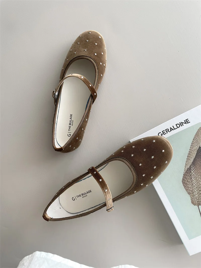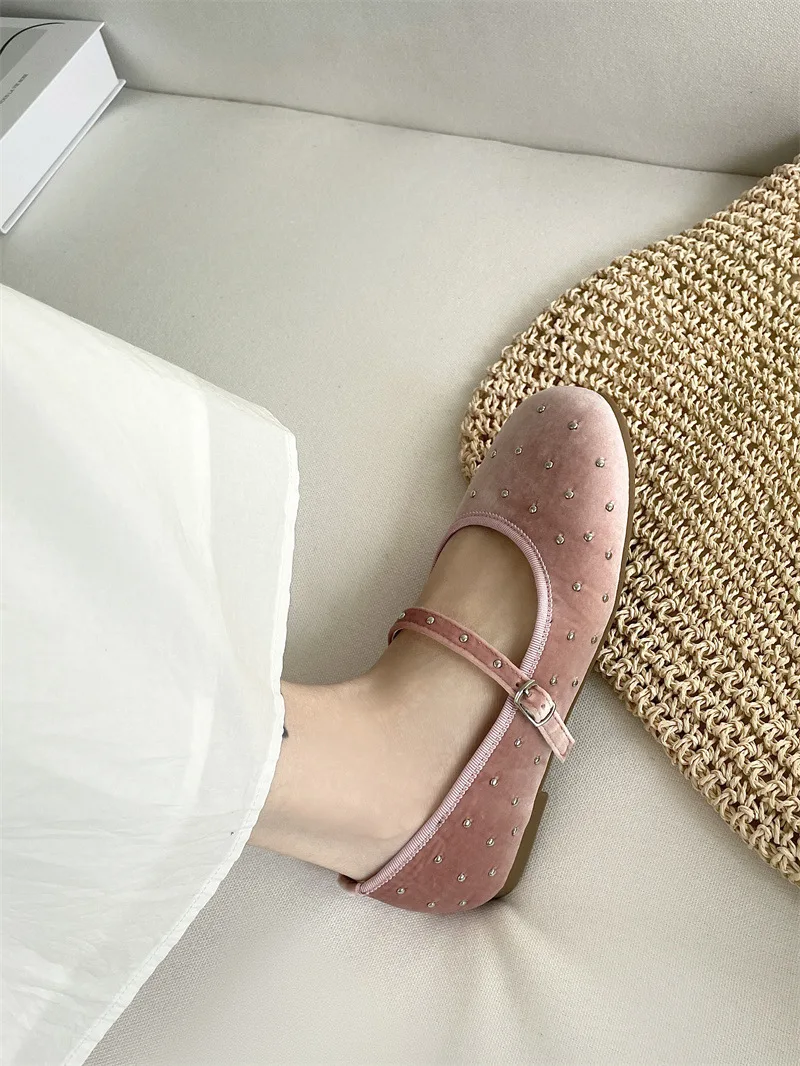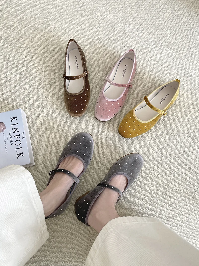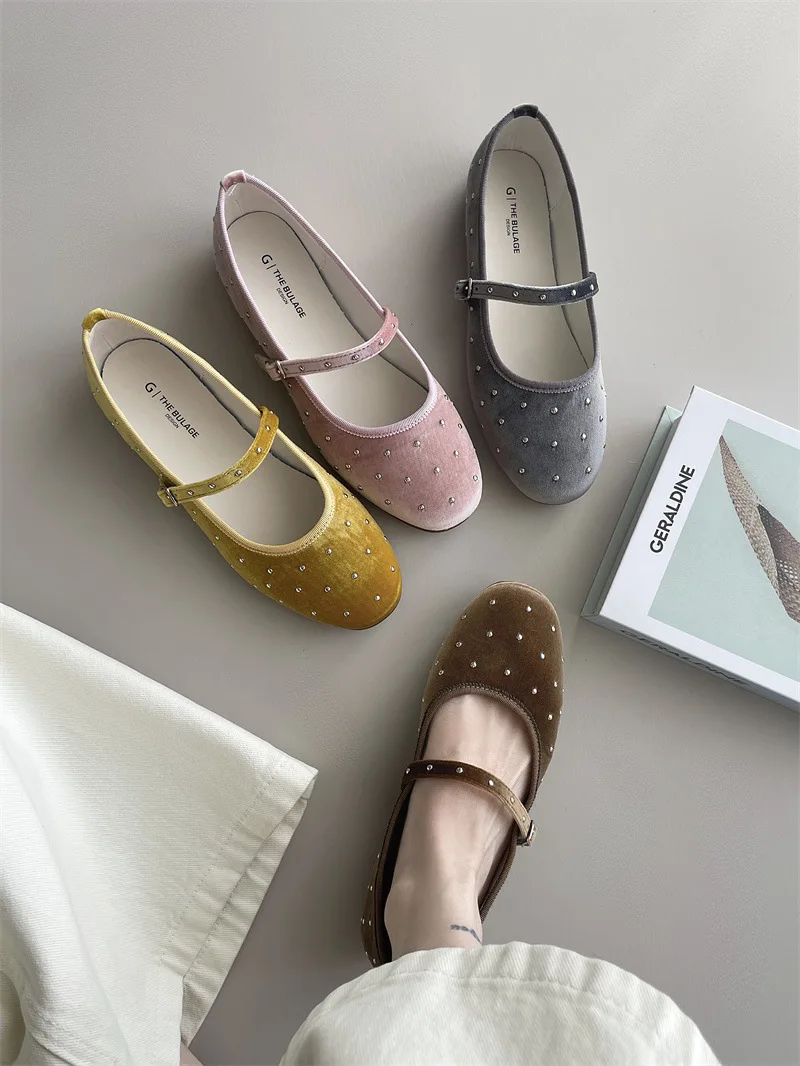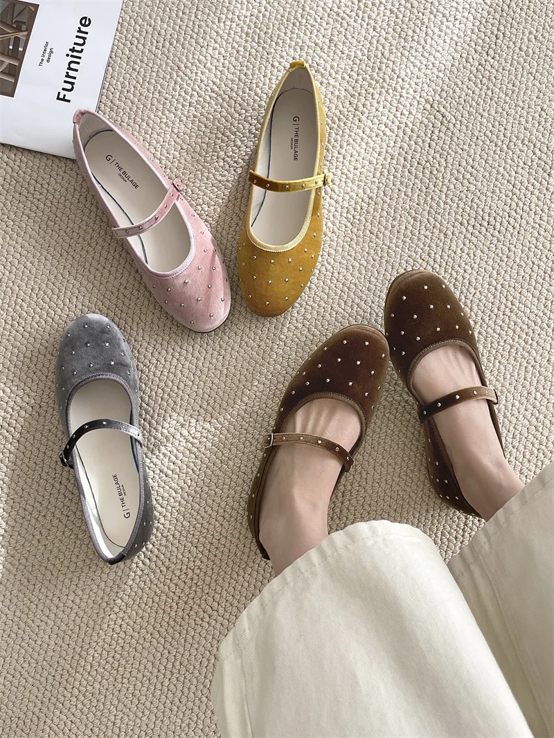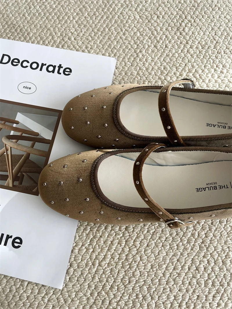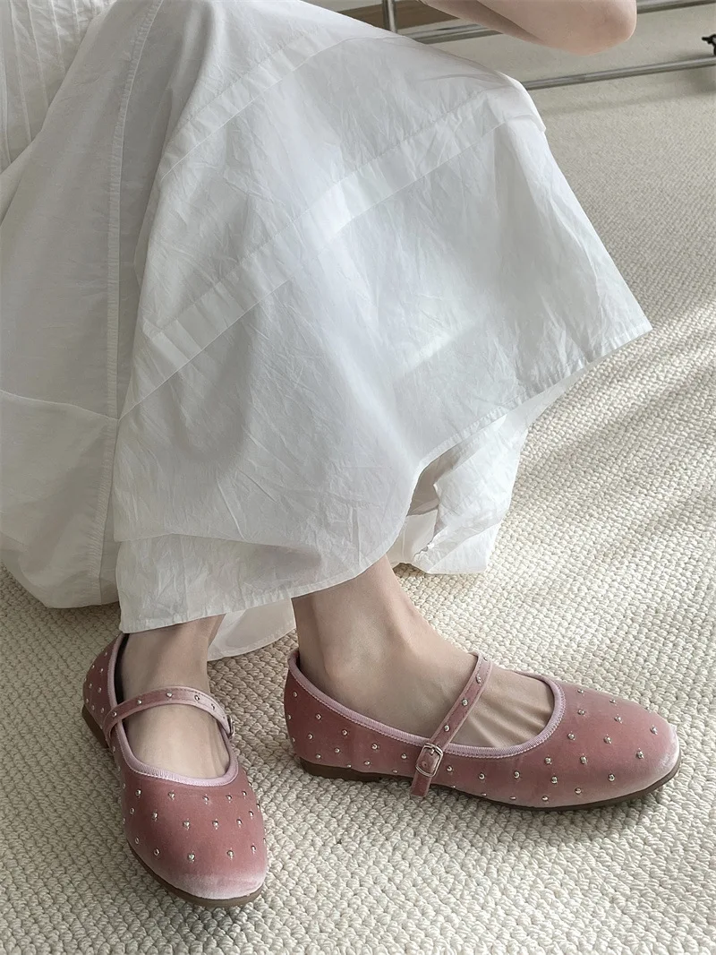 Rivetto Decor Velluto Mary Janes Scarpe da donna Punta tonda Eleganti ballerine Scarpe da donna Cinturino con fibbia Primavera Autunno Mocassini Nuovo