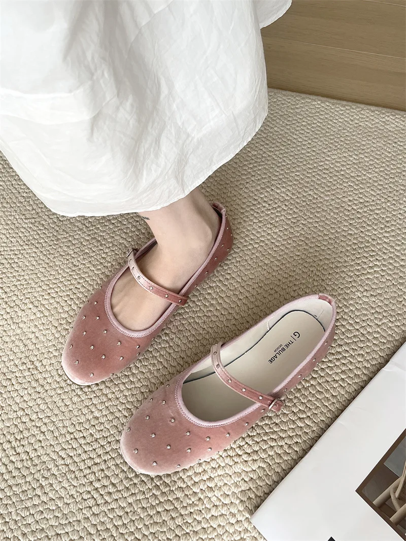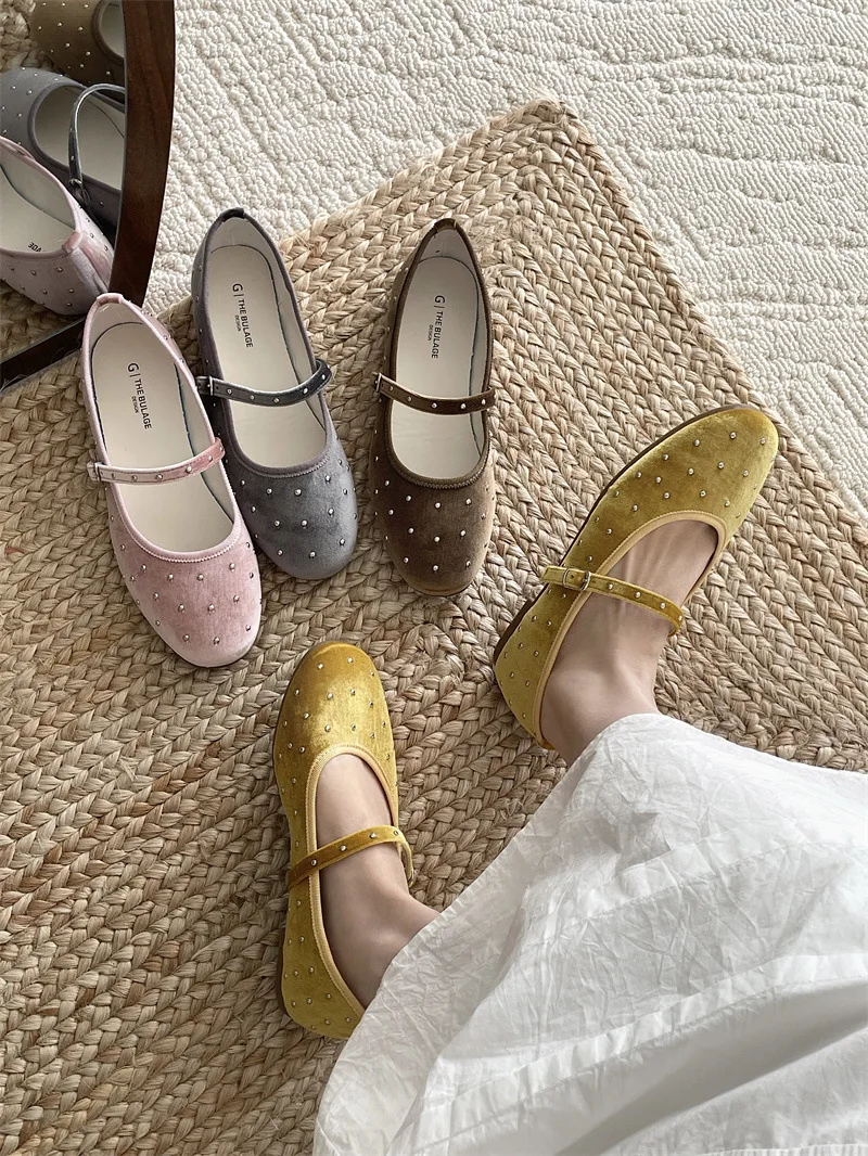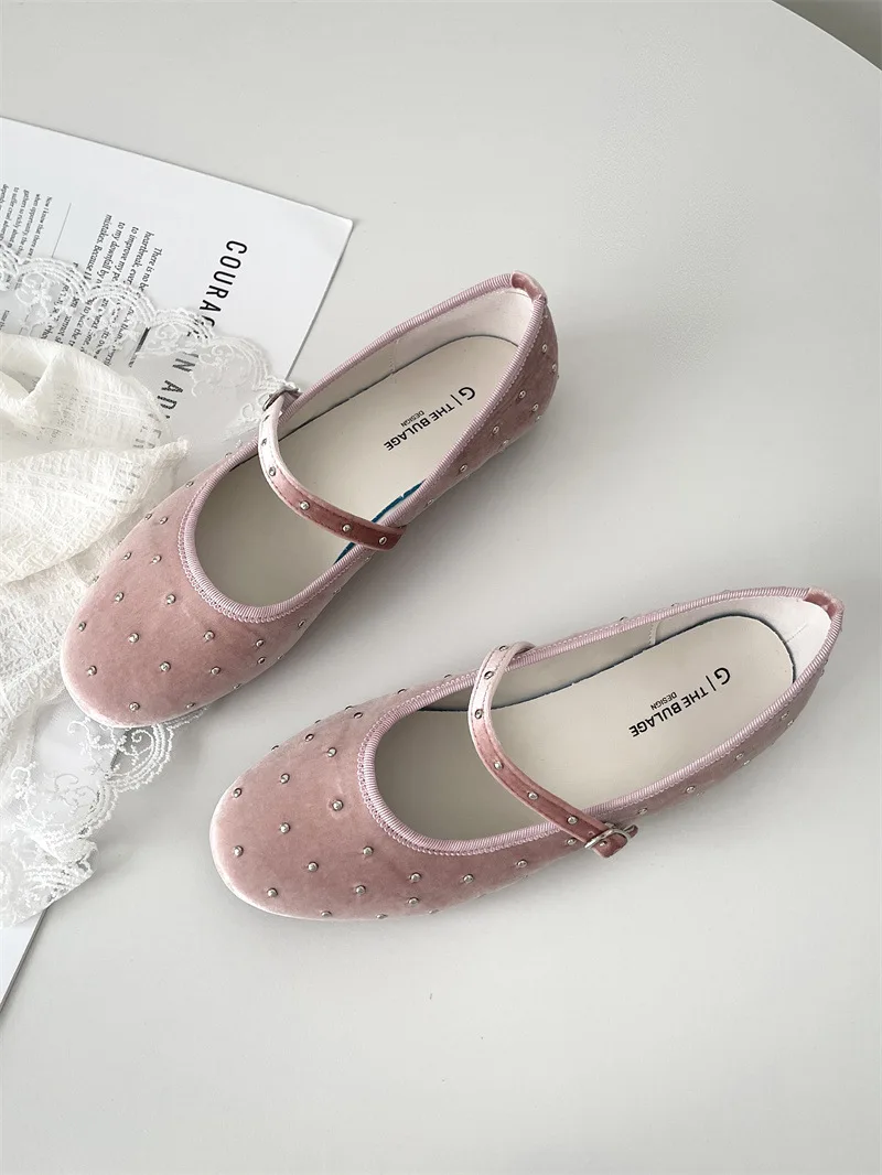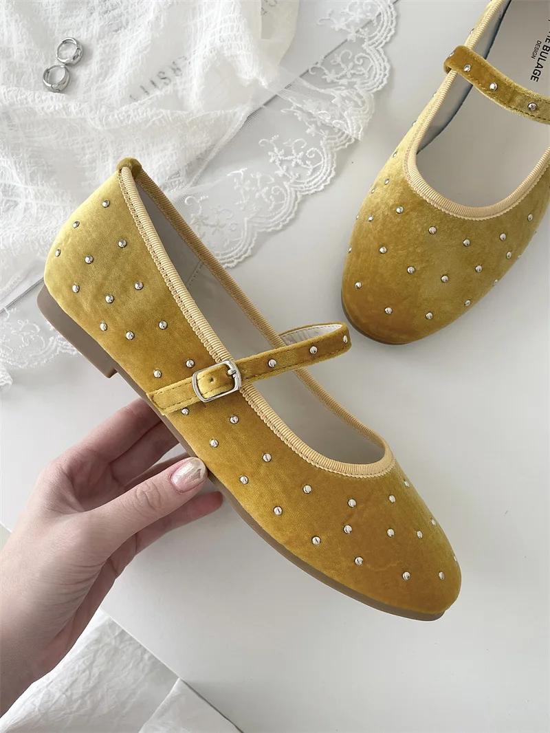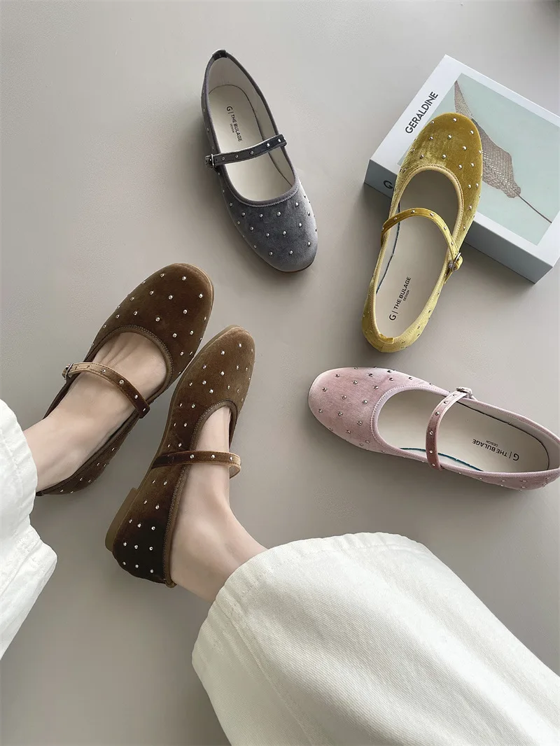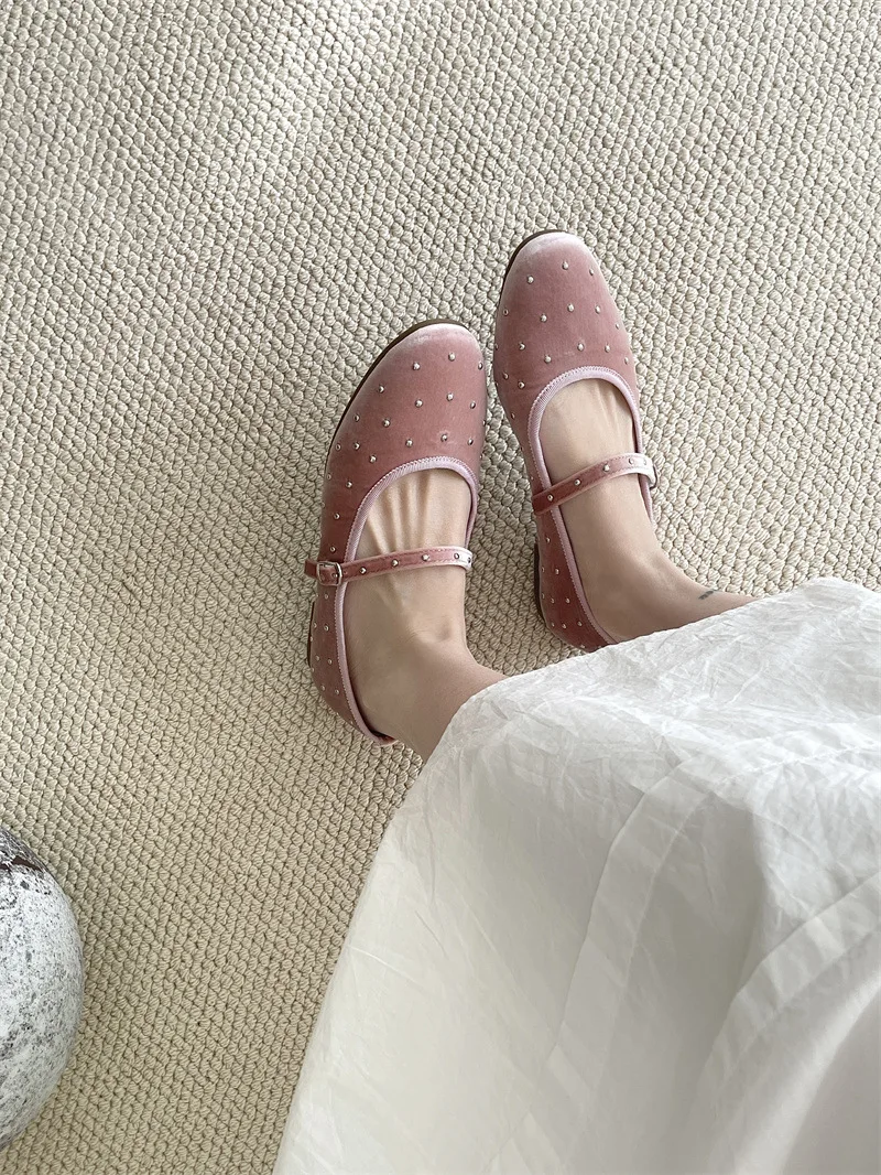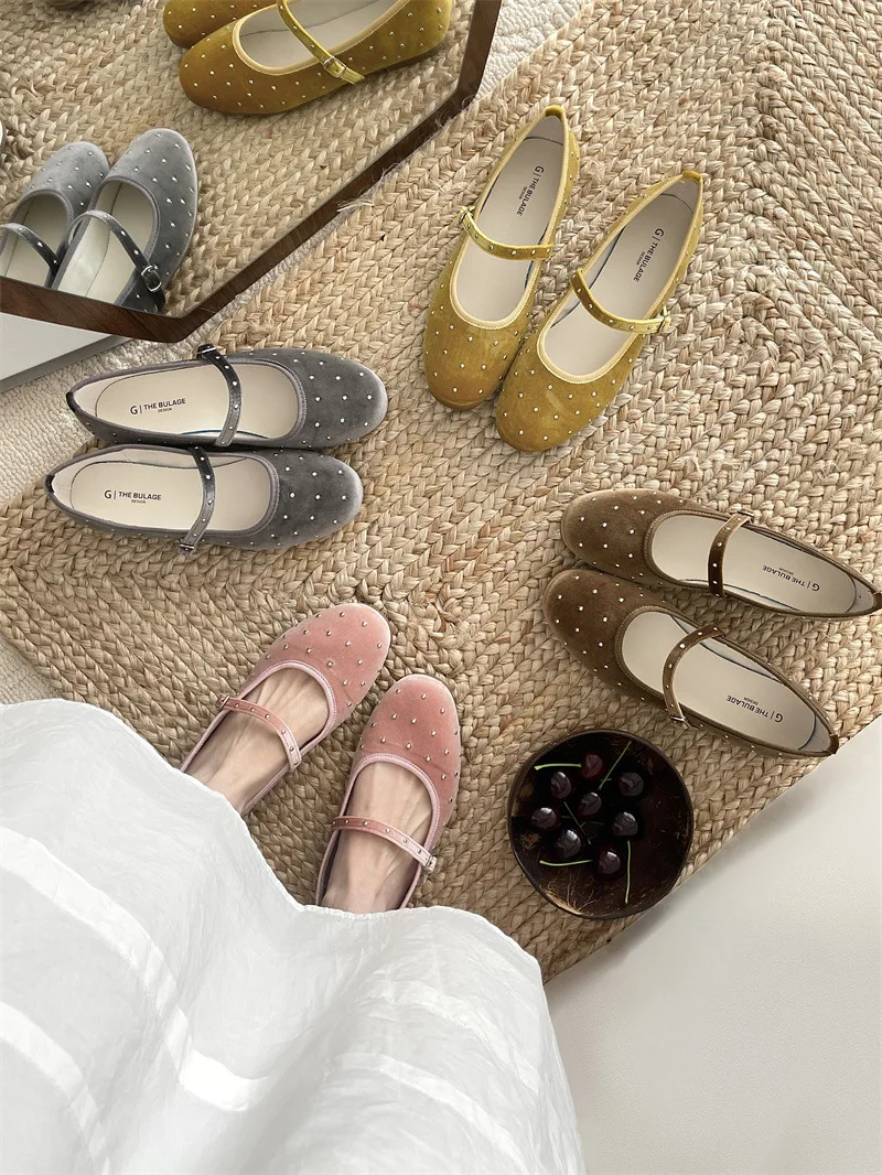 Rivetto Decor Velluto Mary Janes Scarpe da donna Punta tonda Eleganti ballerine Scarpe da donna Cinturino con fibbia Primavera Autunno Mocassini Nuovo