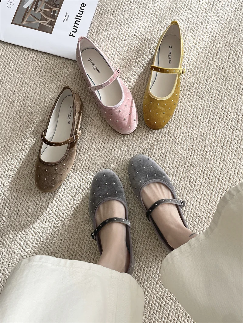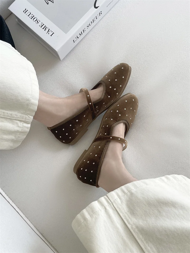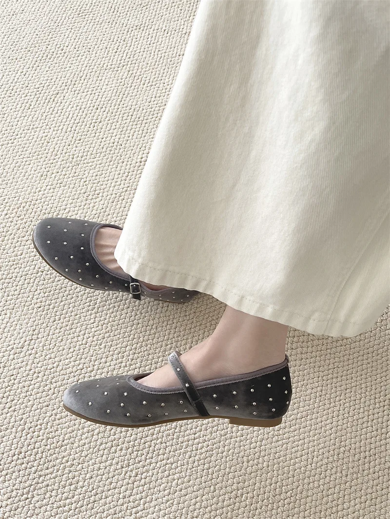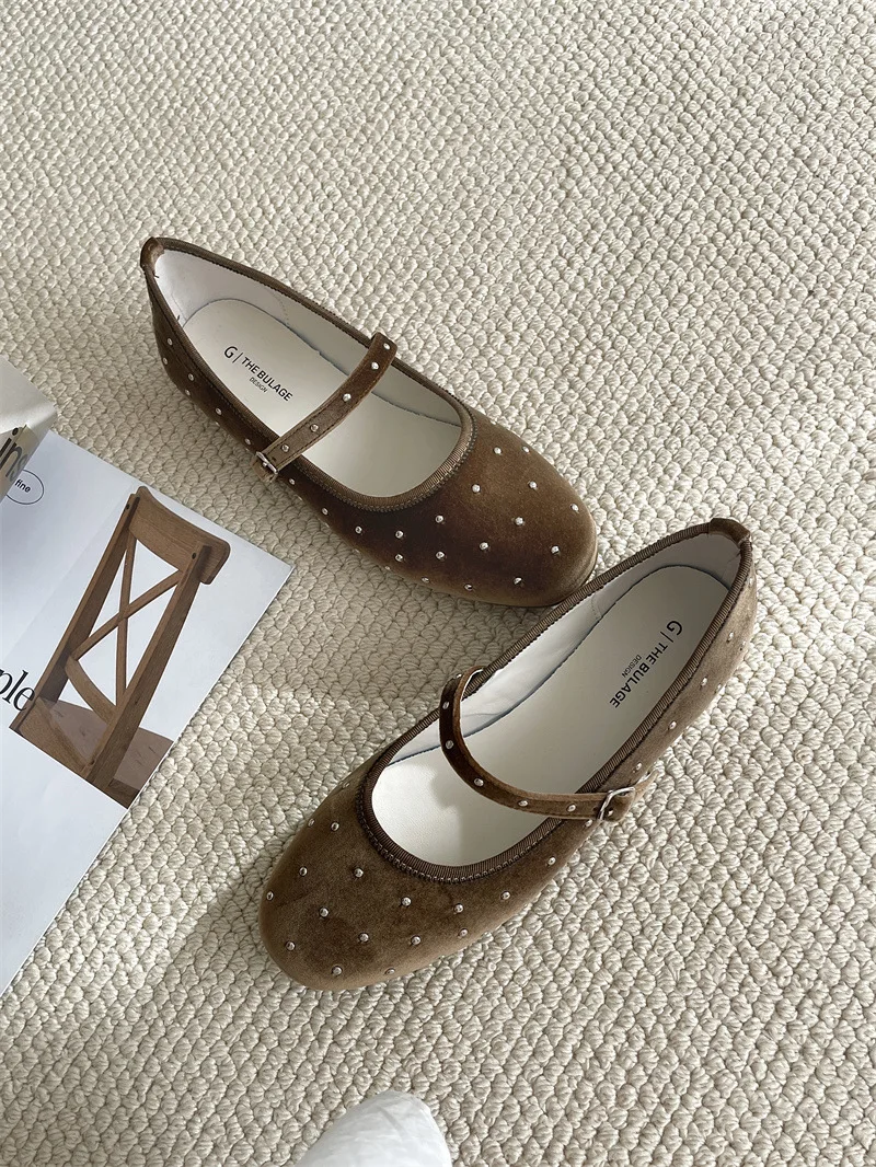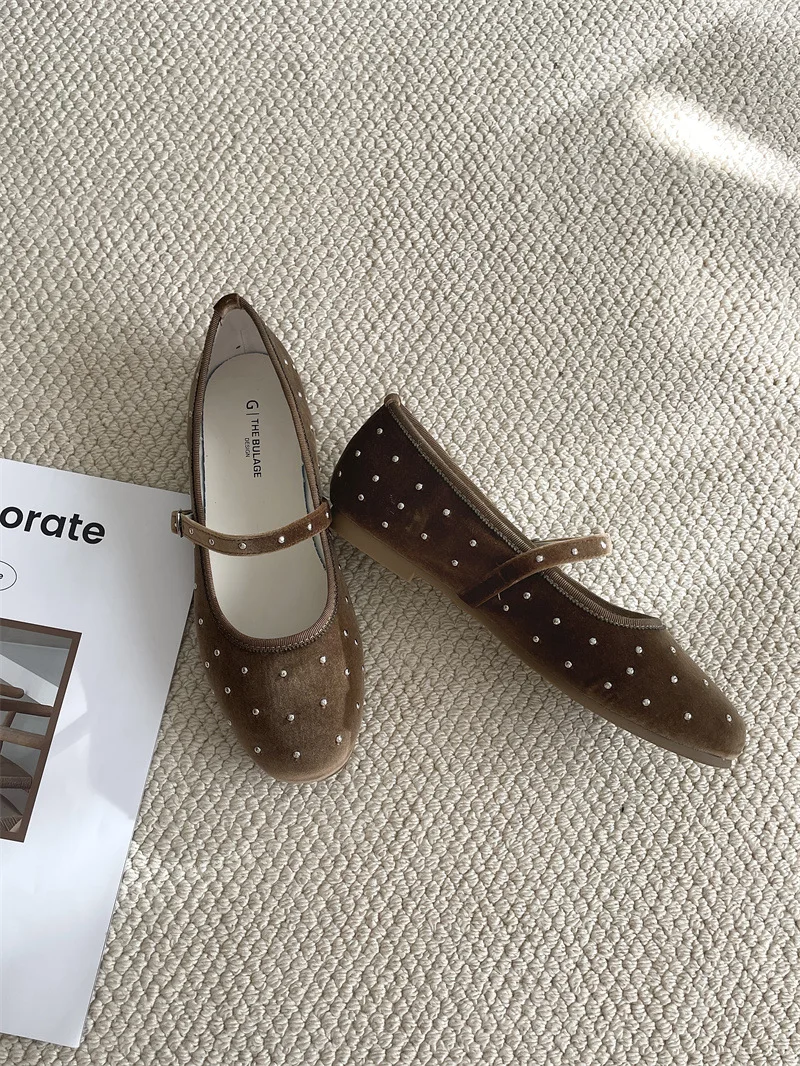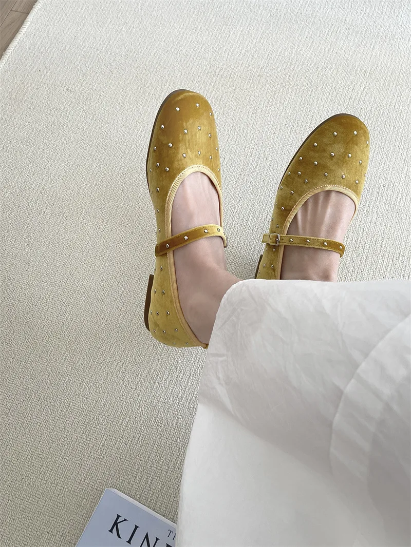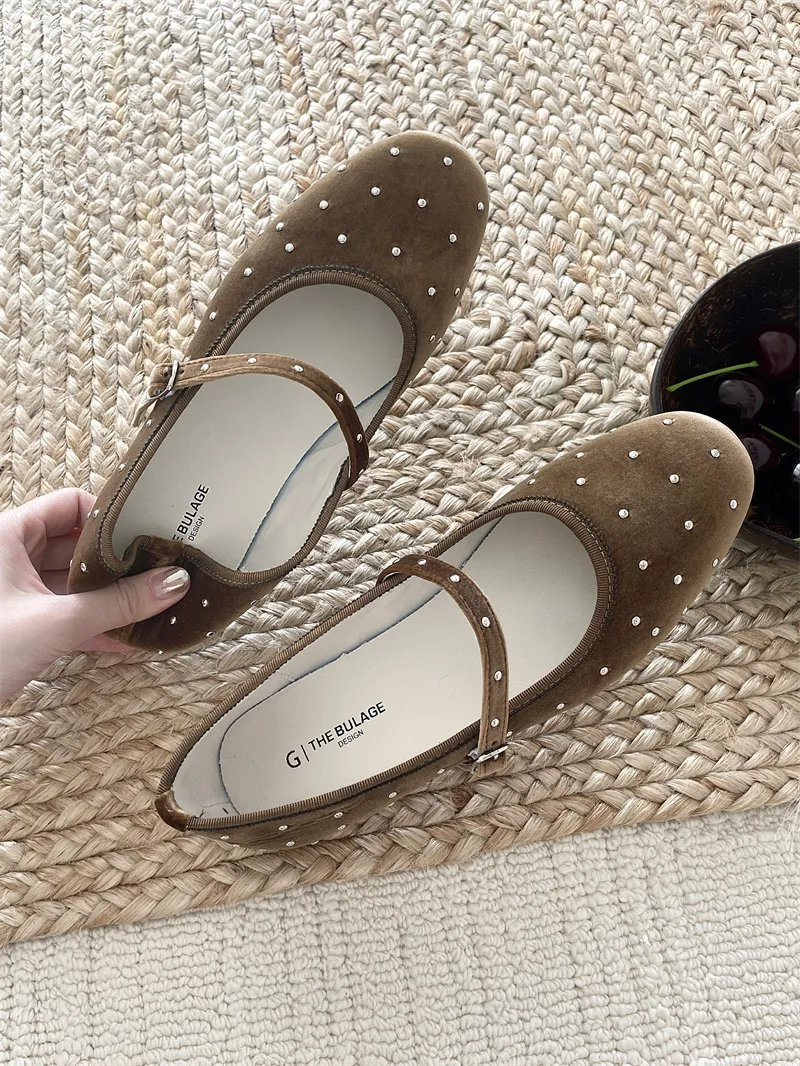 Rivetto Decor Velluto Mary Janes Scarpe da donna Punta tonda Eleganti ballerine Scarpe da donna Cinturino con fibbia Primavera Autunno Mocassini Nuovo