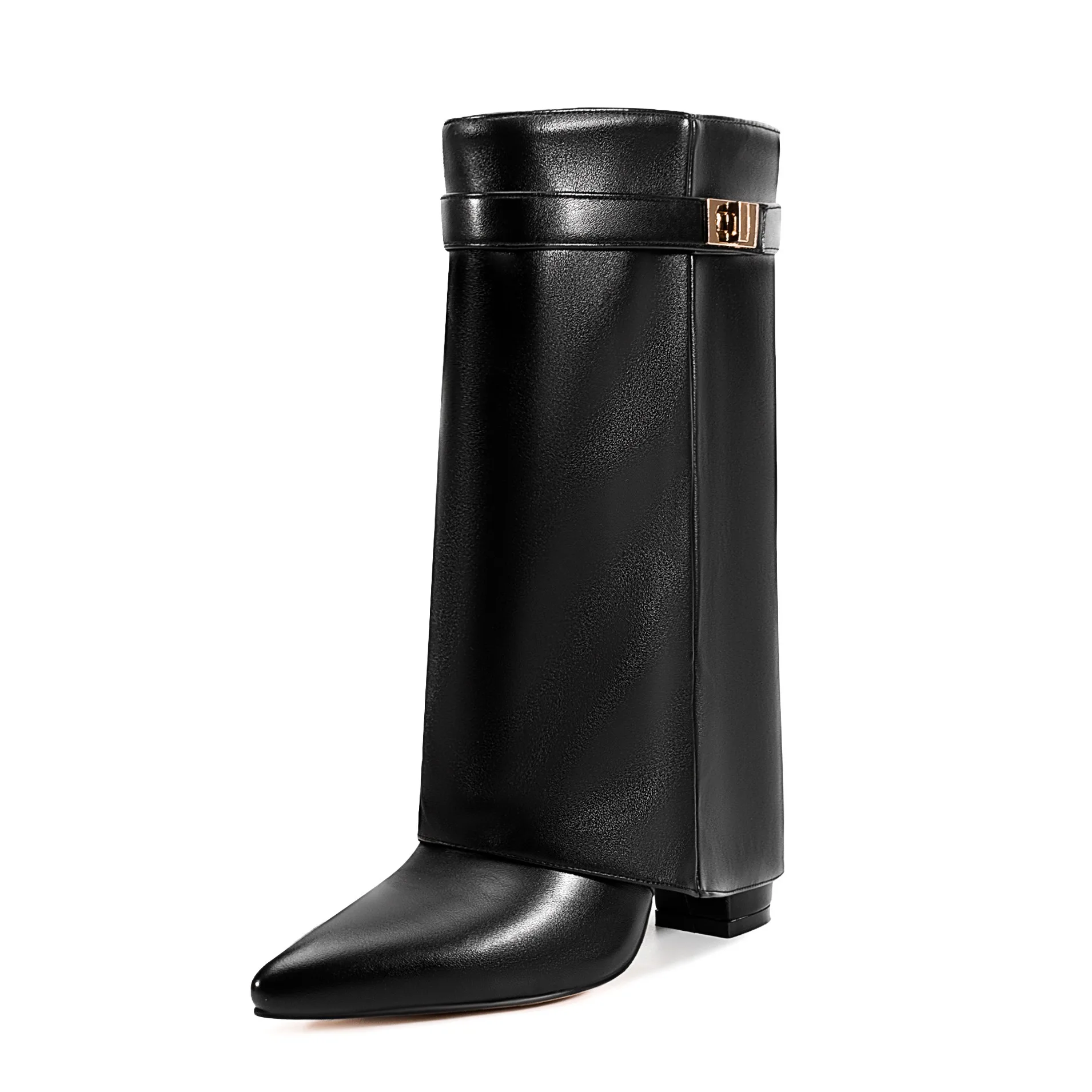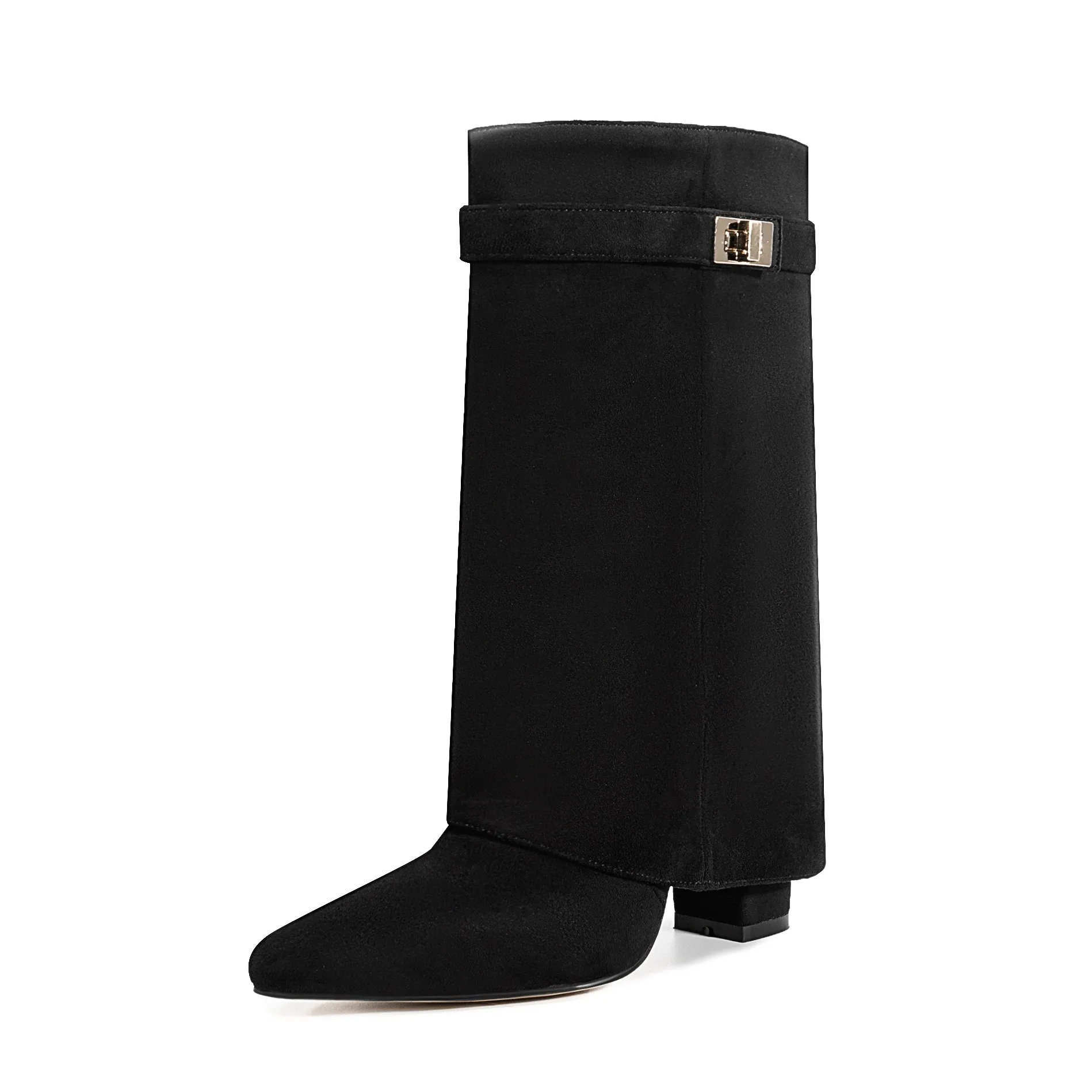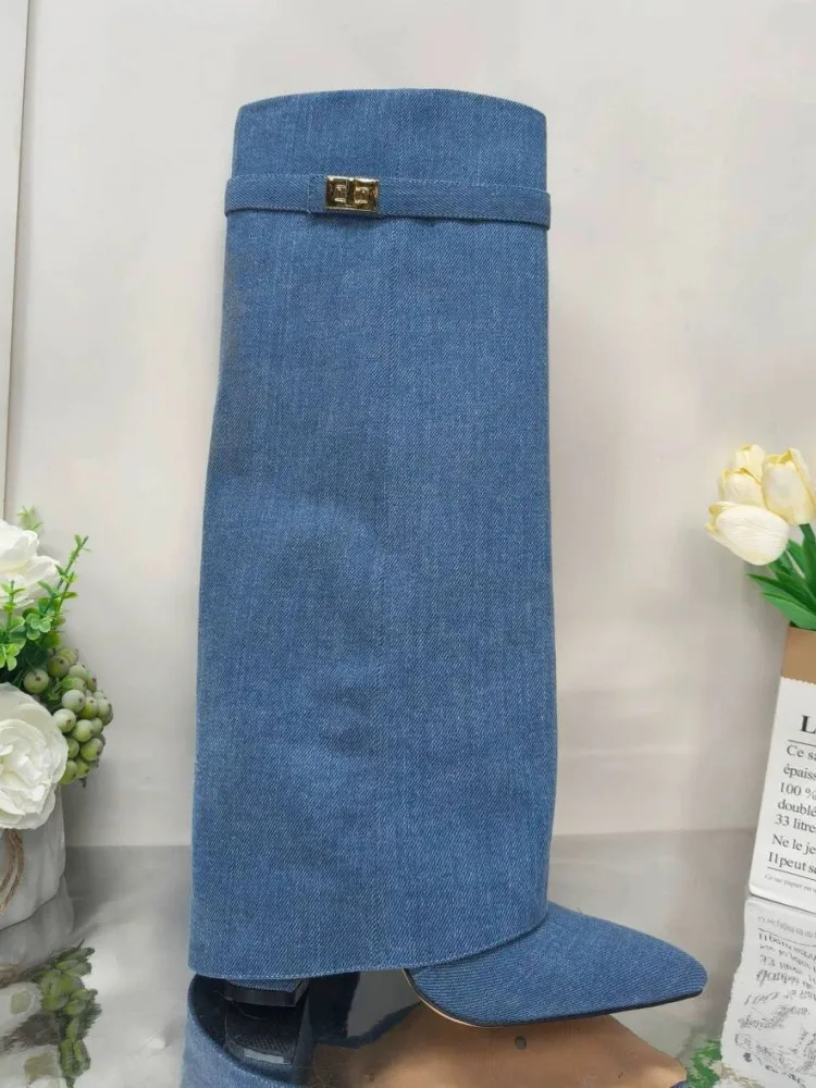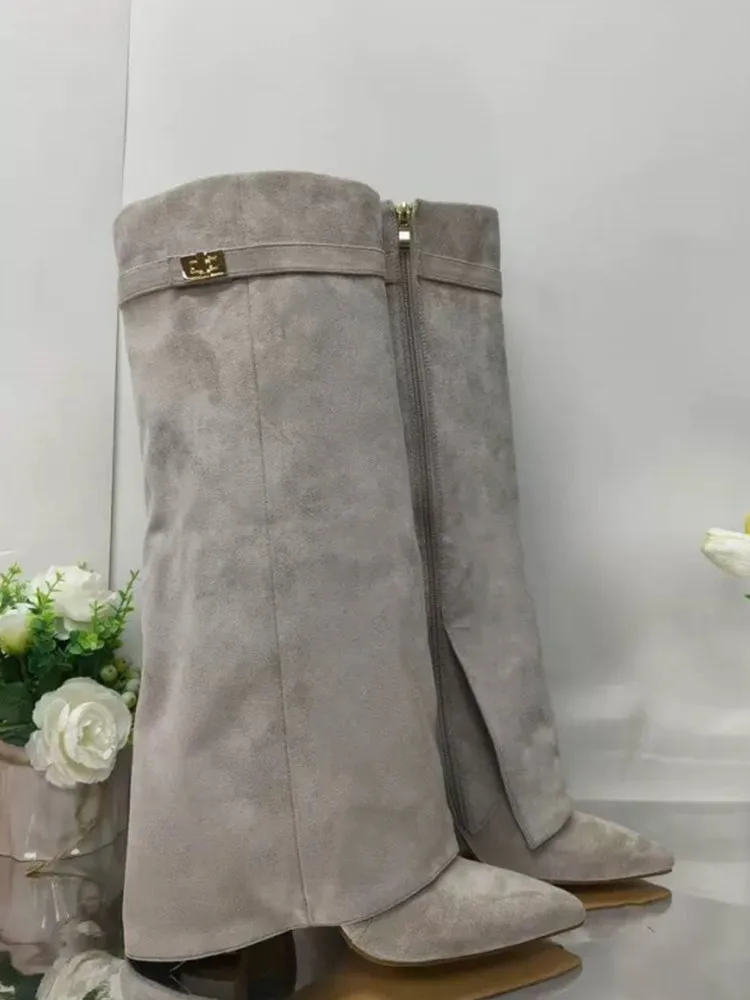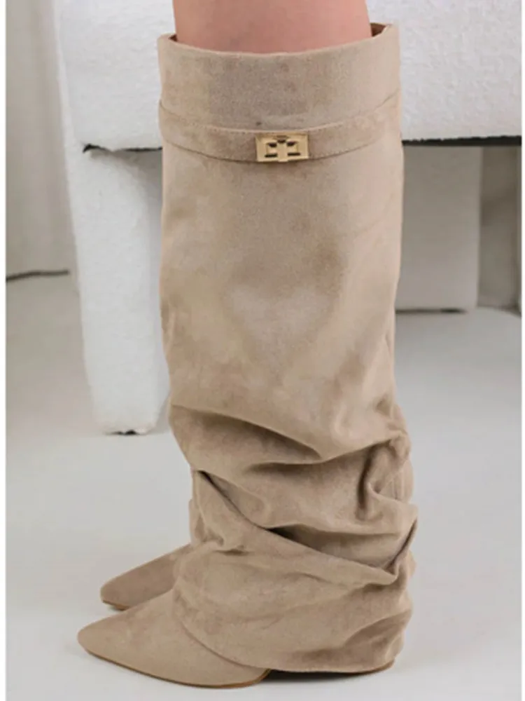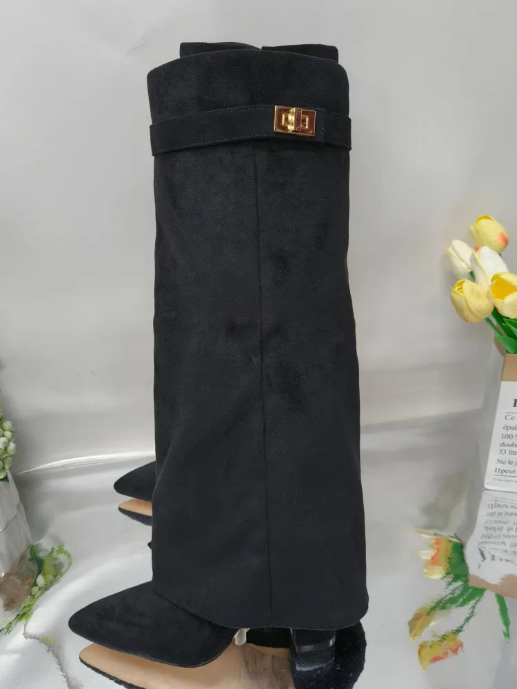 Autunno e inverno Nuovi stivali da donna alti al ginocchio con fibbia in metallo a punta, stivali spessi con pantaloni a tacco alto, stivali a gamba media alla moda