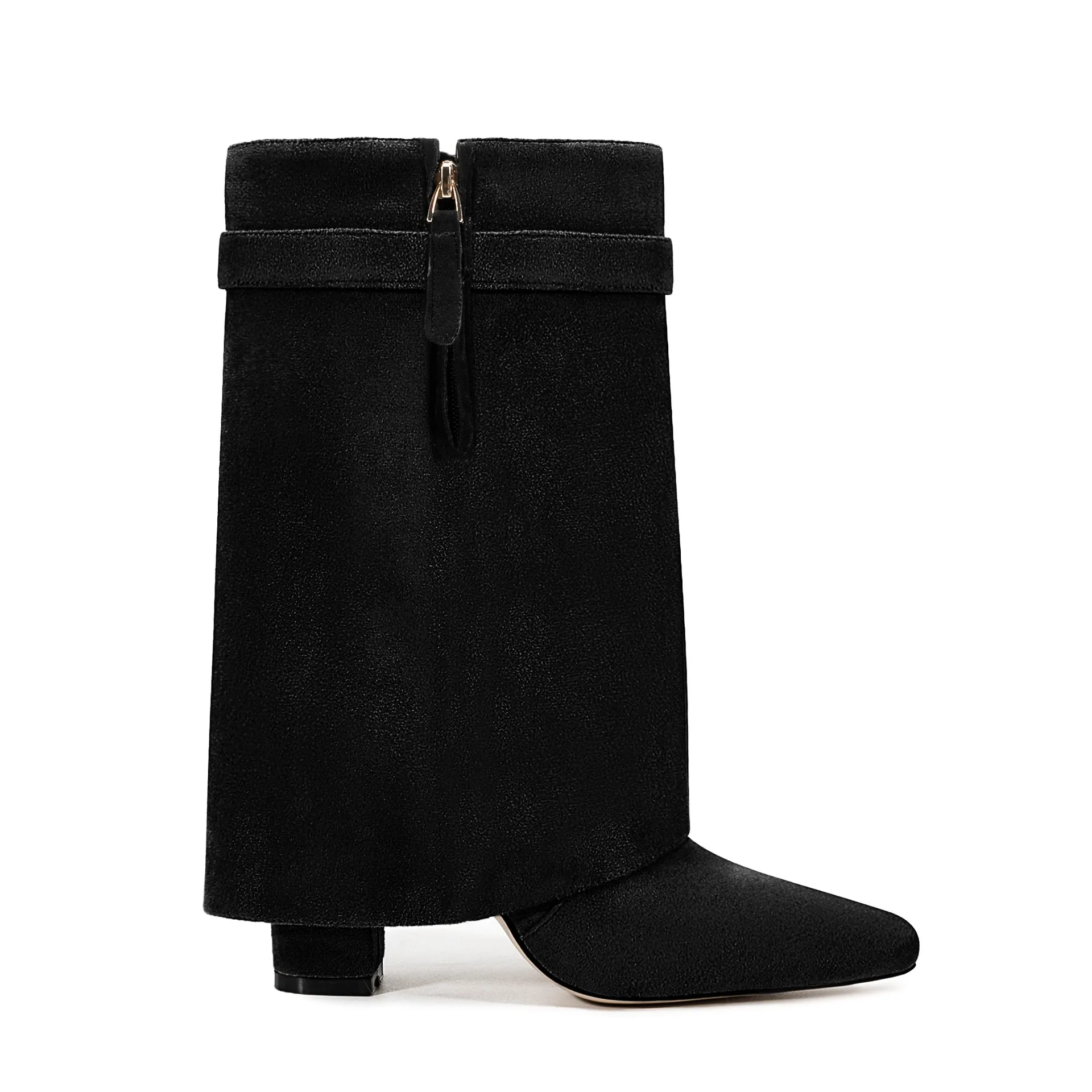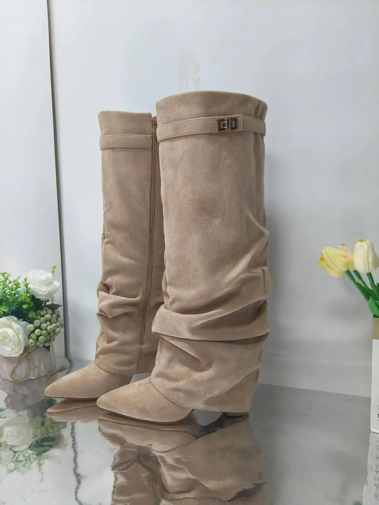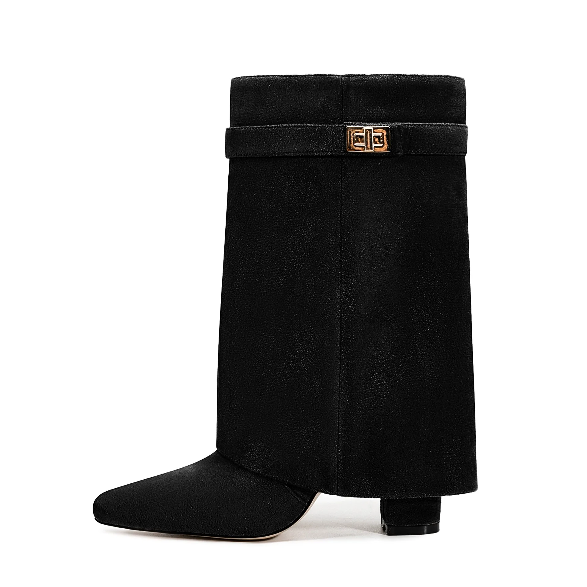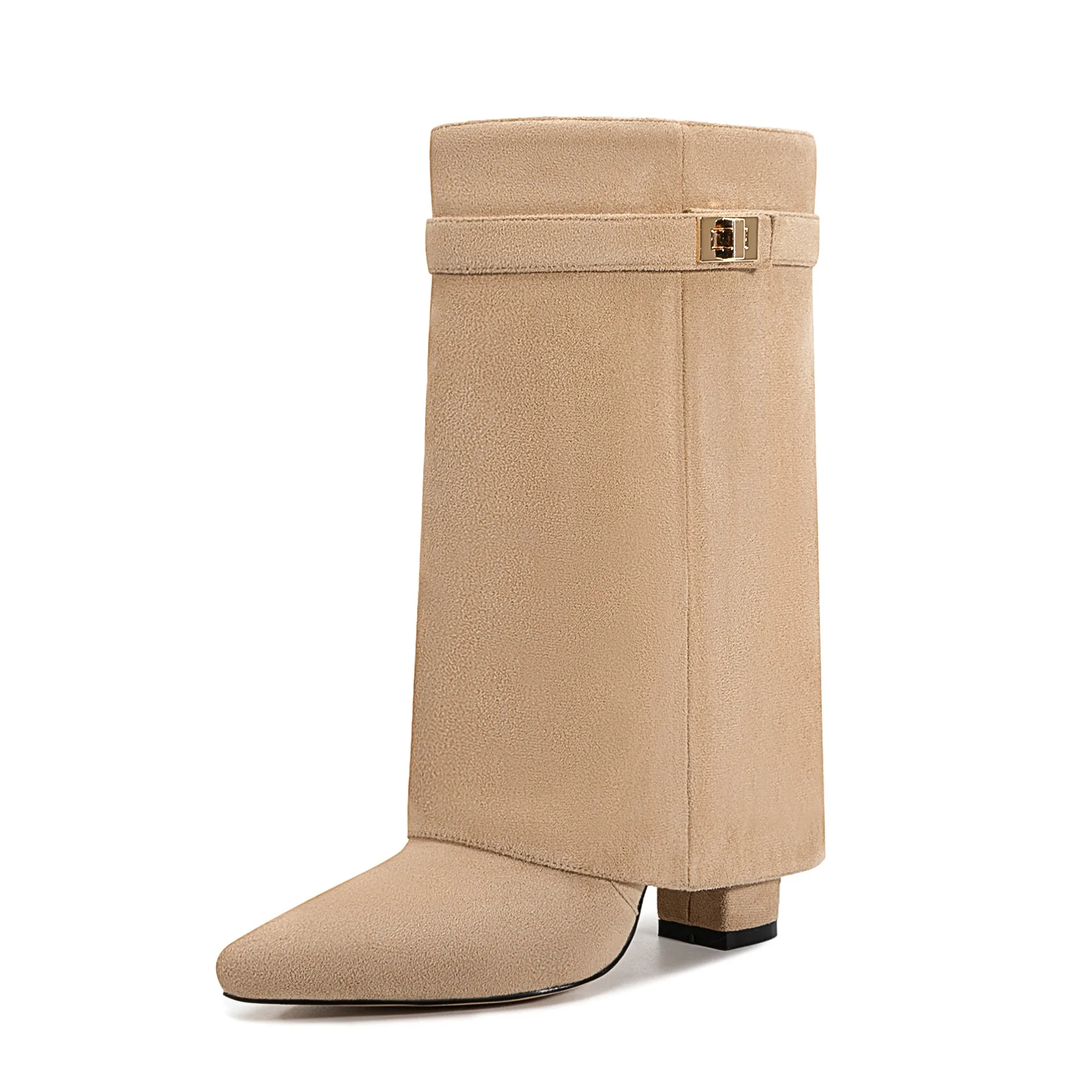 Autunno e inverno Nuovi stivali da donna alti al ginocchio con fibbia in metallo a punta, stivali spessi con pantaloni a tacco alto, stivali a gamba media alla moda