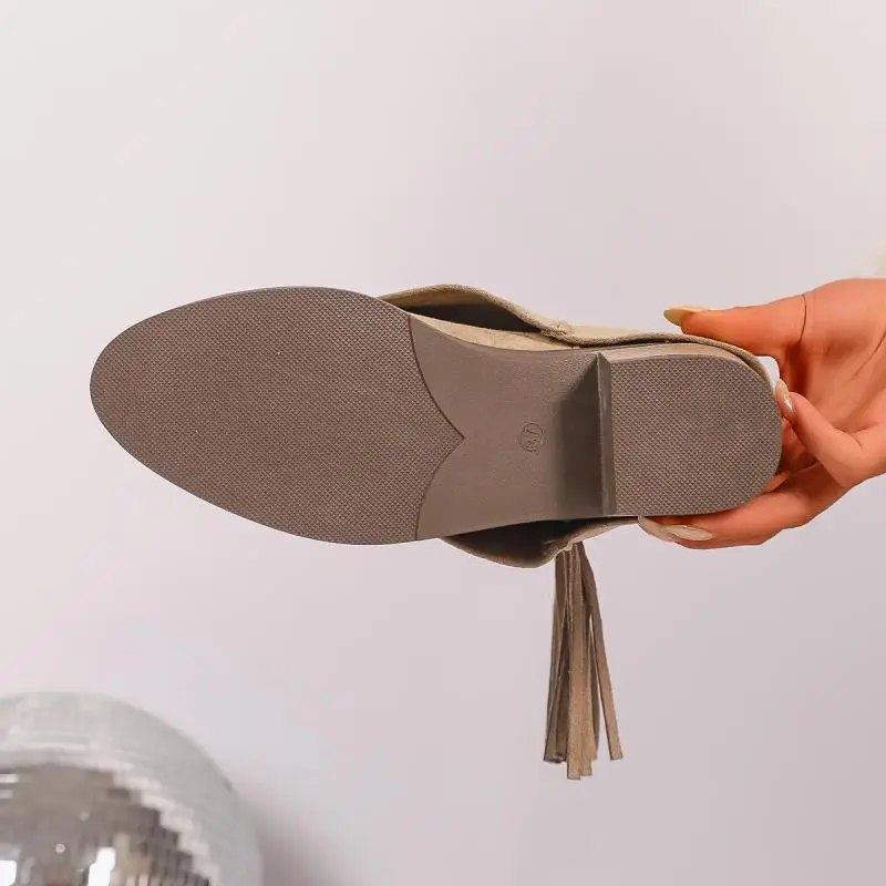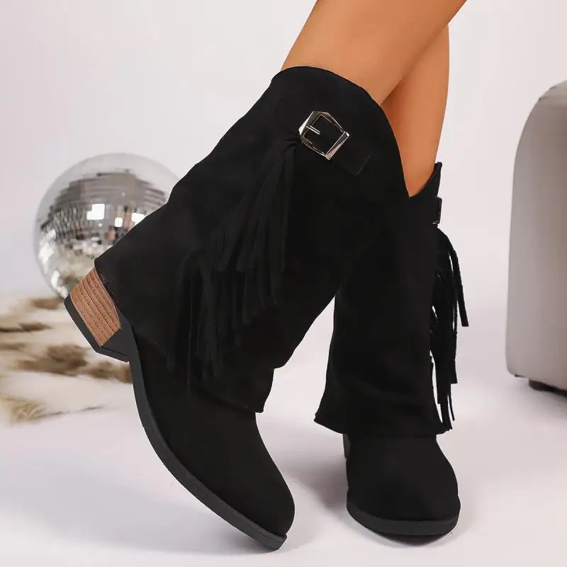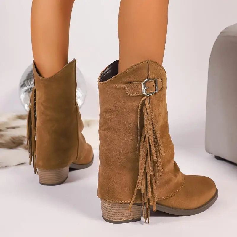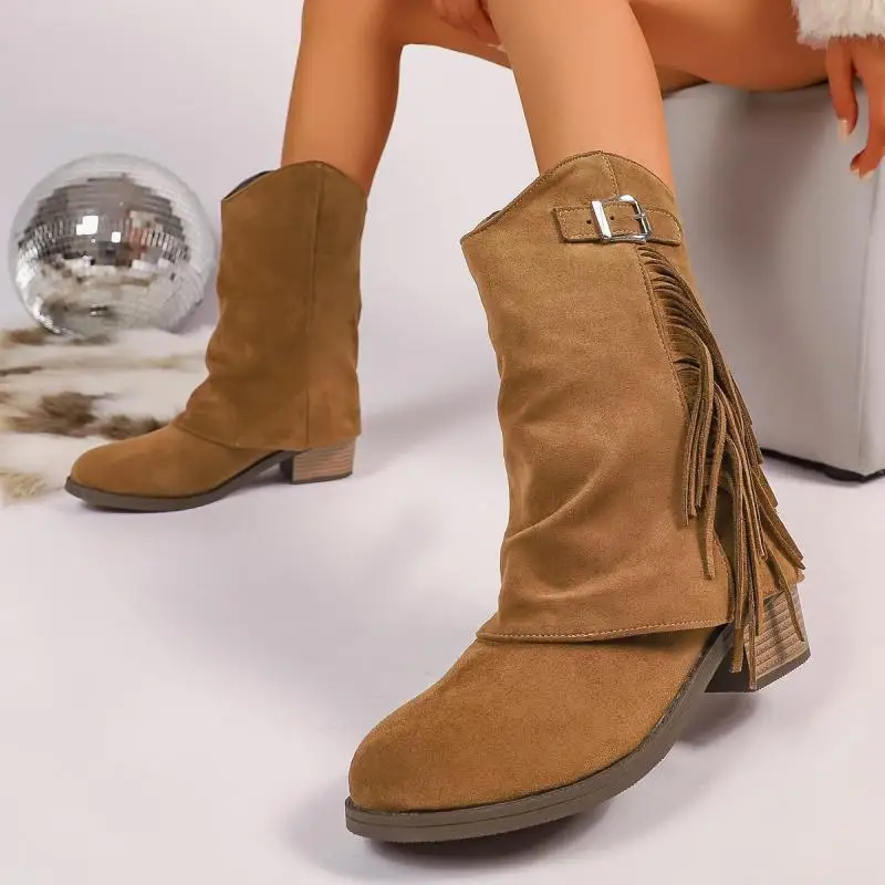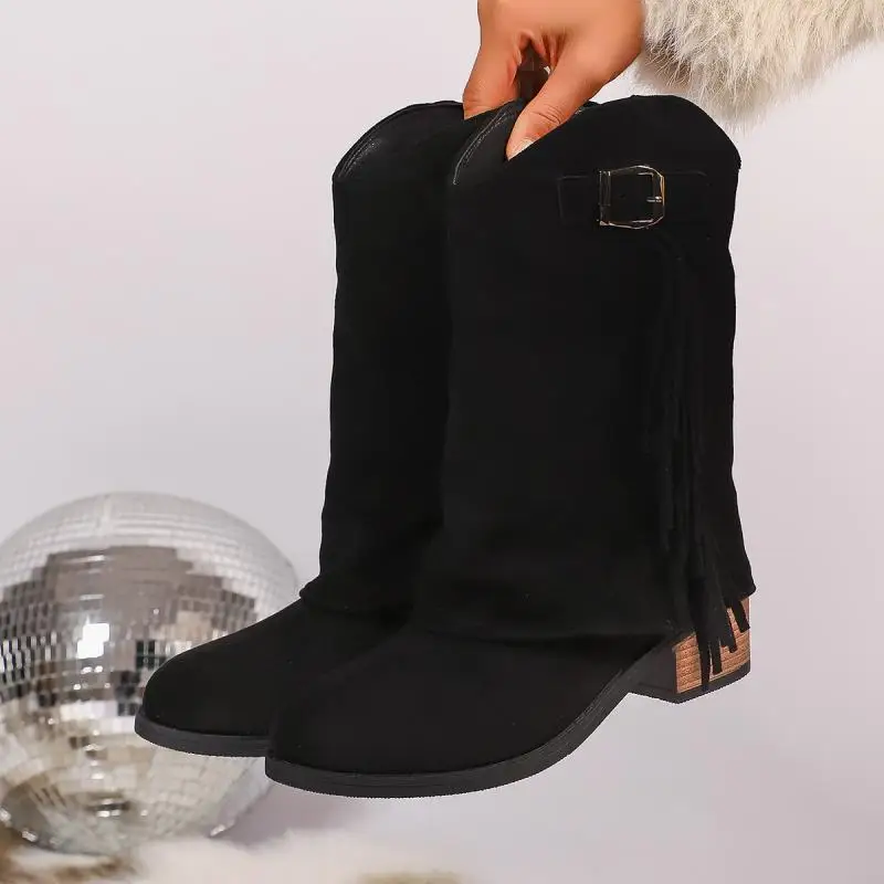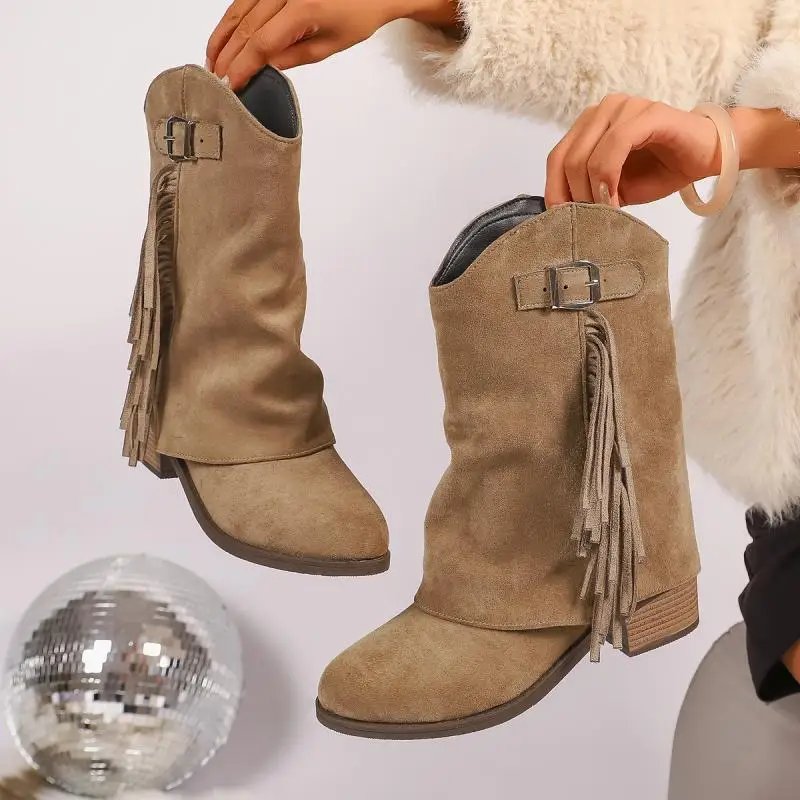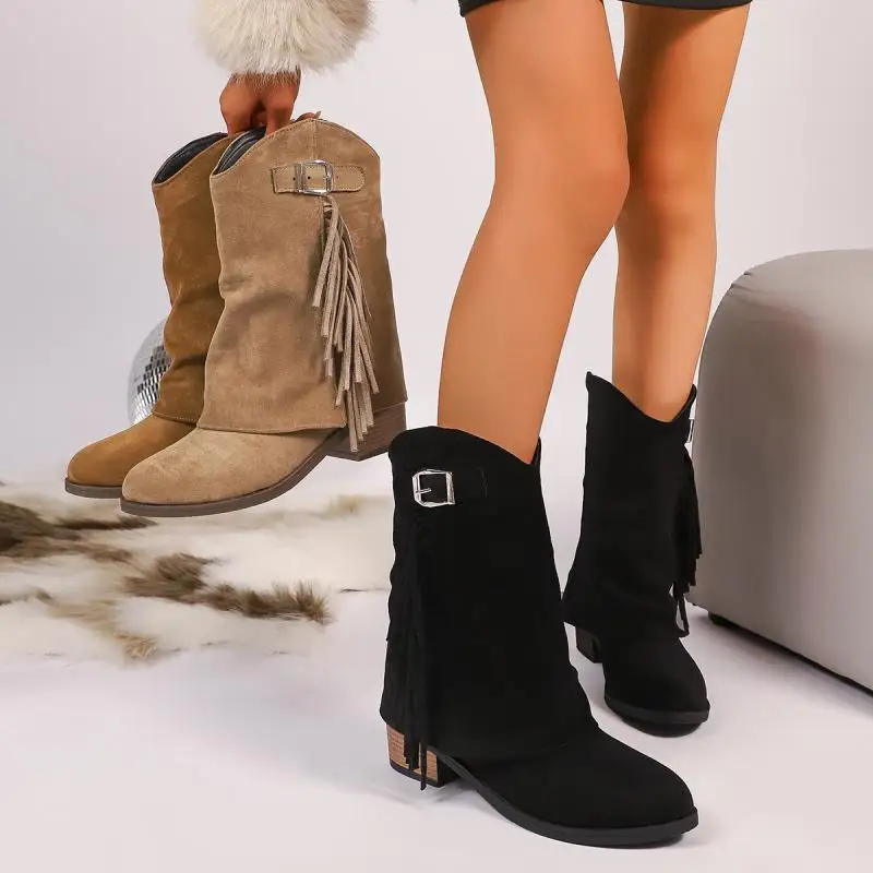 Stivali da cowboy occidentali con tacco alto spesso con nappa vintage Donna 2025 Stivali invernali a metà polpaccio in pelle scamosciata con fibbia in metallo Stivali lunghi da donna