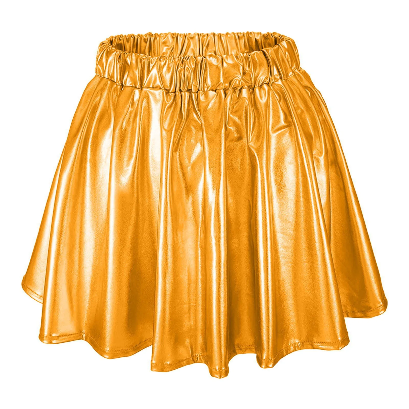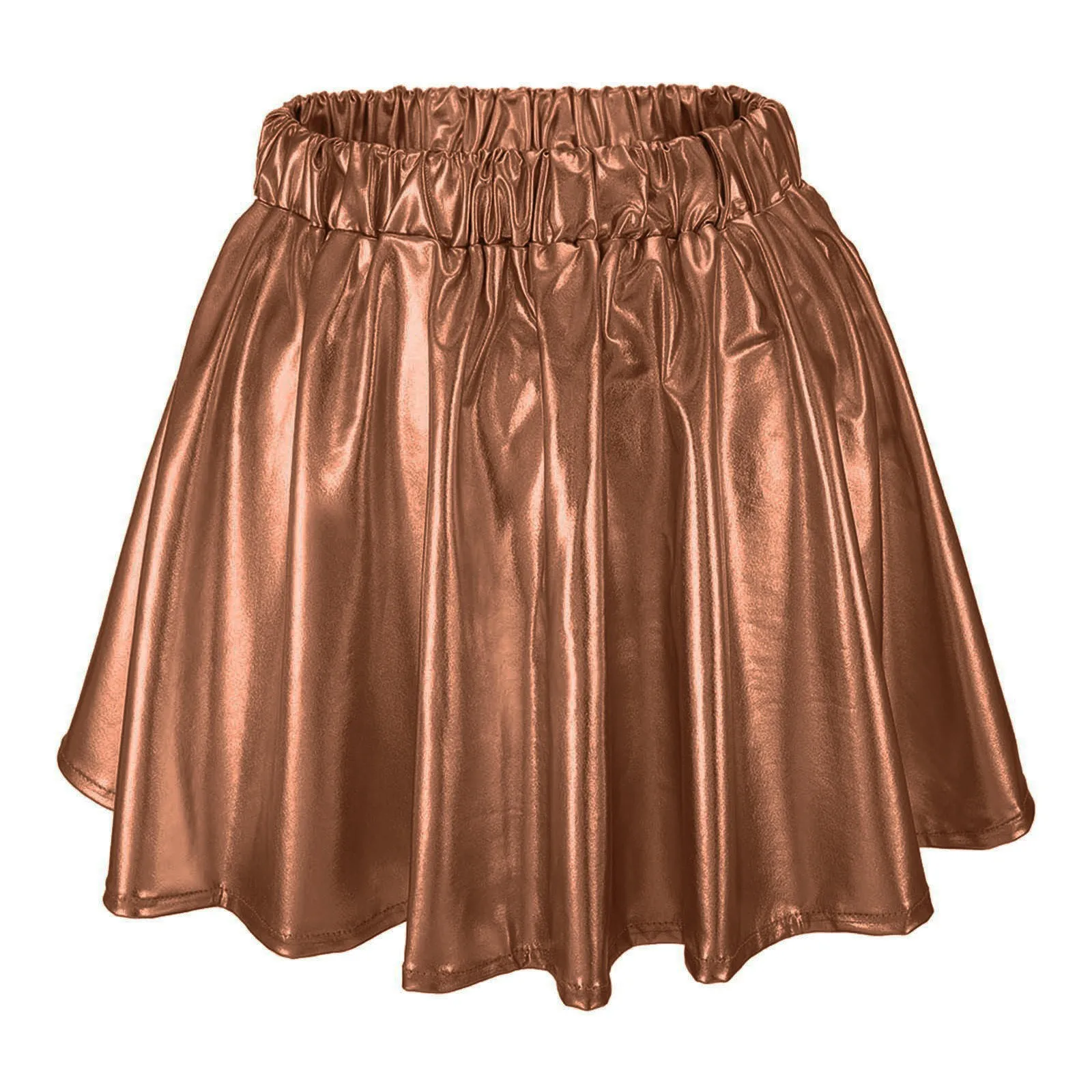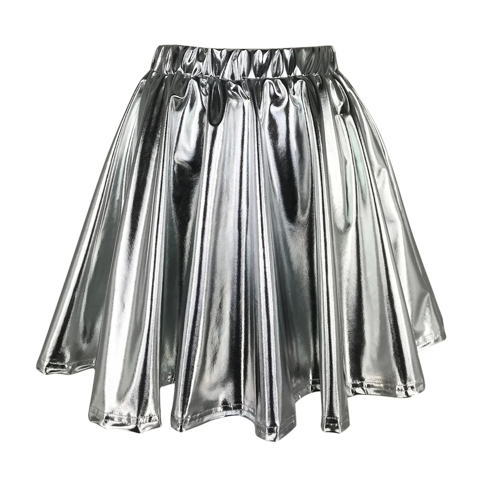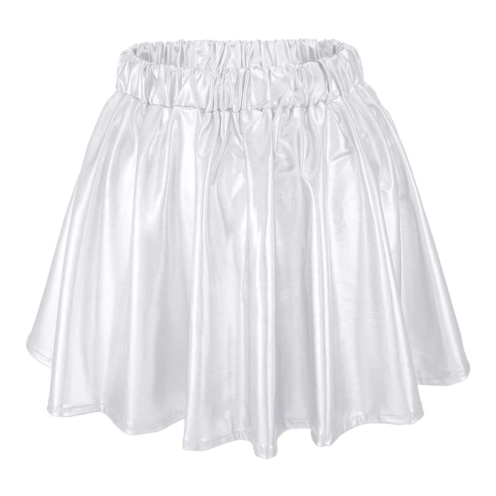 Gonna corta a pieghe svasata lucida da donna con elastico in vita per spettacoli teatrali