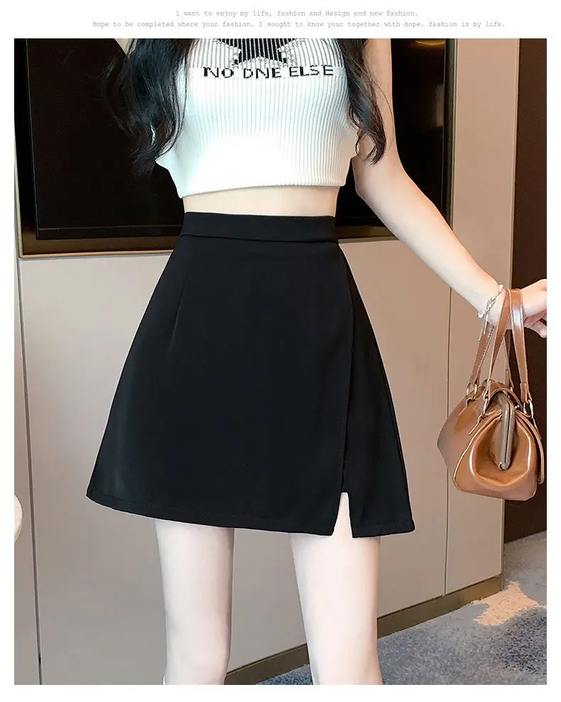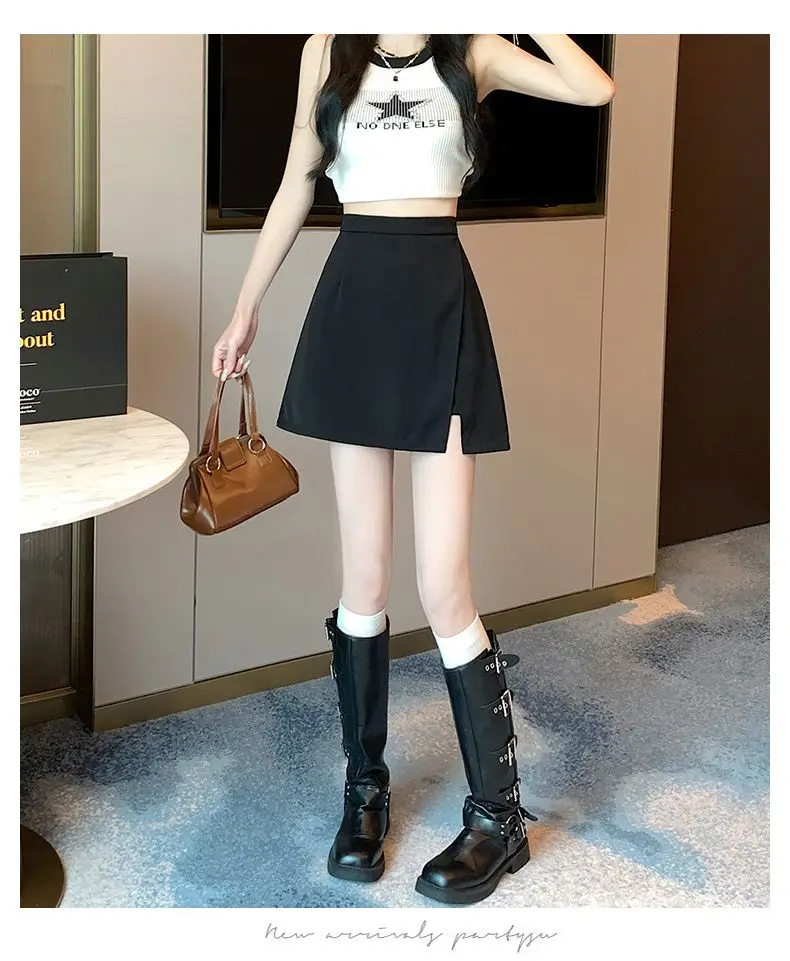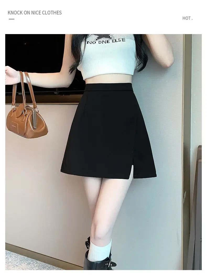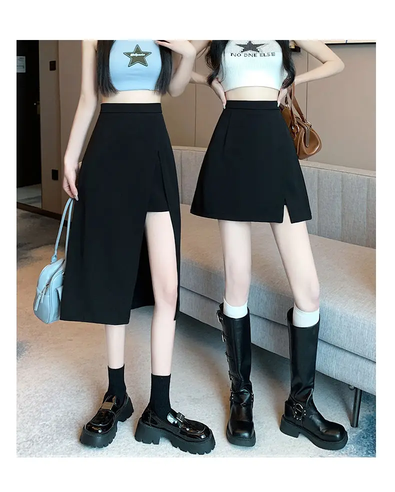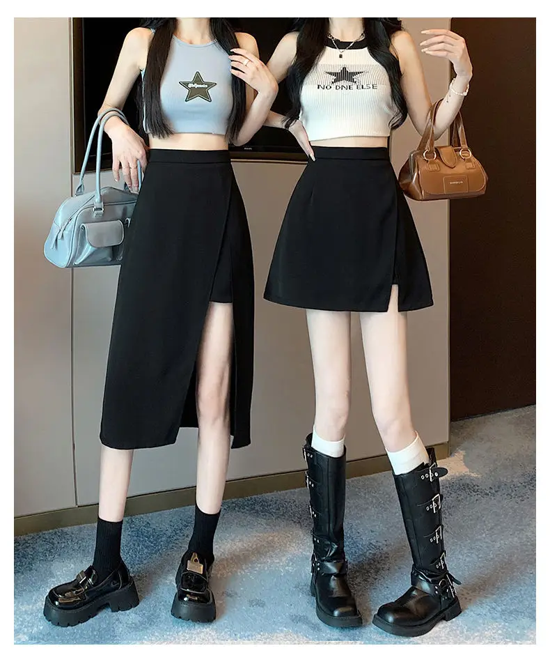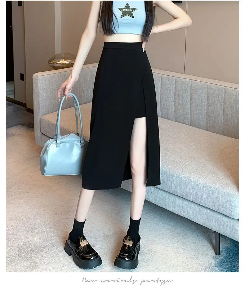 Gonna primavera ed estate 2025 da donna con gonna pantalone a trapezio nera a vita alta con spacco irregolare