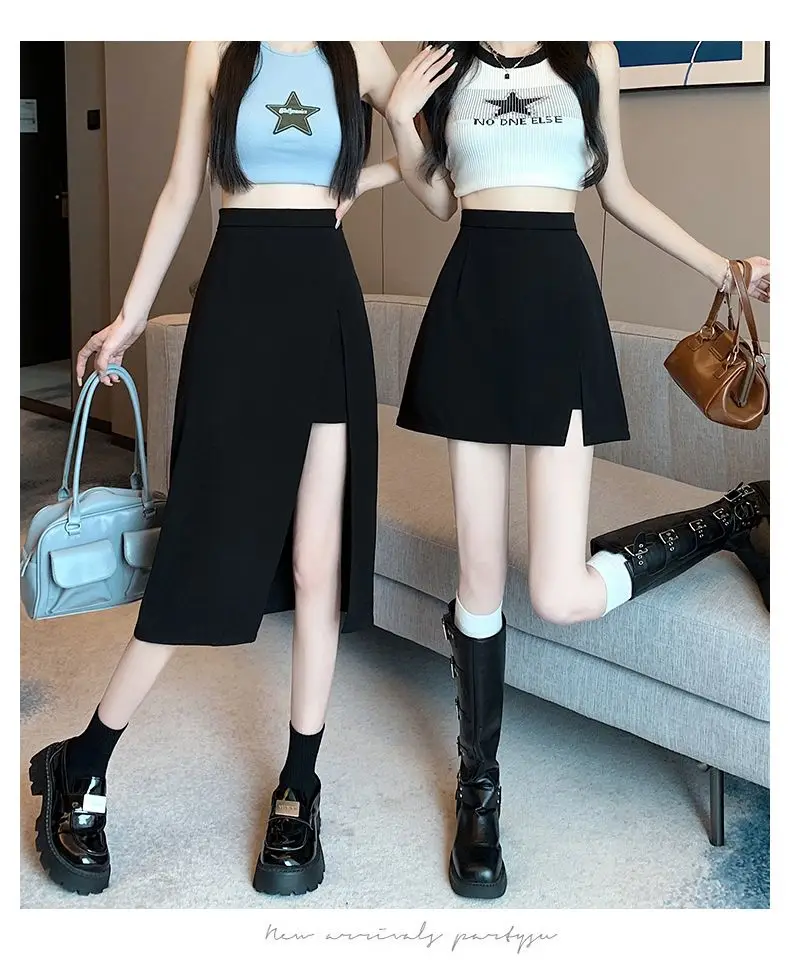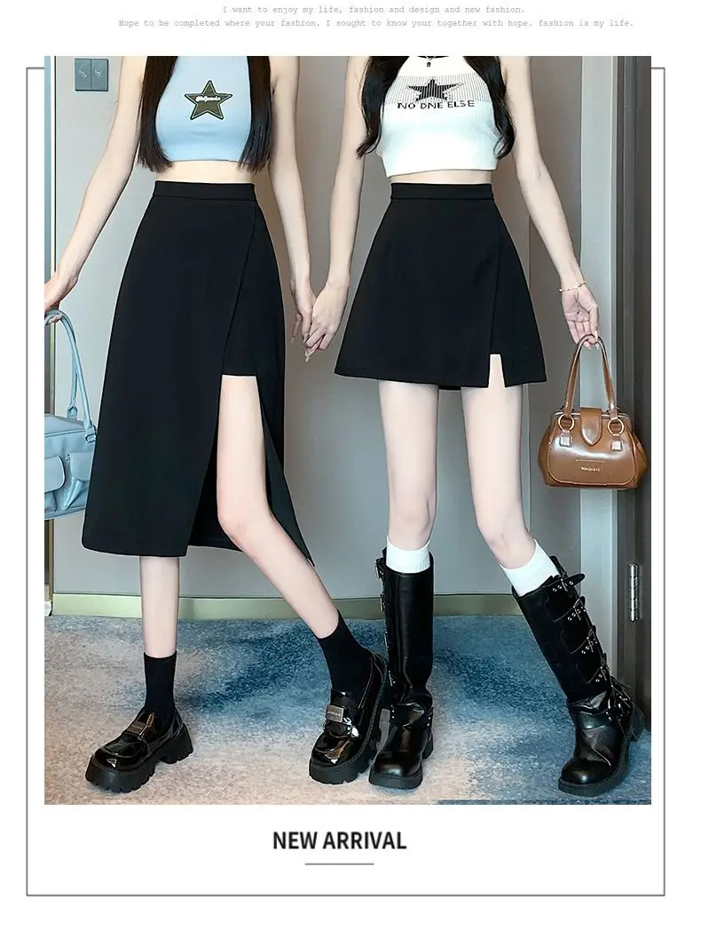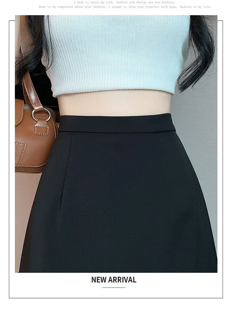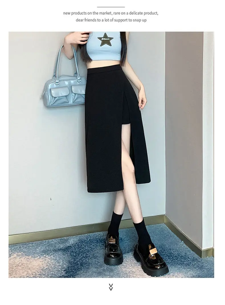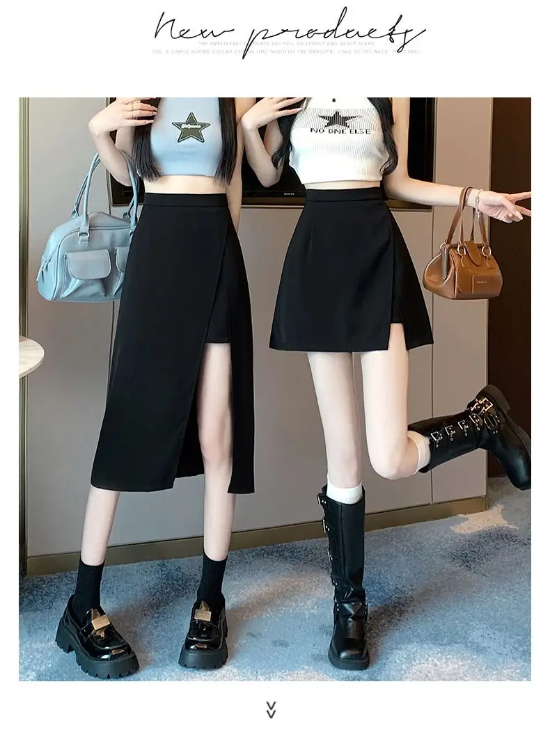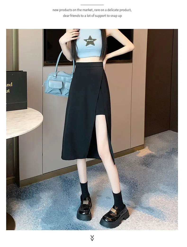Gonna primavera ed estate 2025 da donna con gonna pantalone a trapezio nera a vita alta con spacco irregolare