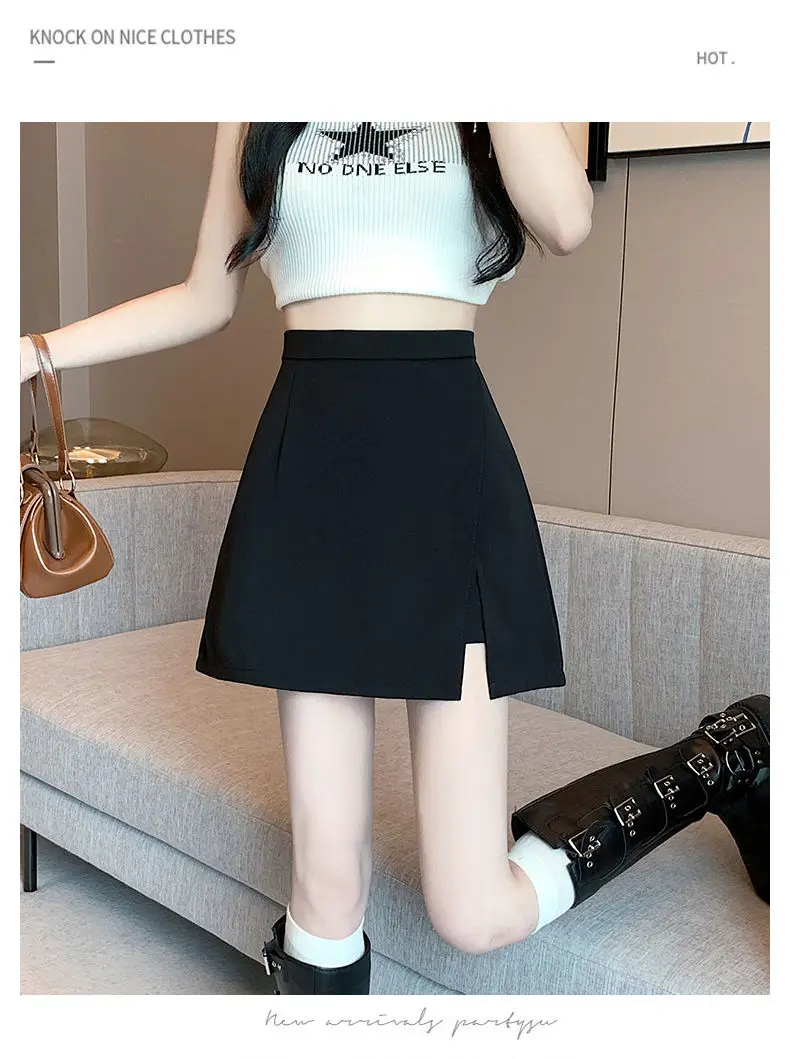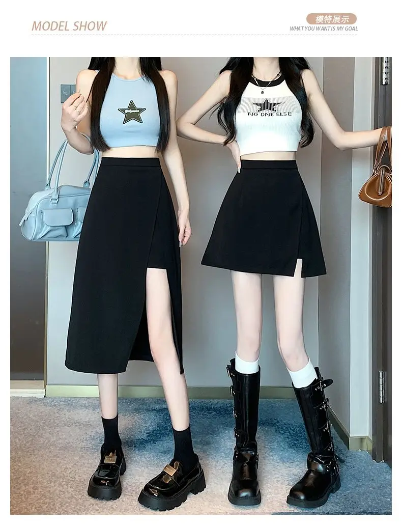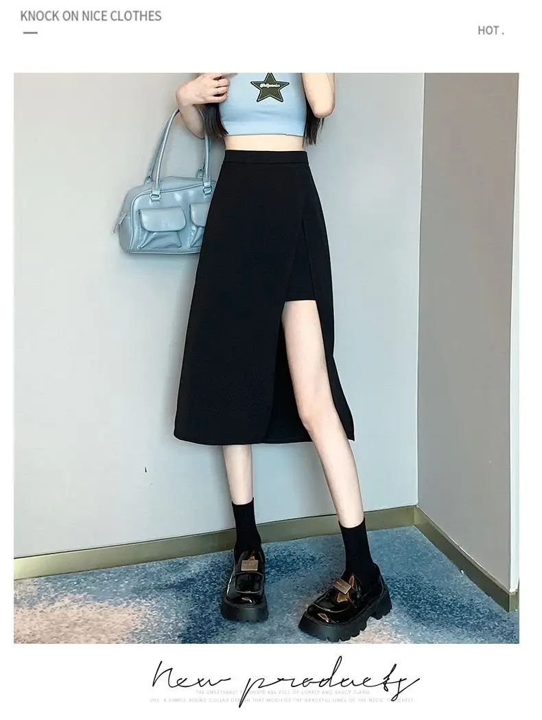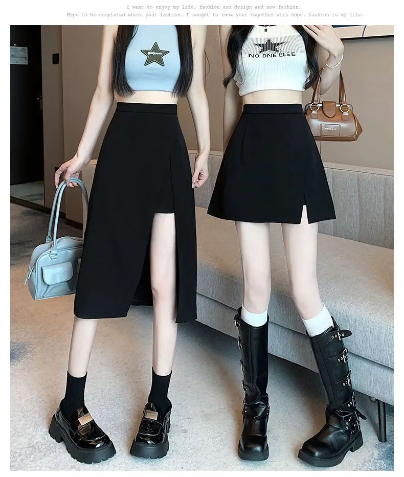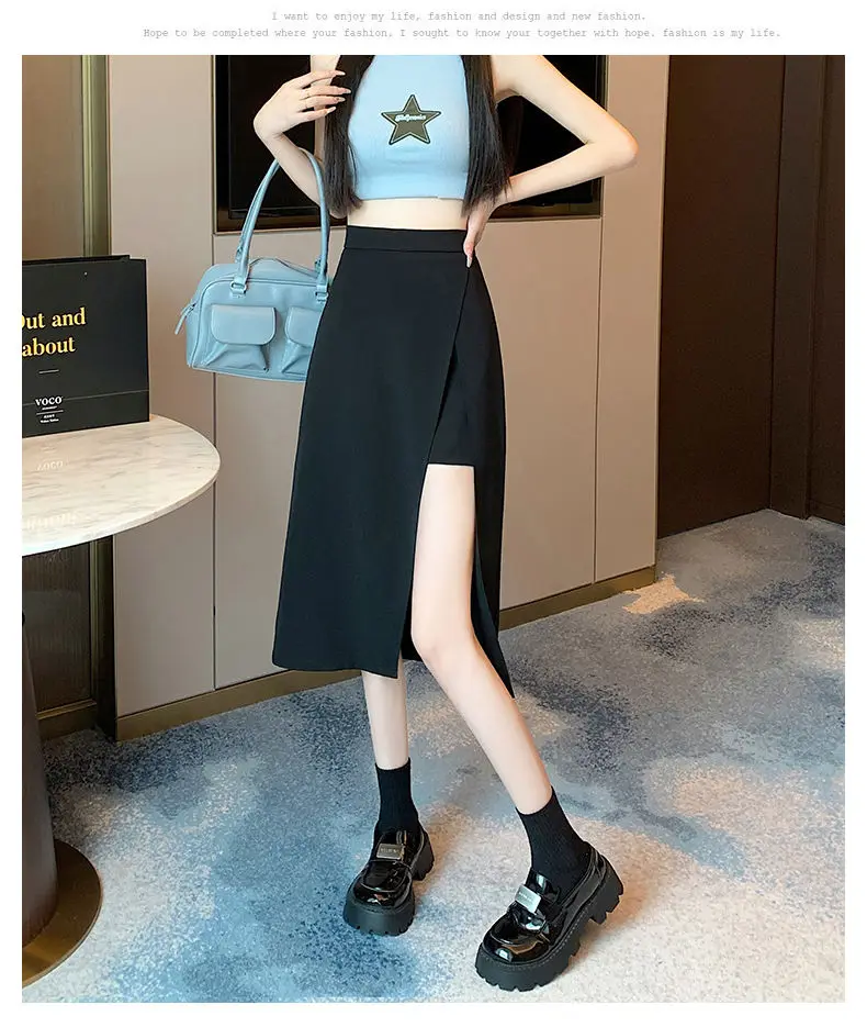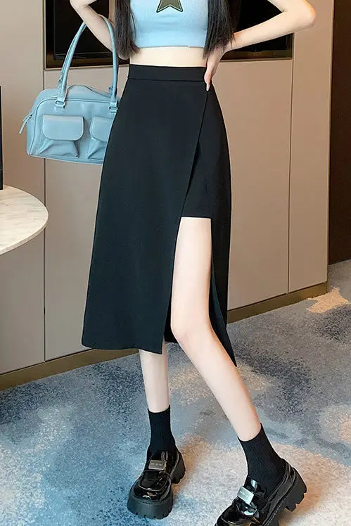 Gonna primavera ed estate 2025 da donna con gonna pantalone a trapezio nera a vita alta con spacco irregolare