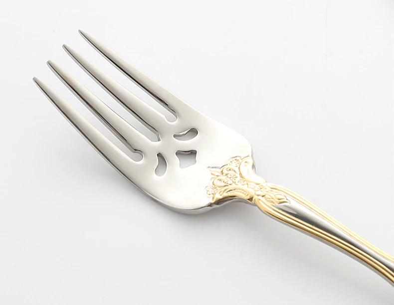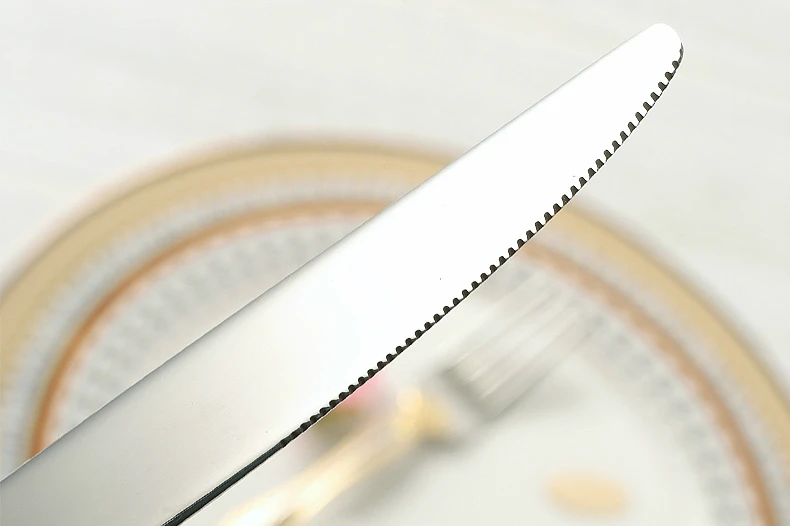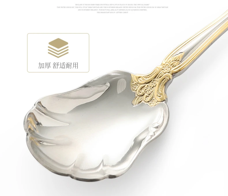 Rapporto di prova del materiale antibattericoIl test ha dimostrato che: Escherichia coli e Staphylococcus aureus, dopo essere stati esposti all’acciaio inossidabile antibatterico 304 per 24 ore, il valore dell’attività è ridotto, non è facile sopravvivere e riprodursi e il materiale ha evidenti proprietà antibattericheStile europeo, lusso leggero ed elegantePosate della serie Regno SegretoProcesso di placcatura in oro che non è facile da sbiadireElaborazione speciale e artisticaIl motivo in rilievo tridimensionale placcato in oro non è facile da sbiadireL’acciaio inossidabile 304 più spesso è più durevoleDesign spesso, sensazione di mano confortevoleLucido molte volte, fine e rotondoIl design a curva morbida incorpora principi di design ergonomico, si adatta alla presa del palmo ed è facile da usareColtello a testa tonda, affilato ma non affilatoPoiché tagliare l’oggetto reale richiede un coltello da tavolo ad alta durezza, il coltello da tavolo è in acciaio inossidabile 420 e il design a testa rotonda non è facile da ferire le persone ed è più sicuroProcesso di lucidatura a specchioOgnuno deve essere lucidato manualmente, da grossolano a fine strato dopo strato, fino all’effetto specchio lucido finale, l’artigianato, l’esperienza e l’atteggiamento dei lavoratori sono indispensabili.