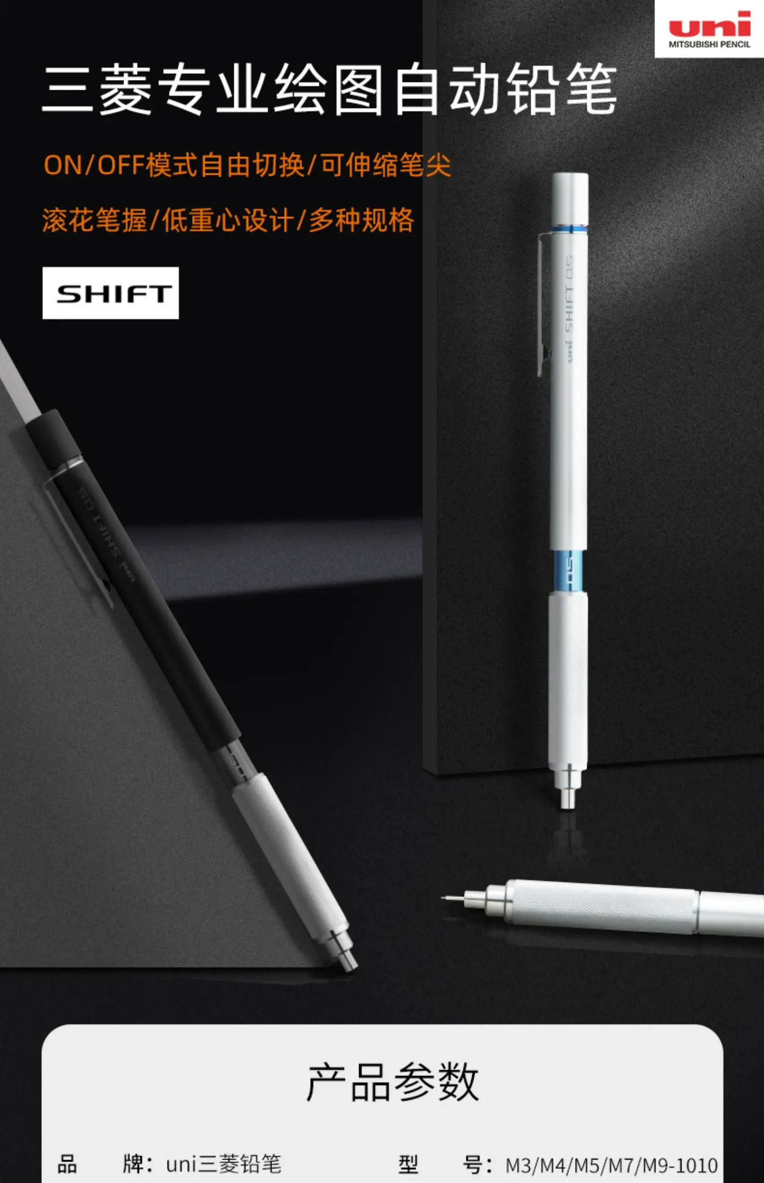 Uni Matita meccanica M51010 SHIFT Disegno in metallo lapiseira professionale 0,3/0,5/0,7/0,9 mm Materiale basso centro di gravità scolastico