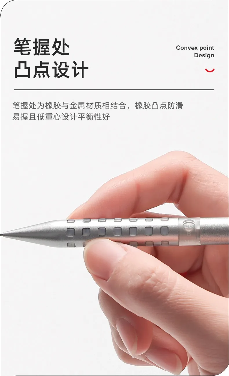 1.Punta della penna integrata e design dell’impugnatura; una maniglia integrata con la punta della penna mantiene una scrittura stabile senza oscillare. 2.Il design a punti rialzati della presa; l’impugnatura è una combinazione di materiali in gomma e metallo, con punti in gomma che forniscono una presa antiscivolo e facile e un design a basso centro di gravità con un buon equilibrio. 3.Tubo centrale esteso per una visione aperta; viene utilizzato un tubo con nucleo in piombo esteso da 4 mm, che non blocca facilmente la linea visiva durante la scrittura del disegno. 4.Finestra di durezza per un uso efficiente; una finestra di visualizzazione della durezza del piombo con specifiche professionali, che può essere regolata in tempo reale. 5.Comodo pulsante di coda in gomma, una grande chiave di coda in gomma a spirale fornisce una pressione più confortevole. 6.Gomma nascosta, pronta all’uso quando si tira il cappuccio; la gomma all’estremità della penna pronta per l’uso quando si tira il cappuccio, pulendo ordinatamente e risparmiando fatica. 7.Petali ad artiglio in rame per una presa stabile del piombo; il piombo è saldamente afferrato ed estruso, offrendo una buona esperienza utente. 8. Fusto della penna a quattro colori con scrittura a basso centro di gravità; sono disponibili quattro colori per soddisfare le diverse preferenze