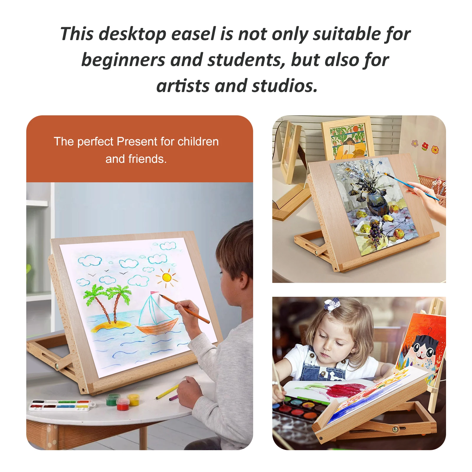 Parts List:Desktop Drawing Sketching Easel x 1Detailed Description:This desktop drawing sketching easel can be folded for easy traveling and storage. The angle can be adjusted according to your preference. Made of quality beech wood, handcrafted, smooth surface, no burrs. Suitable for all children, beginners, and professional artists.Key Features:Multifunctional Design: This drafting board easel can be used as an easel or drawing board. It can be folded for easy traveling and storage. It can be used directly as a drawing board after folding.Ideal Present Choice: This table easel is a perfect birthday present for kids, parents, and friends.Specification:Product Name: Drawing Board Easel (Style A)Material: Beech WoodSize: about 43 x 32 x 6 cm/16.93 x 12.6 x 2.36 inColor: Wood ColorORProduct Name: Easel Stand (Style B)Material: Beech WoodSize: 45 x 35 x 30cm/17.7 x 13.8 x 11.8inches Highlight Description:[Angle Adjustable] This painting easel can be adjusted to your satisfactory angle by the screws on the side, providing flexibility for various drawing methods.[Premium Material] This drawing board easel is made of solid beech wood, sturdy and reliable, handmade with no burrs, and smooth surface, which can provide reliable quality for your drawing and sketching out.[Size] This tabletop easel measures about 43x32x6cm/16.93×12.6×2.36 inches, this is a multifunctional board that not only can be used for painting, sketching, and drafting, sketching but also can be used as a bookshelf or tablet display.[Suitable Size] The easel provides you with a stable drawing environment, this tabletop easel measures about 45 x 35 x 30cm, easy to carry, folding design, no need to assemble, lightweight. [Portable] This drafting easel tabletop is easy to fold, open, and close, you can carry it with you, not as difficult to carry as a metal floor stand, perfect for sketching and desktop use on the go.[Suitable for Everyone] This table top drawing board easel is not only suitable for beginners and students, but also for artists and studio use.Note:1. There may be slight differences between the picture and the actual color of the commodity. We will try our best to show you the exact color.2. Please allow slight dimension differences due to manual measurement.3. Wood products, accept color and pattern differences.