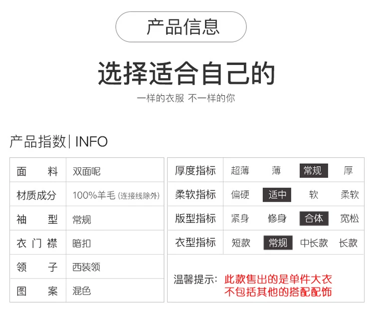 *Istruzioni di lavaggio: Lavaggio caldo da marinaio; Non candeggiare; Non capovolgere l’asciugatura; La temperatura della piastra inferiore non è superiore 110°CEase Lavaggio a secco; -Solo stiratura inversa; Fodera in tessuto caldo