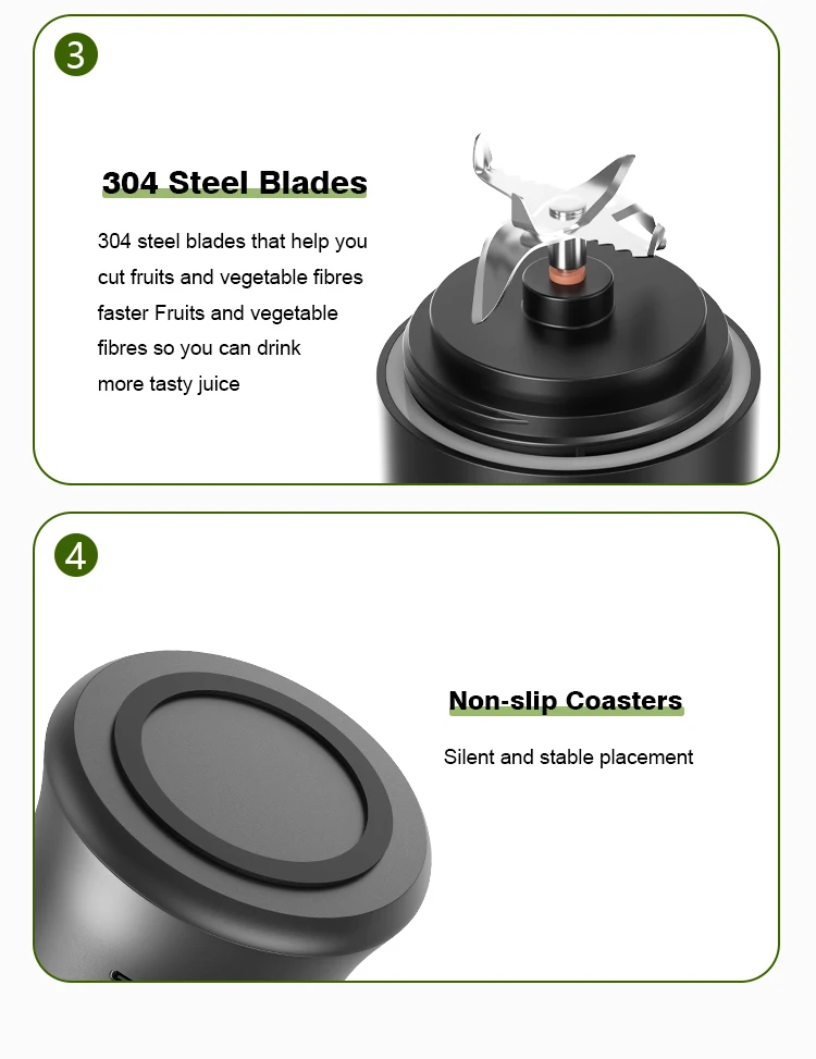 1.Frullatore integrato 7.Voltaggio 4V 2000mah*2 capacità della batteria, che ha una portata migliore rispetto ai normali spremiagrumi portatili. Utilizza la porta di ricarica di tipo C, il design, può essere caricato in qualsiasi momento attraverso la comoda porta di alimentazione, come laptop, desktop, alimentazione mobile o ricarica della porta di ricarica dell’auto, comodo per cucina, viaggi, sport, occasioni di picnic e altri usi.