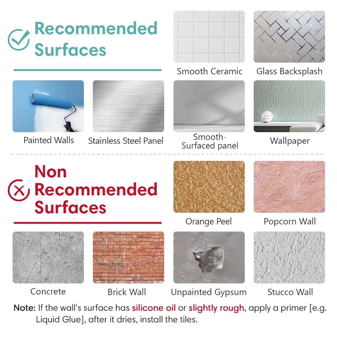 Make sure the wall is clean, dry, and smooth. Use a grease remover like TSP if needed.