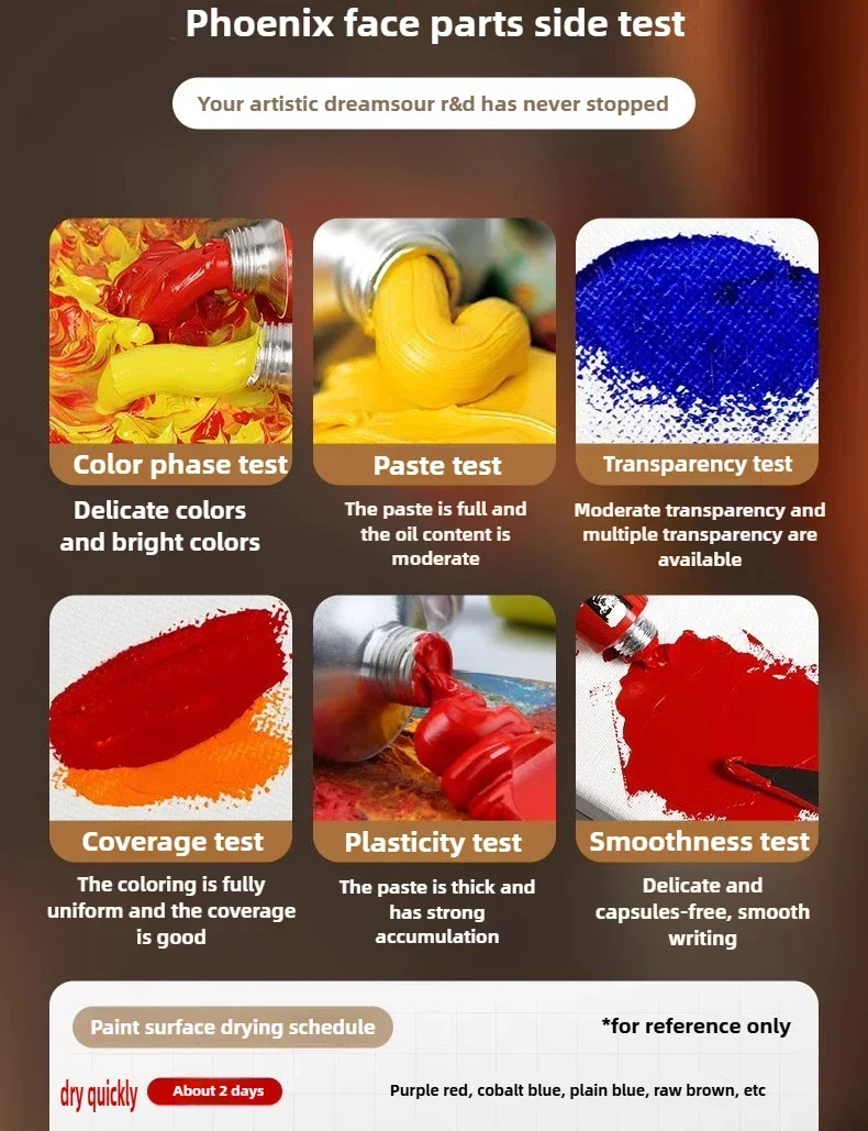 Il design del guscio in alluminio è antiruggine e resistente alle danni, garantisce la conservazione a lungo termine. Questo consente di catturare l’ispirazione di qualsiasi momento, ovunque, senza paura delle interferenze ambientali esterne. Moreover, Phoenix Oil Paint ha sottostante test rigoristici, con fases di colore accurate, pasta piena, trasparenza moderata, copertura forte, alta plasticità e eccellenti fluidità: ogni prestazione incontra alte standard per la creazione artistica.