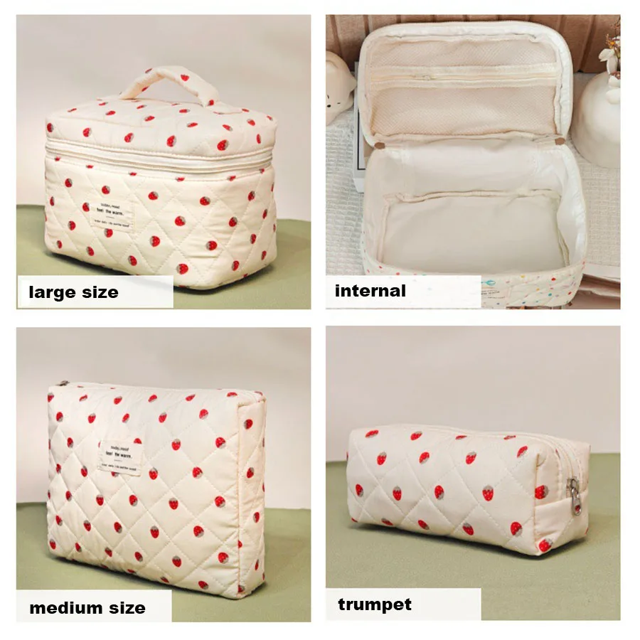 2 reviews for Borsa per il trucco alla fragola Borse per cosmetici da donna Moda portatile carina custodia da viaggio per cosmetici Borsa in cotone trapuntato con cerniera Pu