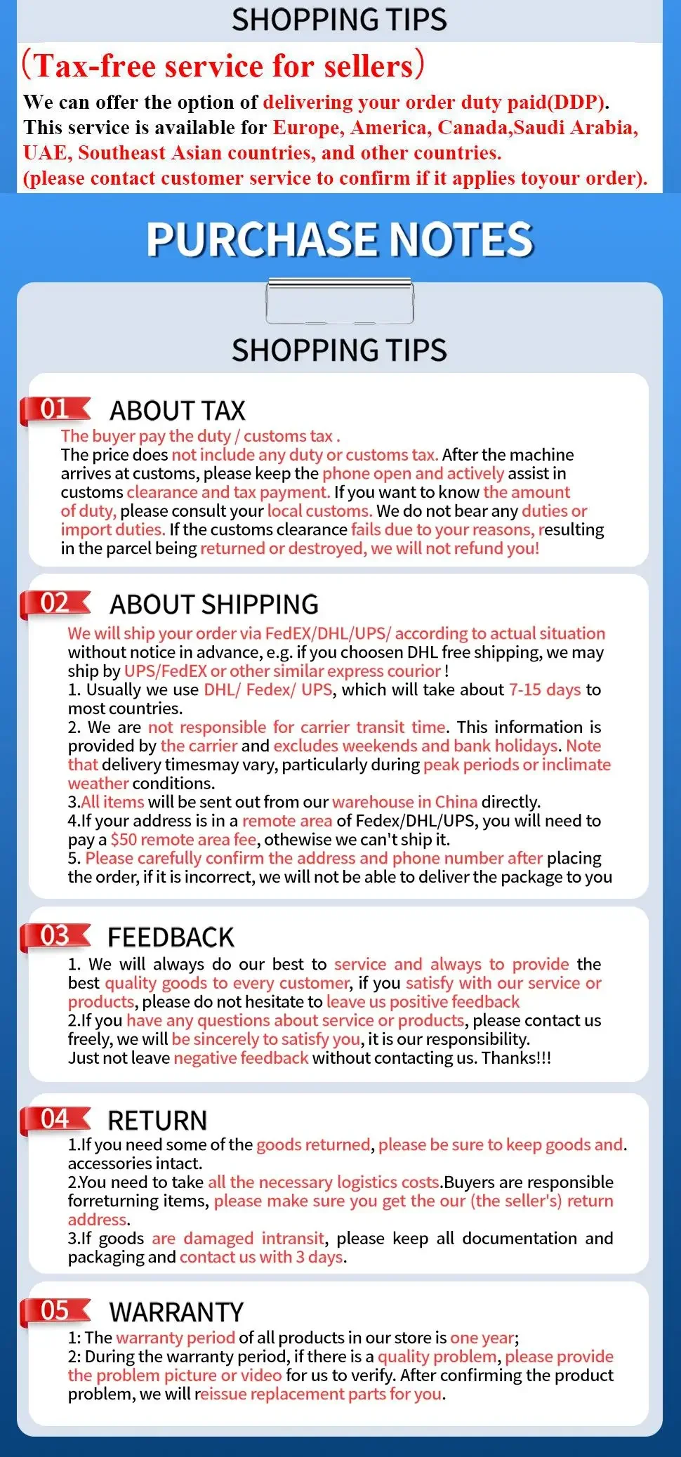 Possiamo offrire l’opzione di fornire pagato per l’ordine (DDP)Questo servizio è disponibile per l’Europa, l’America, il Canada, l’Arabia Saudita, l’UAE, i paesi del sud-est asiatico e altri paesi.(si prega di contattare il servizio clienti per confermare se applica al tuo ordine).