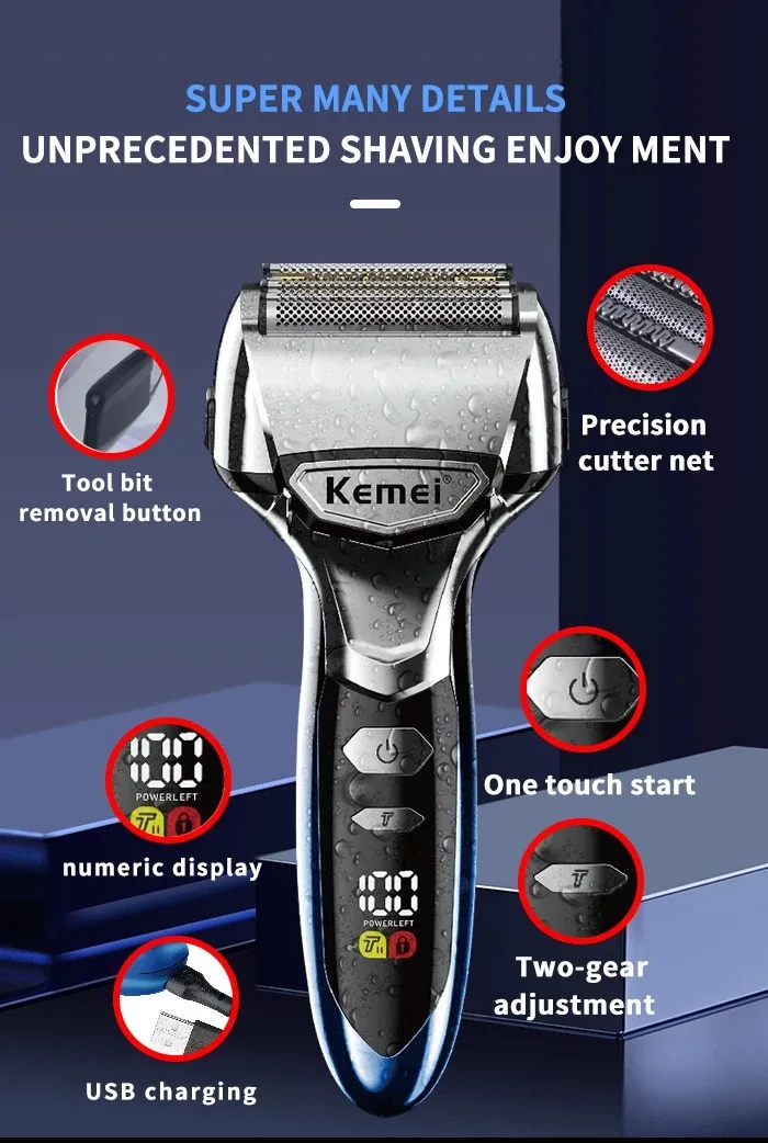 Kemei Rasoio elettrico a 5 lame da uomo Viso Barba Rasoio asciutto e bagnato Ricaricabile Macchina da barba per testa calva IPX7 Impermeabile Lavabile