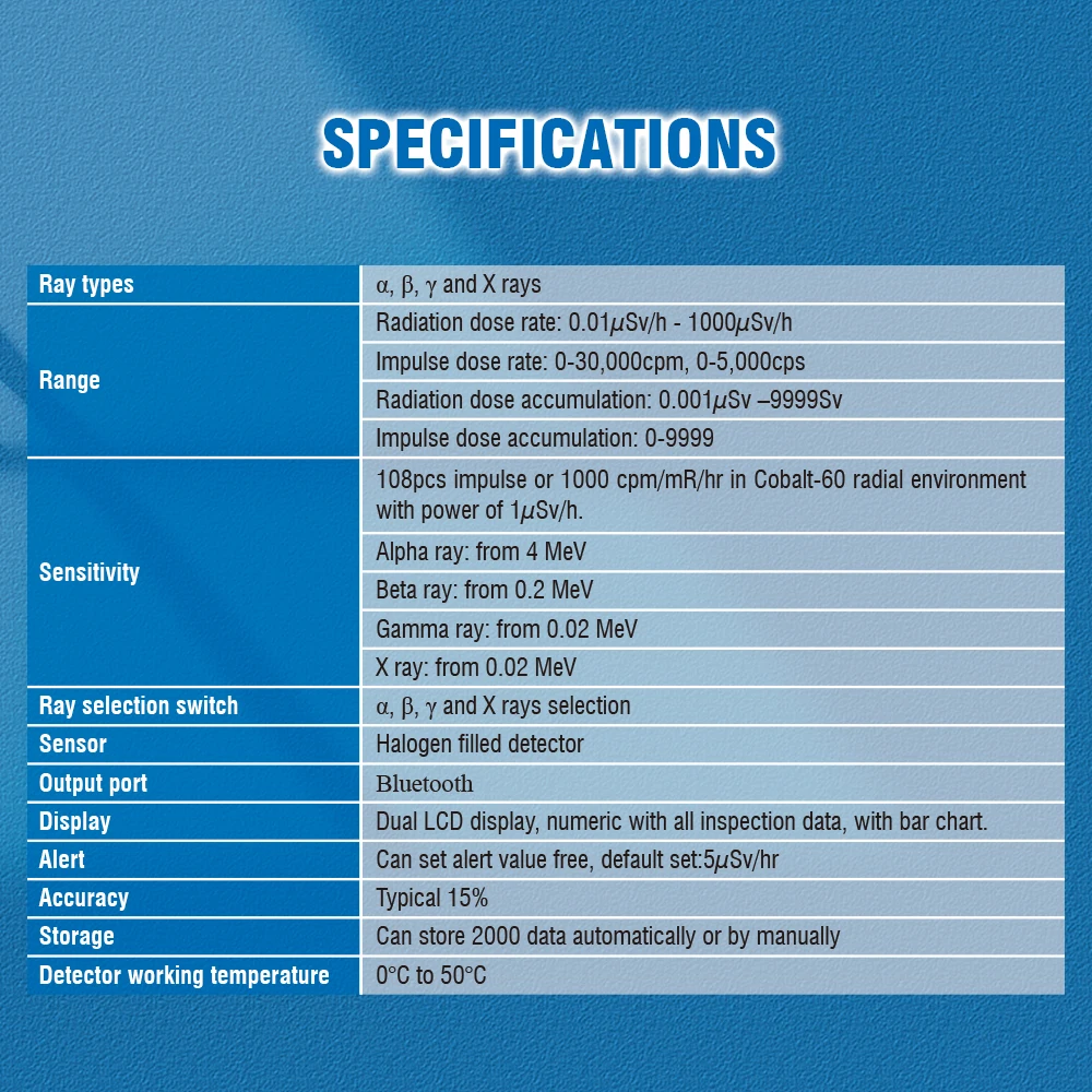 Range 1 | Radiation dose rate: 0.01uSv/h – 1000uSv/h |