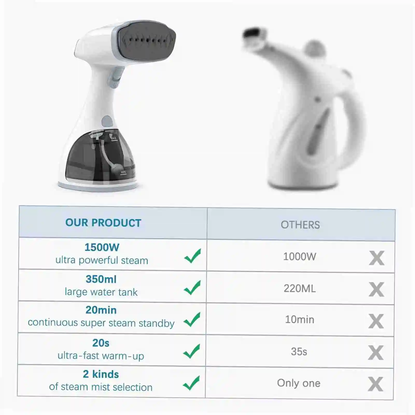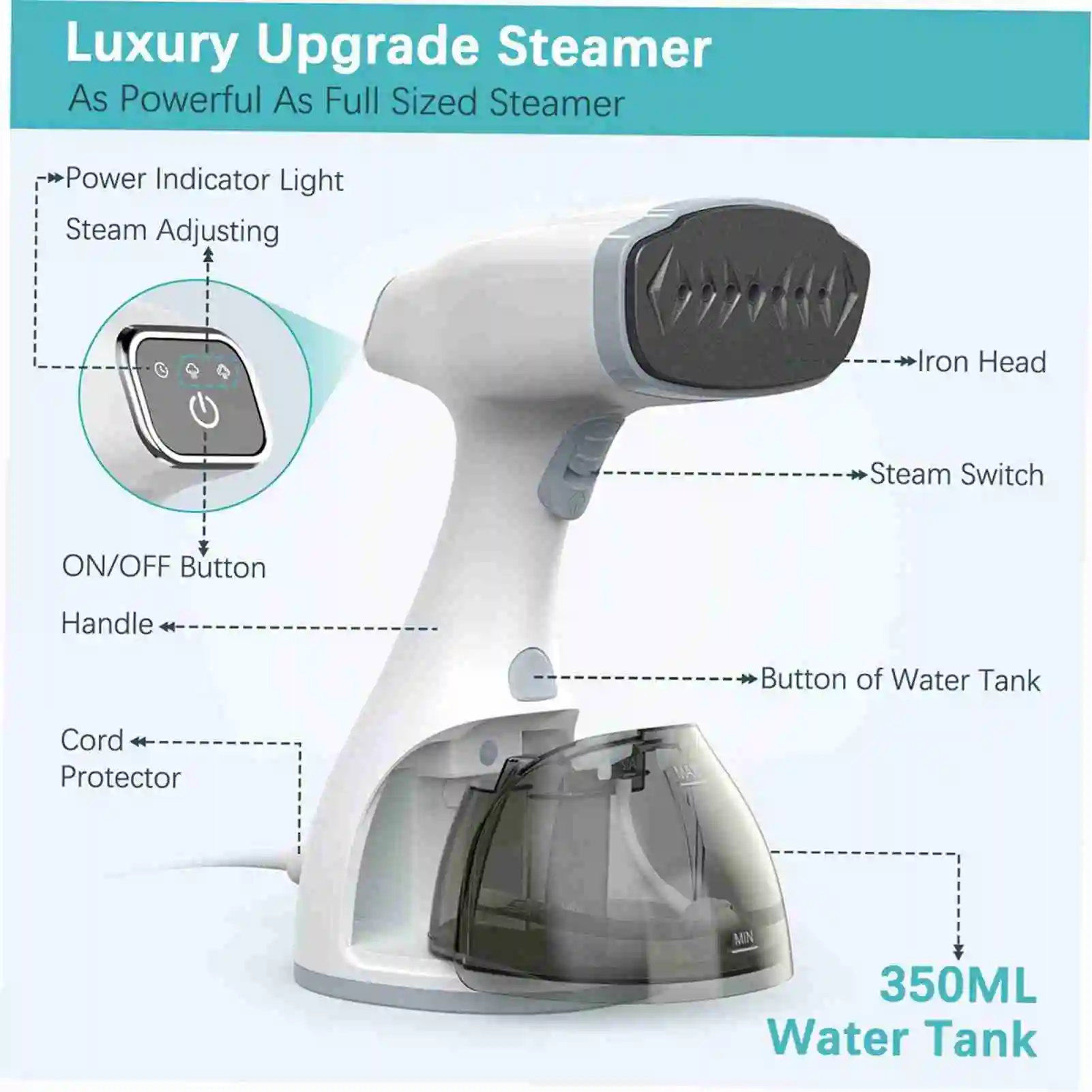 La capacità maggiore da 350 ml fornisce vapore pieno e migliora le più lunghe tempi di lavoro fino a 15 minuti, ridotta l’annuntamento dell’acqua dell’aggiunta frequentemente.