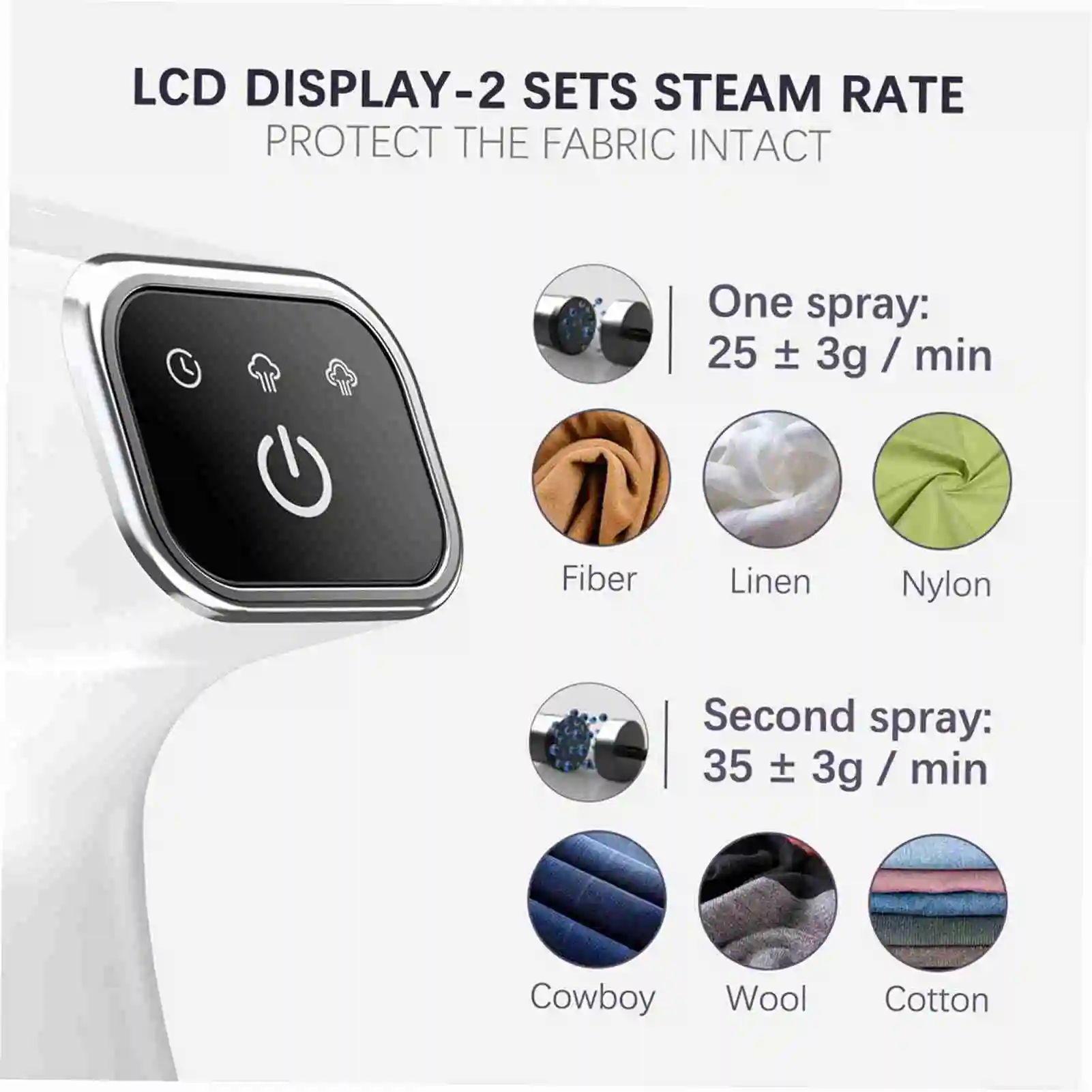 2 modalità vapore tra cui scegliere per le tue esigenze.Il primo livello di vapore è adatto per rimuovere la maggior parte delle rughe; la seconda modalità vapore può generare più potente scoppio di vapore che può sempre i tessuti e levigare le più pieghe per ottenere i risultati di stiratura, molto completi.