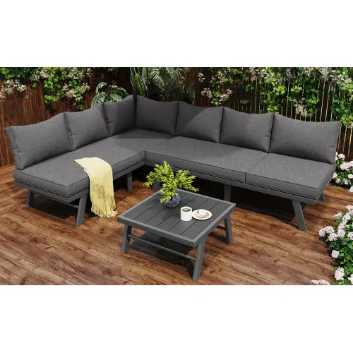 Ci sono molte modi di combinare divani, tavoli e sedie per uso esterno.La disposizione dei divani e dei tavolini è semplice ma solenne.Contro lo sfondo dell’ambiente esterno naturale, offre uno spazio unico e rilassante per le conversazioni aziendali.È anche adatto a amici per ottenere insieme, chat e condividi la vita nell’atmosfera fresca all’aperto.