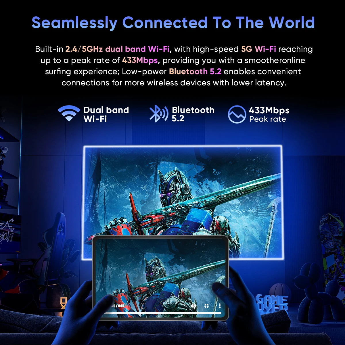 Wi-Fi dual band integrato da 2,4/5 CHz, con ricezione Wi-Fi 5G ad alta velocità a una velocità di picco di 433 Mbps, che fornisce un’esperienza smootheronlinesurf; Bluetooth 5.2 a bassa potenza consente di collegamenti convenienti per più dispositivi wireless con latenza ower.