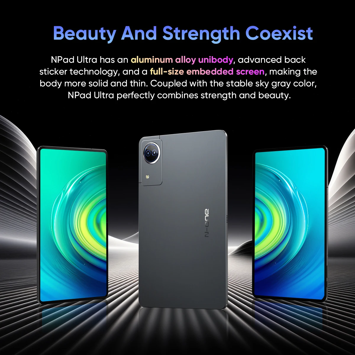 NPad Ultra ha un unibody in lega di alluminio, una tecnologia avanzata del backsticker e un schermo incorporato a grandezza naturale, rende il corpo più solido e sottile.Accoppiato con il colore grigio cielo stabile, NPad Ultra combina perfettamente forza e bellezza
