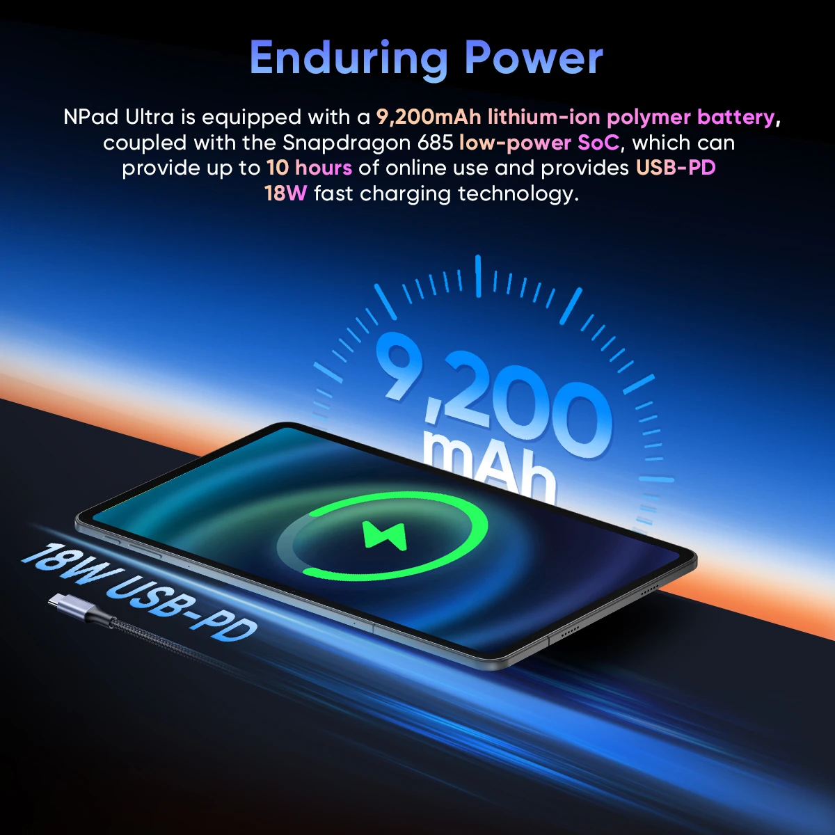 NPad Ultra è dotato di una batteria ai polimeri di ioni di litio da 9,200 mAh, accoppiata con Soc a basso consumo Snapdragon 685, che può fornire fino a 10 ore di utilizzo online e fornisce tecnologia di ricarica rapida USB-PD18W.