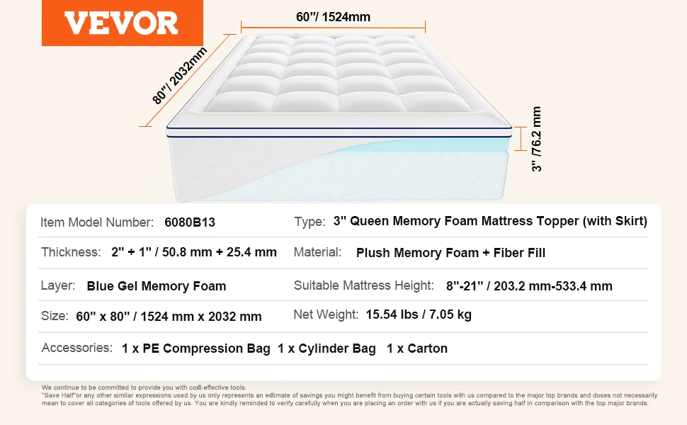 VEVOR Coprimaterasso Misura Queen Memory Foam Spessore 76,2 mm, Imbottitura in Fibra Lavabile Sfoderabile, Rinfrescante e Traspirante, con Tasca sul Comodino Removibile, Alleviare Pressione Corporea