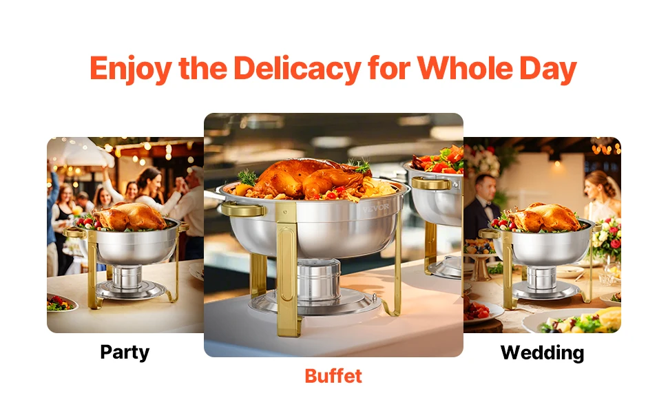 Elegante finitura dorata: il lussuoso colore dorato di questo scaldino aggiunge un tocco sofisticato a qualsiasi evento. Che si tratti di buffet, feste o matrimoni, questo design elegante valorizza la decorazione della tavola e aumenta l’atmosfera