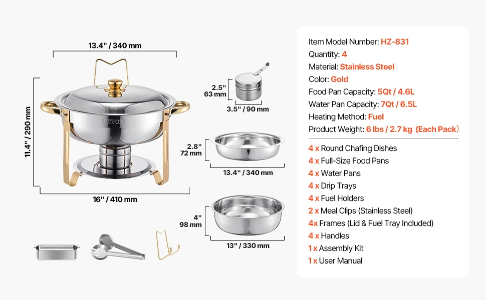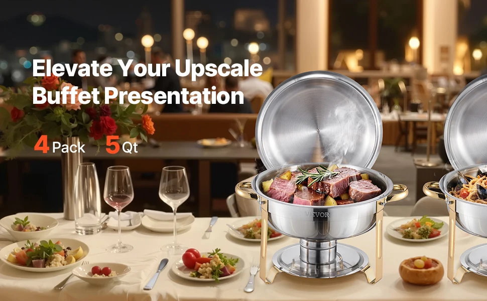 2 reviews for VEVOR Scaldavivande per Buffet con 4 Padelle, Distributore di Calore Rotondo per Ristorazione con Coperchio, Porta Carburante e Vaschetta per l’Acqua per Matrimoni, Feste, Dorato 4,7 L