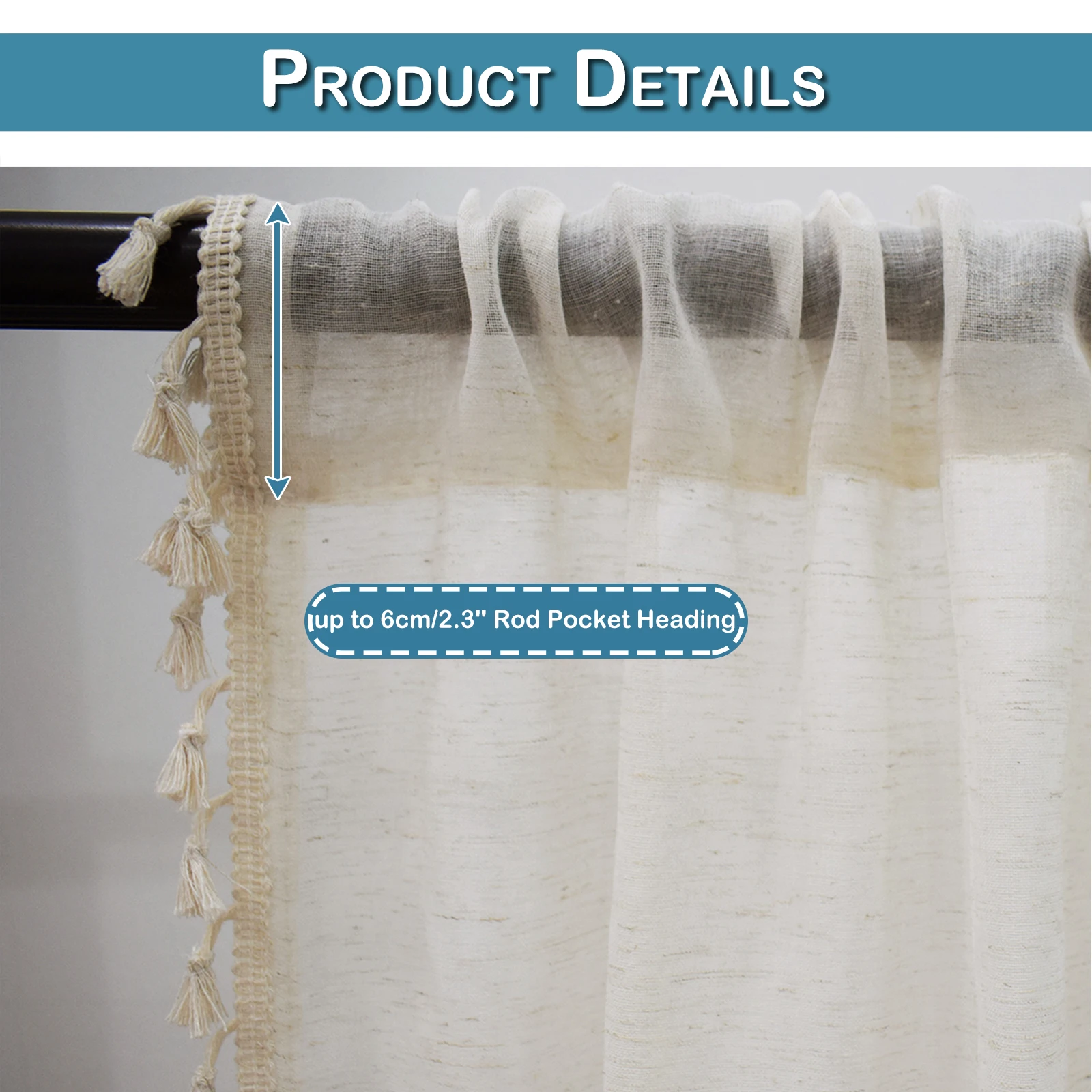 Crema; 26”*24” 2 pezzi/26”*30” 2 pezzi/26”*36” 2 pezzi/55”*18” 1 pezzo (dimensioni senza nappa); Intestazione tascabile con asta fino a 2,3” per ogni pannello;