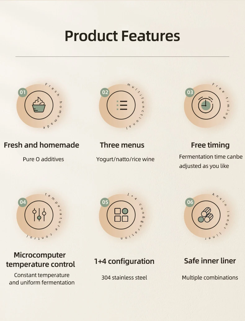 4、Sicurezza: Realizzato in PP alimentare, materiali in acciaio inossidabile 304 per la sicurezza alimentare, yogurt fatto in casa riduce gli additivi, fornire scelte più salutari.Con la yogurtiera, i yogurt artigianali che sono più di un solo delizioso, ogni cucchiaio creato nella yogurtiera è un passo verso bene.