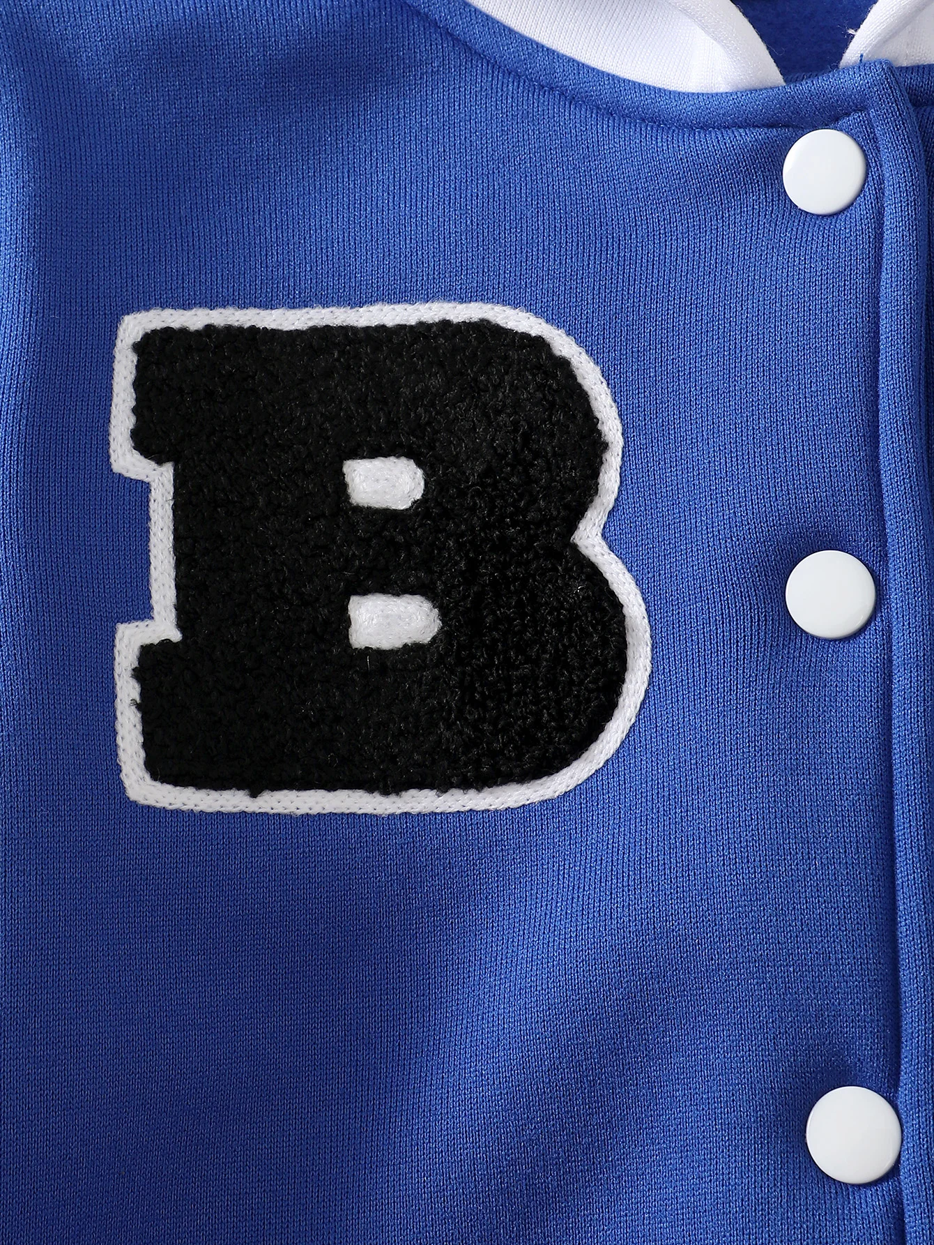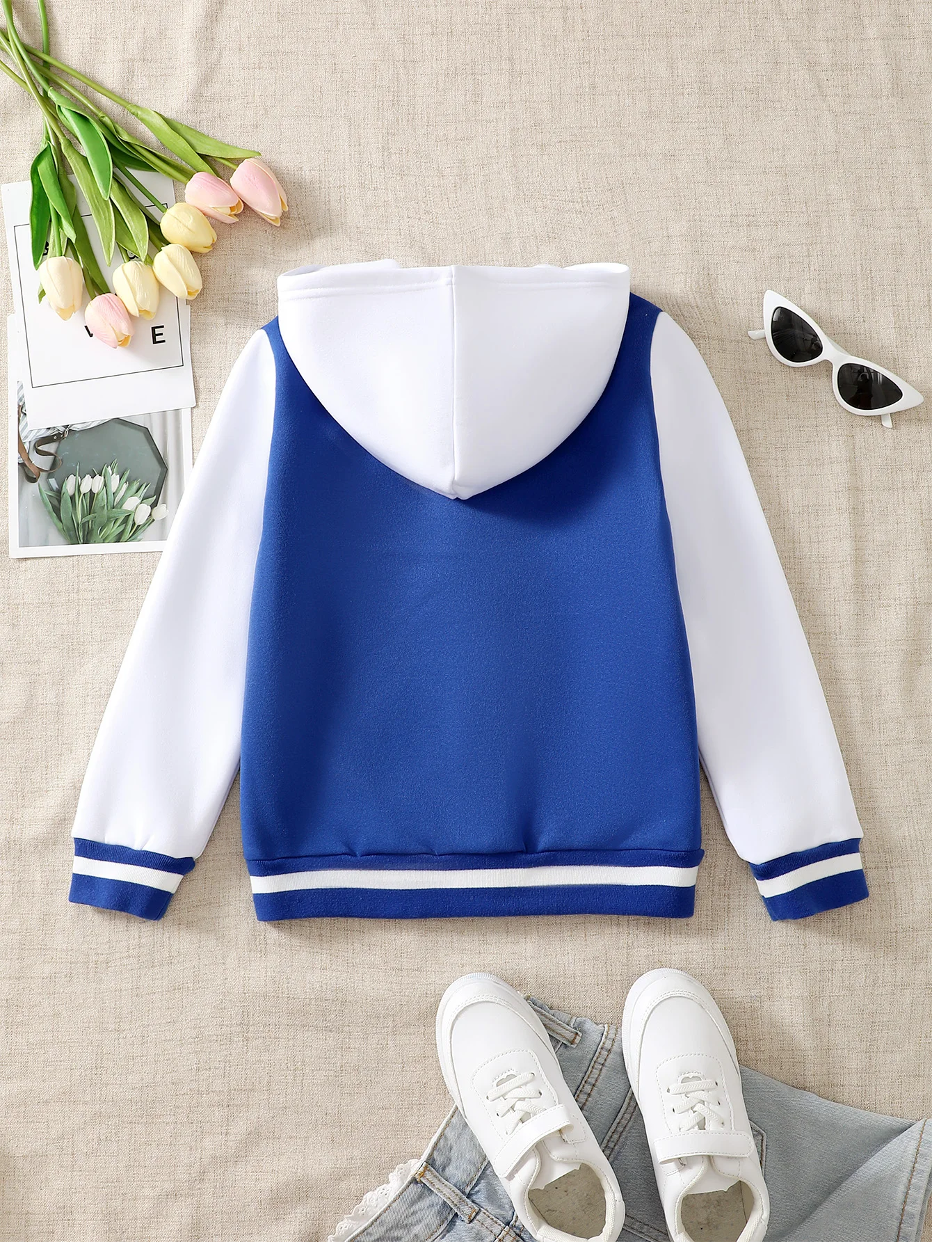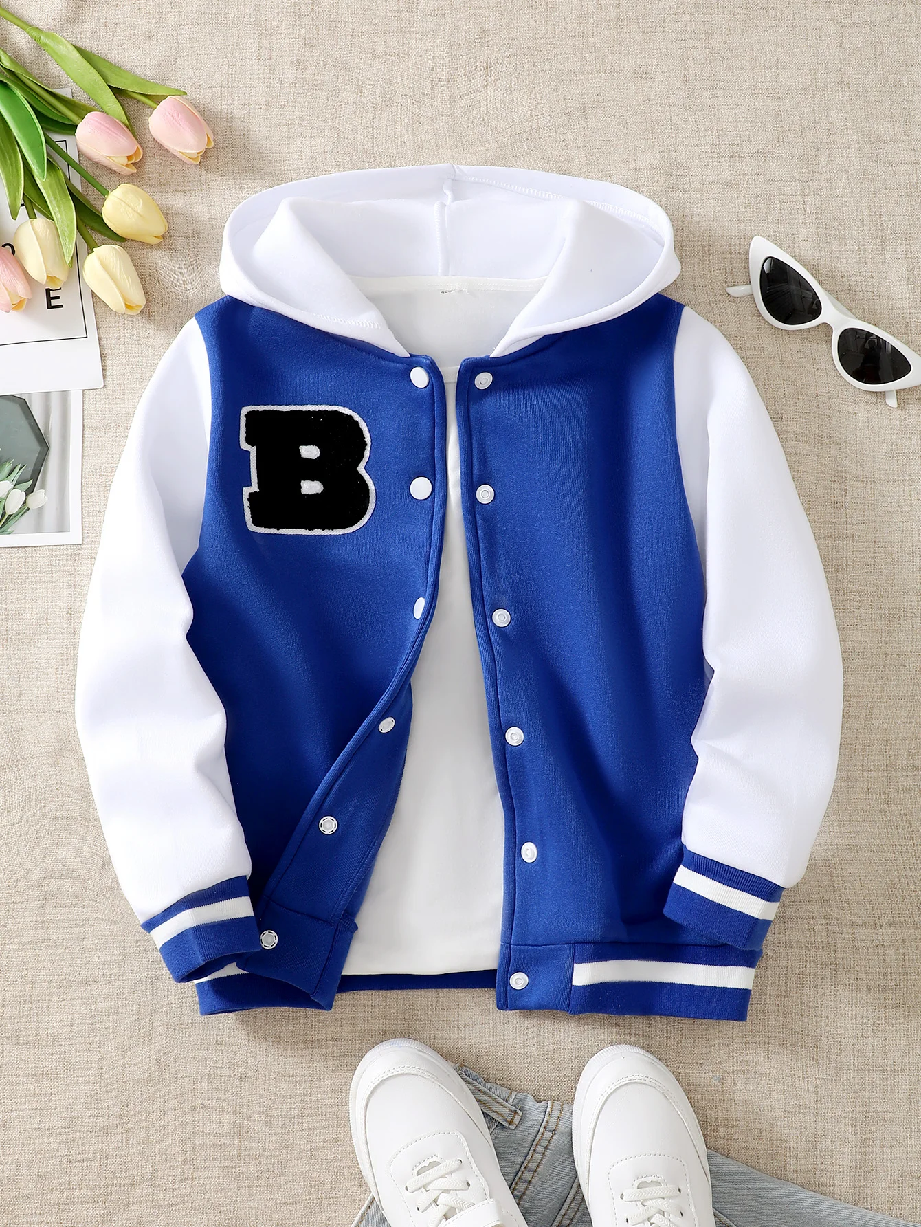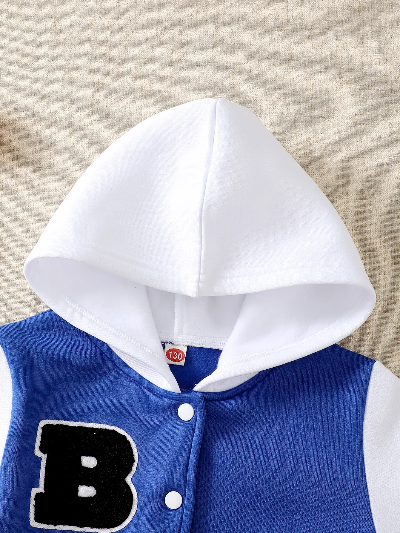 1 pezzo Tween Boy Giacca sportiva casual con cappuccio in pile colorblock con lettera ricamata, autunno/inverno