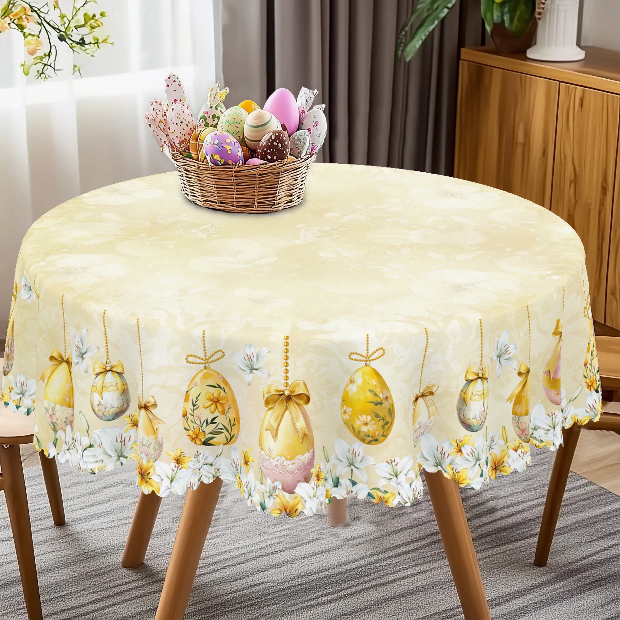 1 recensione per 1 Tovaglia rotonda pasquale, 5 misure disponibili, Tovaglia con stampa di uova d’oro tulipano, Processo di goffratura dei bordi, Decorazione tovaglia da giardino primaverile, Tovaglia per cucina domestica quotidiana, terrazza, Decorazione pasquale