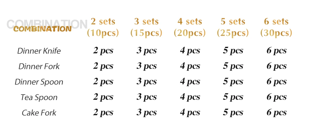 Materiale:Coltello da tavola: acciaio inossidabile 13-0 (420) Forchetta e cucchiaio: acciaio inossidabile 18-10 (304)
