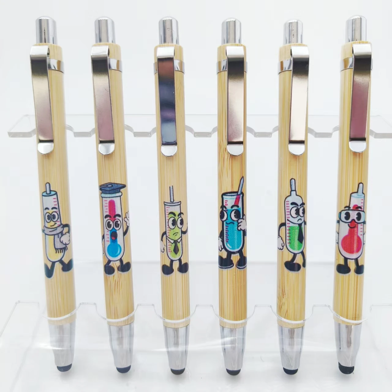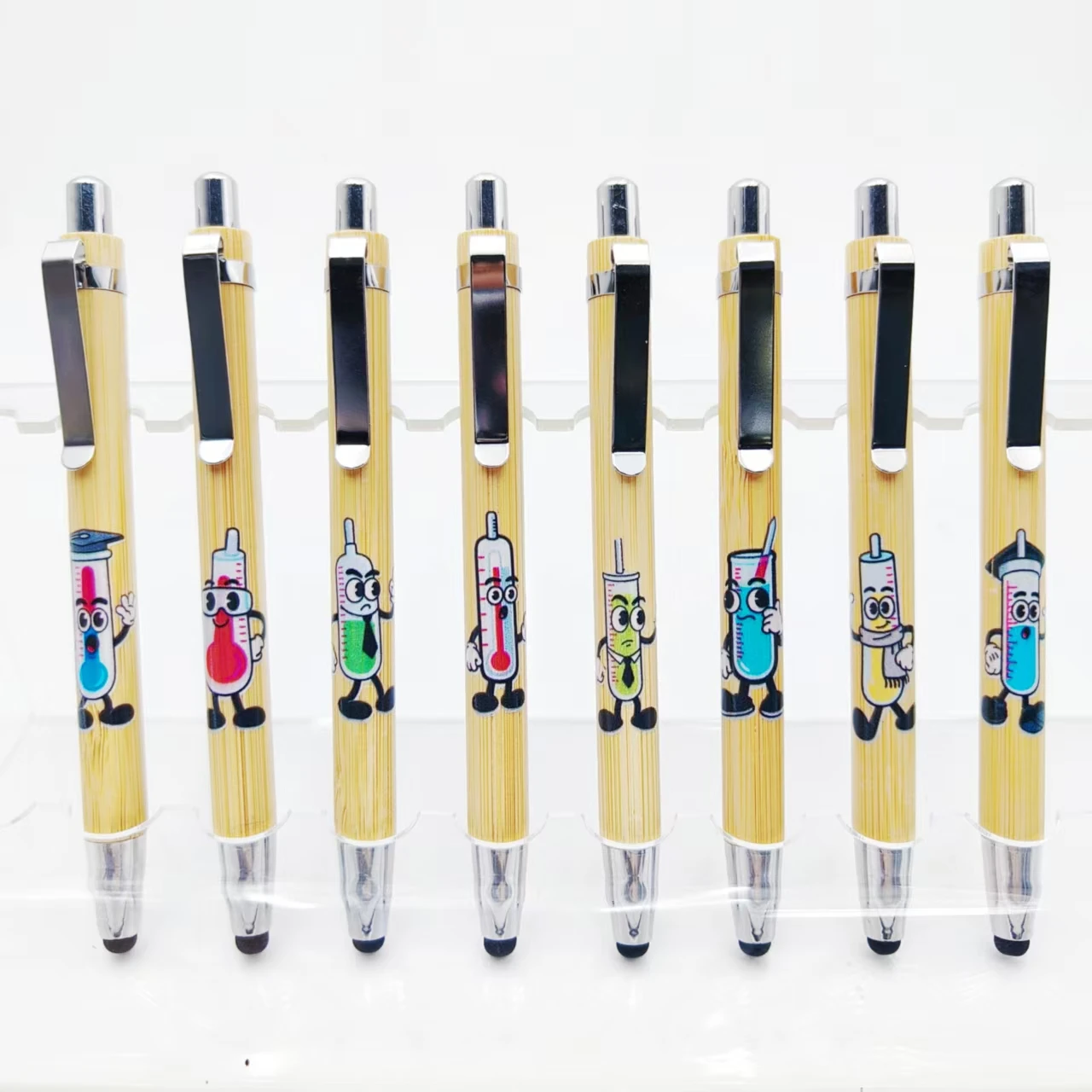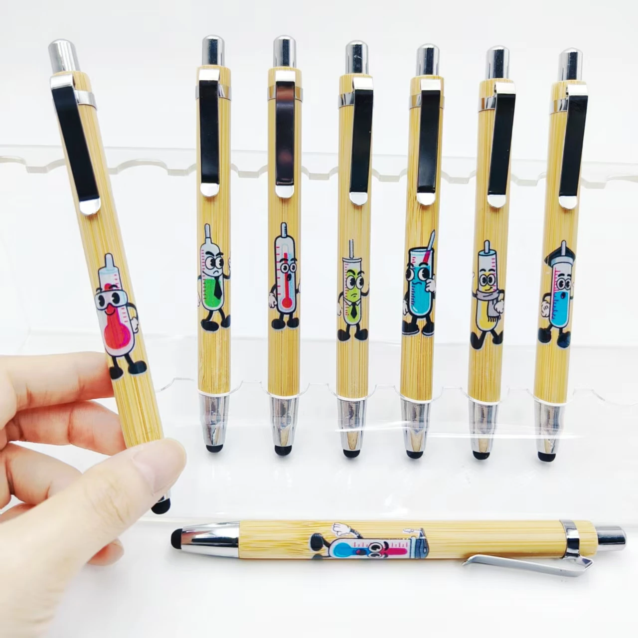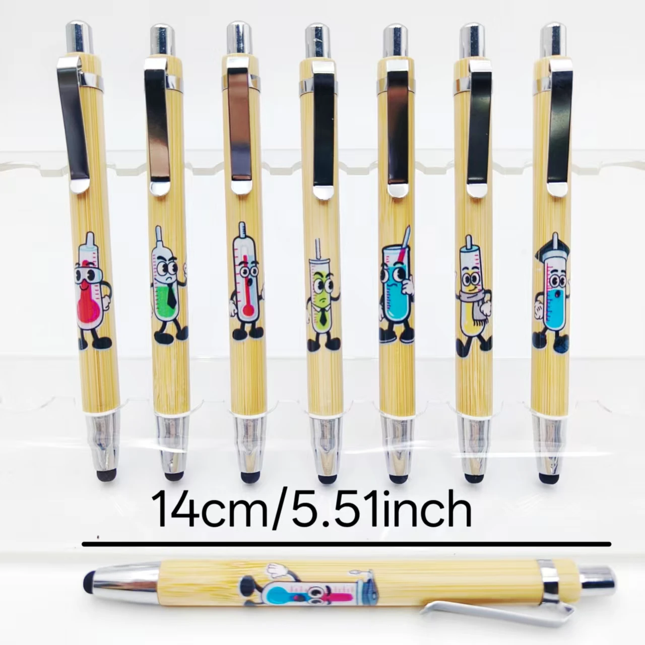 10 pz/15 pz laboratorio termometro antropomorfo modello penna di bambù regalo ufficio cancelleria touch screen penna a sfera aziendale