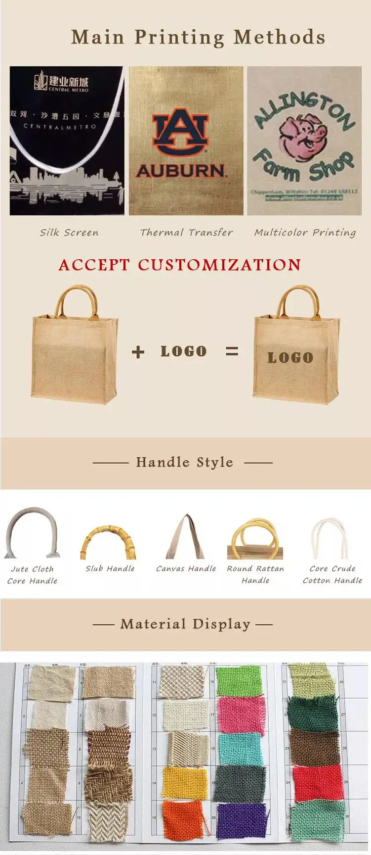 The price we showed in link is 1 color logo printed on 1 side for 100 pieces, include shipping.Custom shopping bags Material:Jute. MOQ: Normally 100-1000pcs each size,according to your logo Production lead time: Normally about 10days to produce,about 7-12days to arrive you after delivery,also according to quantity. Order steps: