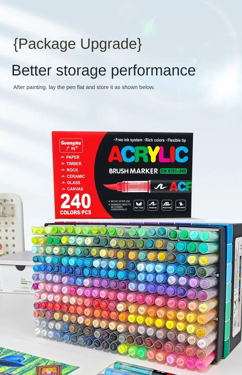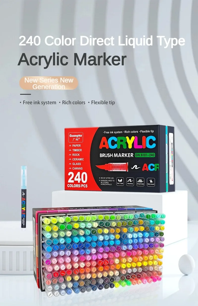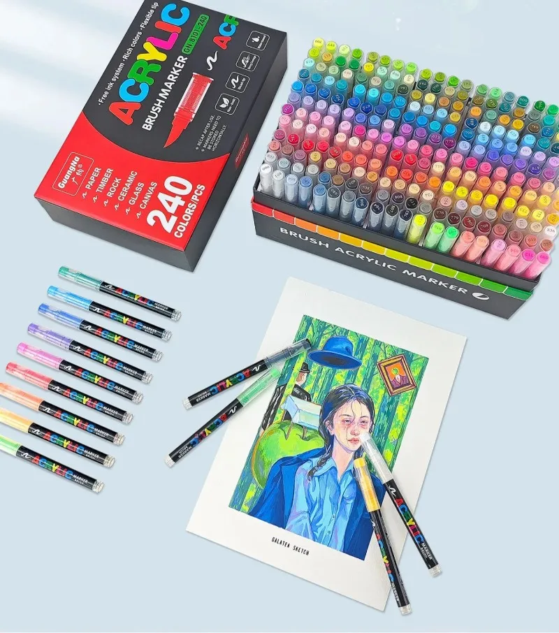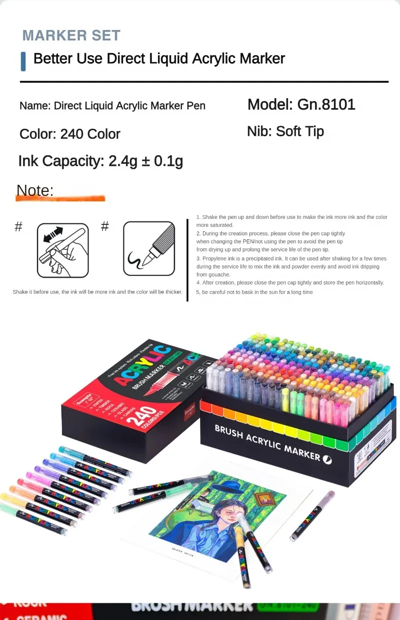 240-12 Colors Direct-liquid Acrylic Marker Waterproof Soft Brush Tip Color Layering Pen for Metal Glass Art Supplies Stationary