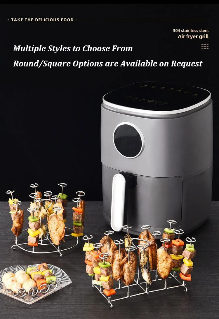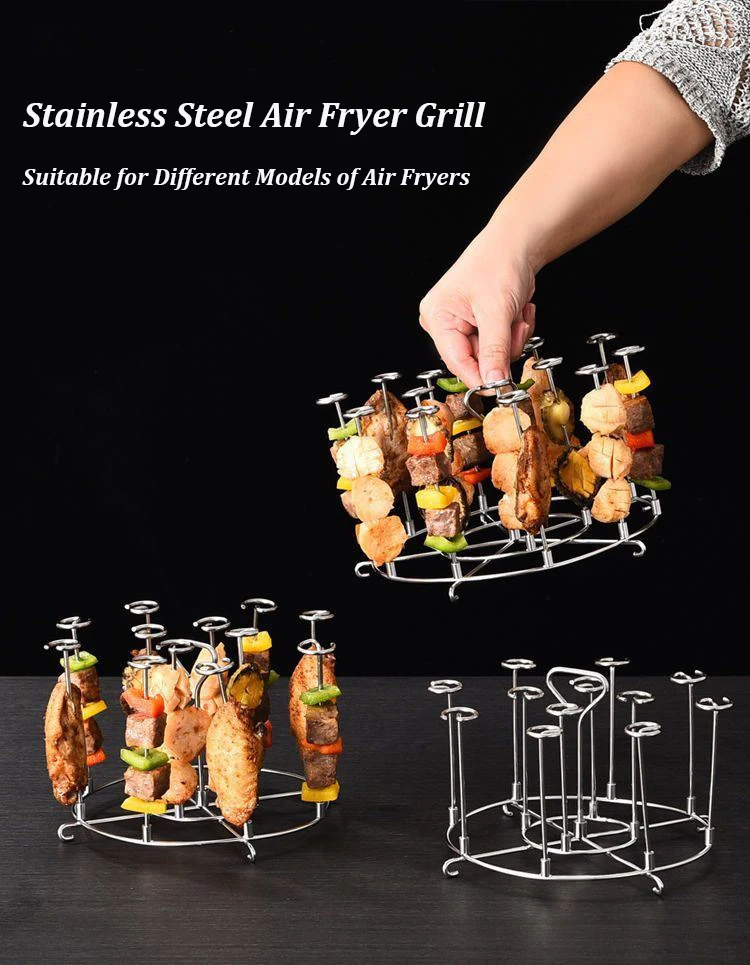 Presentazione della versatile griglia per friggitrice ad aria, disponibile in due misure e accompagnata da un set di 12 spiedini da forno.Realizzato in acciaio inossidabile 304 di alta qualità, questo griglia durevole e resistente al calore garantisce sicurezza in ogni utilizzo.Il suo innovativo design verticale consente il posizionamento diretto nella friggitrice ad aria, offre comodità e semplicità in cucina.