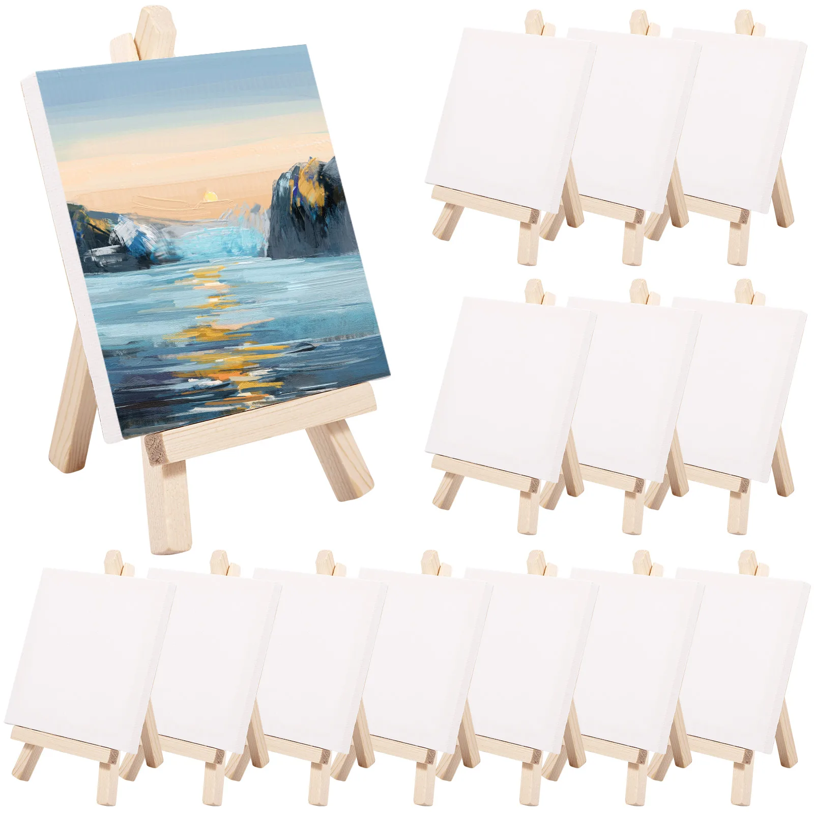 Parts List:14 x Small Easel with CanvasHighlight Description:[Wooden Mini Easel Set] Our painting set includes 14pcs mini easels with canvas, plenty of quantity to meet your use and replacement needs.[Reliable Canvas] Our mini painting canvas is made of cotton with acid-free primer for quick painting, the canvas is stable with a flexible surface, allowing you to enjoy a smooth and enjoyable painting experience.[Foldable Easel] Easel size is 8x15cm, canvas size is 10 x 10cm, easy to hold and paint, lightweight and foldable, easy to carry to classrooms, art clubs, painting studios, painting events and more.[Enjoy the Fun of Painting] Mini canvas painting set is suitable for children, painting beginners and amateurs, help them practice painting, improve their skills and enjoy the fun of painting. Can be used as gifts, rewards, painting classes and school art project supplies.[Multi-Purpose] Our art easels and art canvases are suitable for many occasions, it is a reasonable choice for displaying small paintings, crafts, miniatures, children’s artwork, photos, business cards, beautiful pictures, suitable for children’s art activities, parties, holidays, weddings, family.Specification:Product name: Mini Canvas Painting KitMaterial: wood, cottonSize: Easel 8 x 15cmCanvas: 10 x 10cmNotes:1. There may be slight differences between the picture and the actual color of the commodity. We will try our best to show you the exact color.2. Please allow slight dimension difference due to manual measurement.